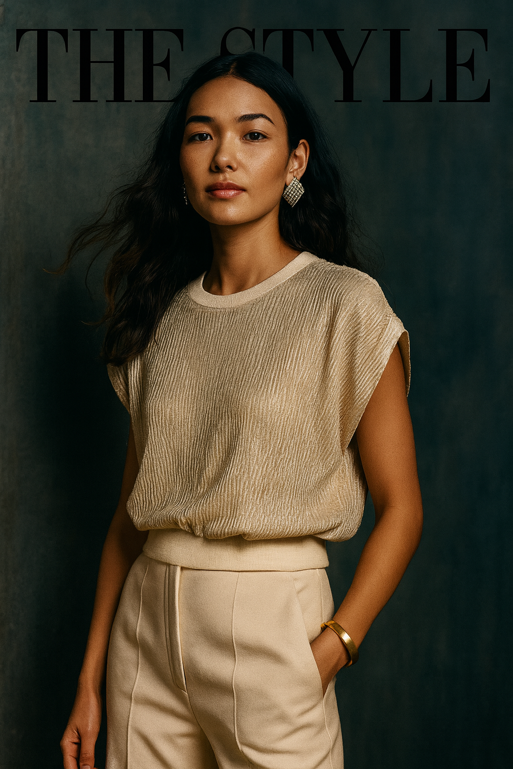 Discover our top Alizée in its new material for the holiday season. Short-sleeved shiny T-shirt: - thick borders on the collar and hips - round neck - wide straps covering the shoulders - elastic band at the waist