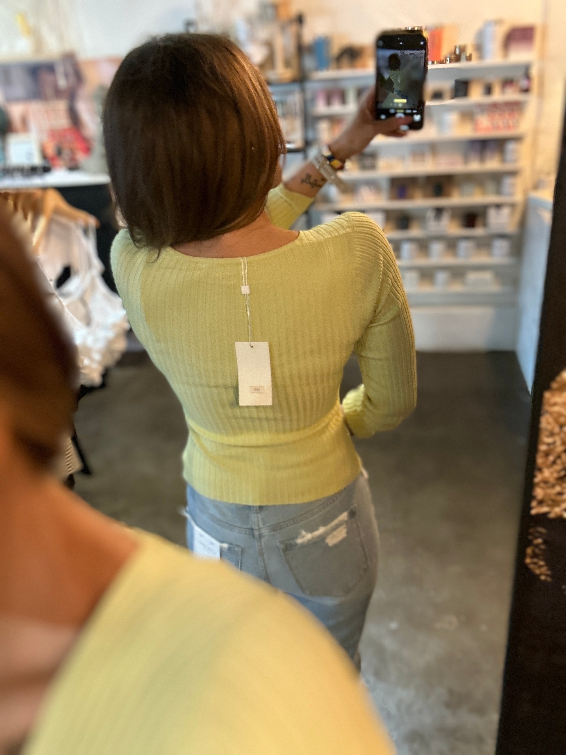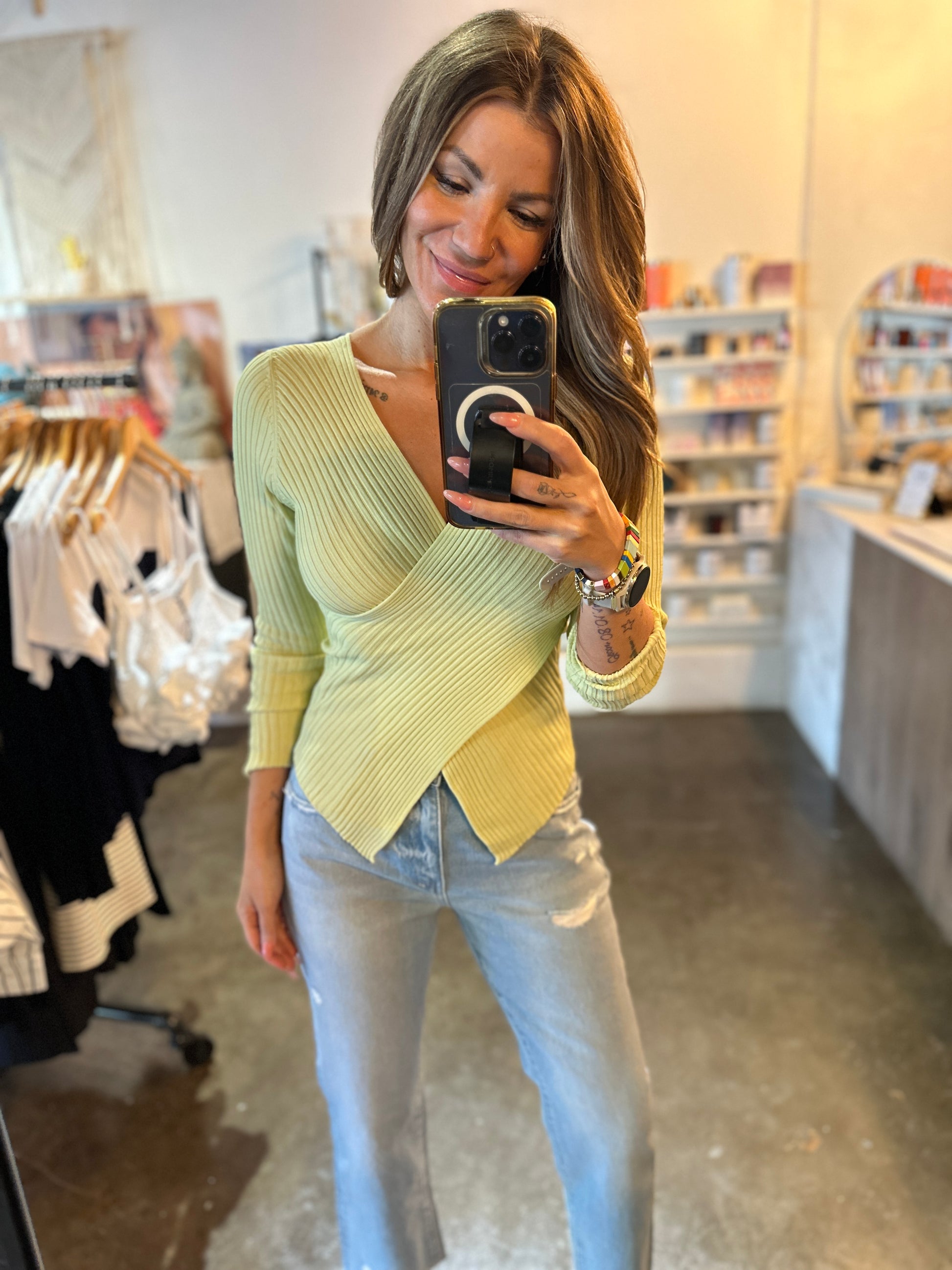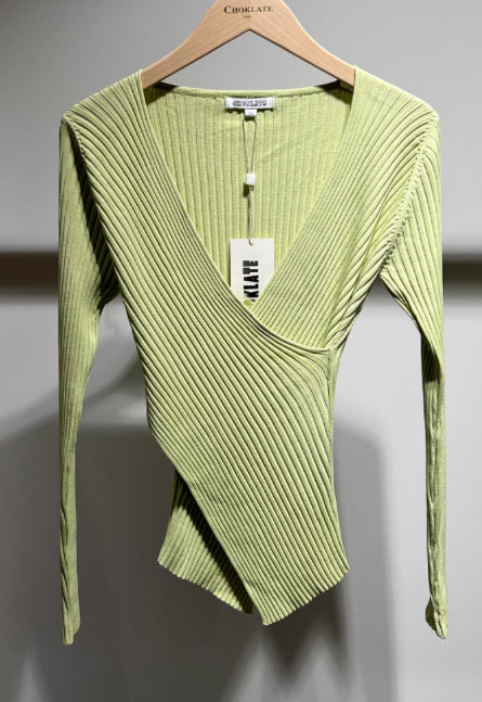 Stretch Ribbed knit crossover top with a deep V neck and asymmetric front hem. This is a one size fits most (small through large)