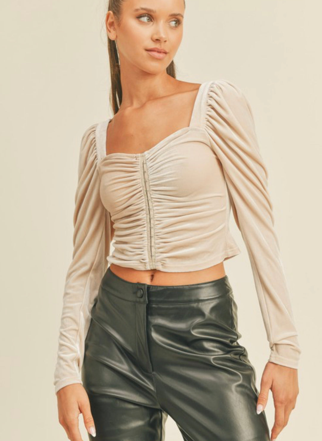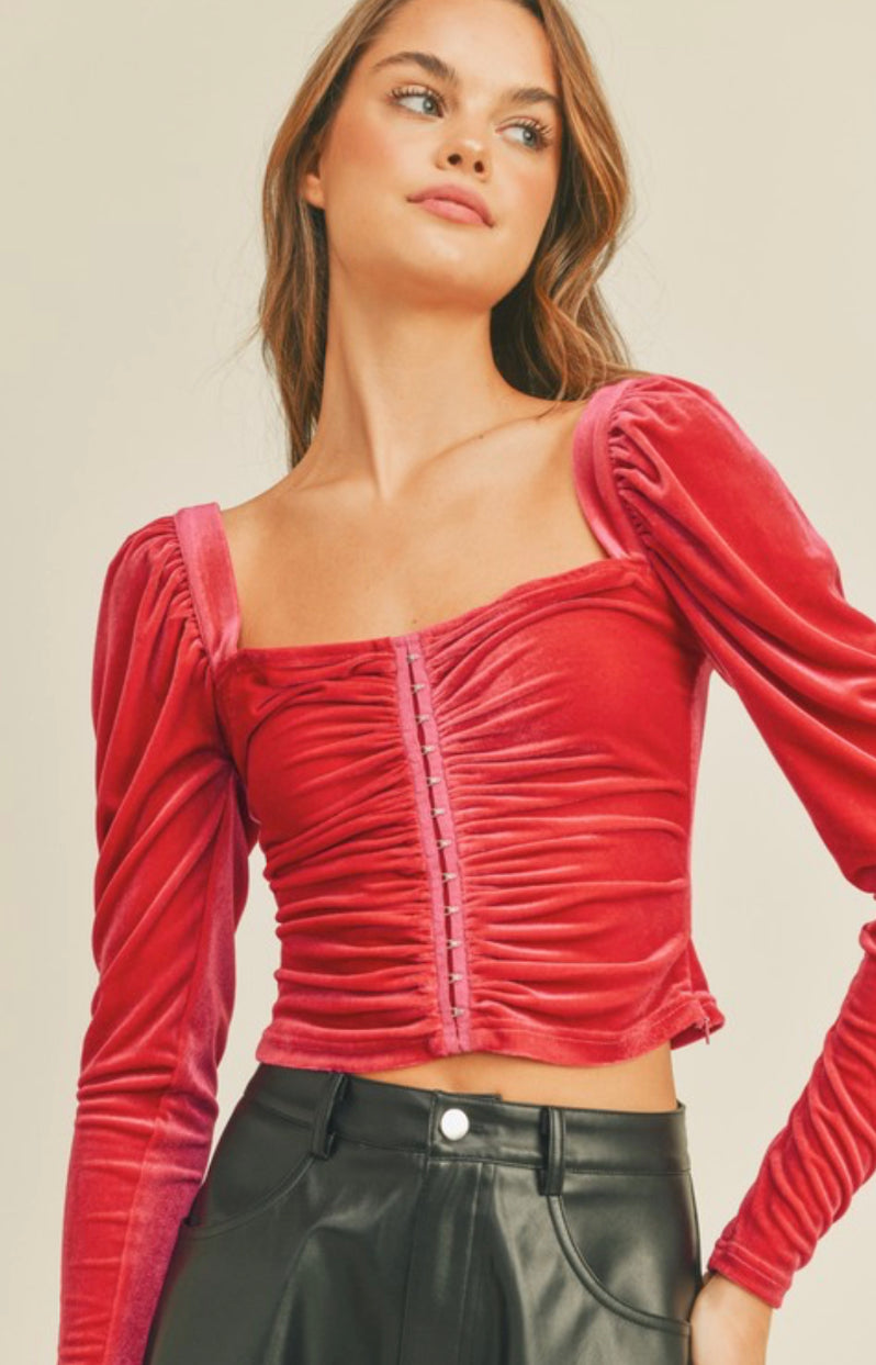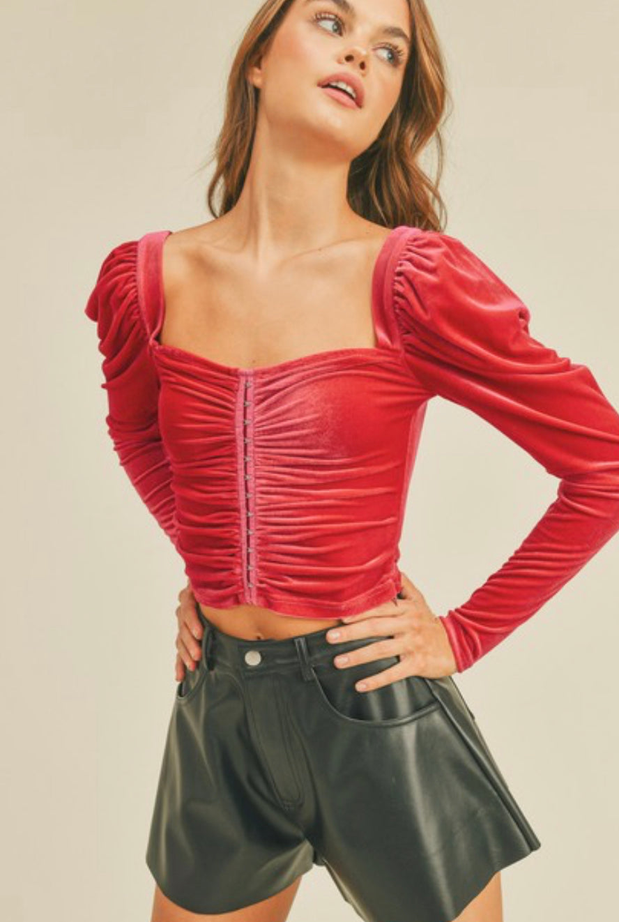 This ruched velvet bustier style top features hook and eye front closure, square neckline and stretch.