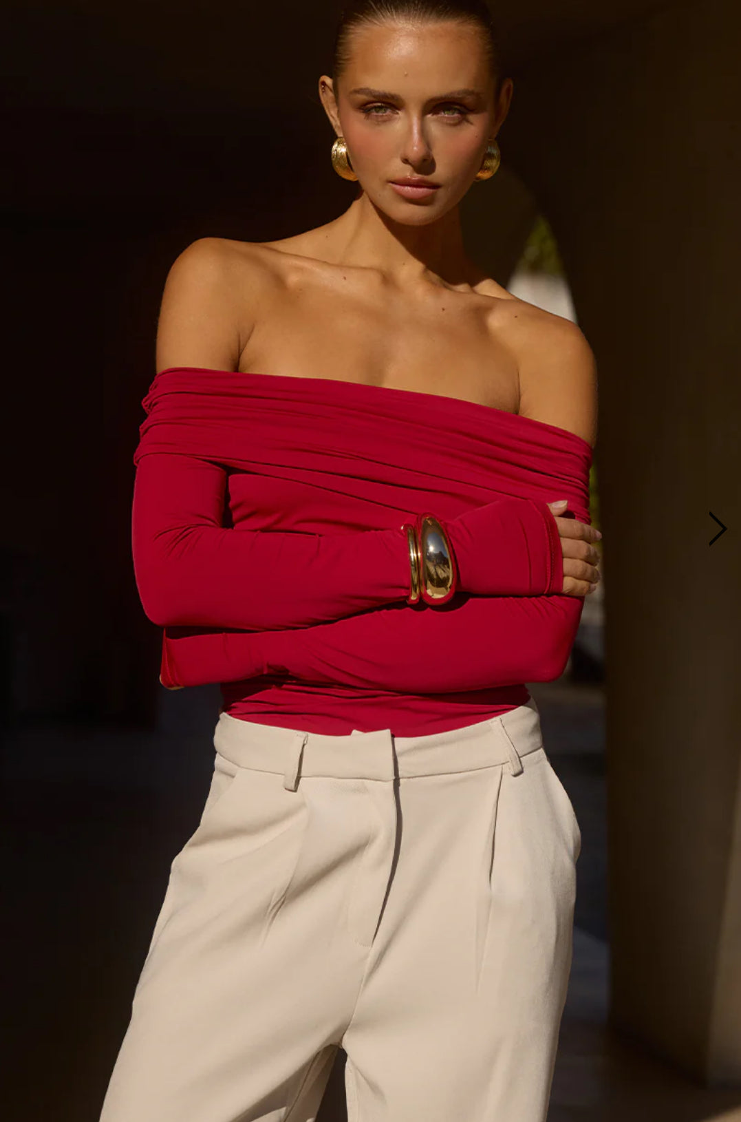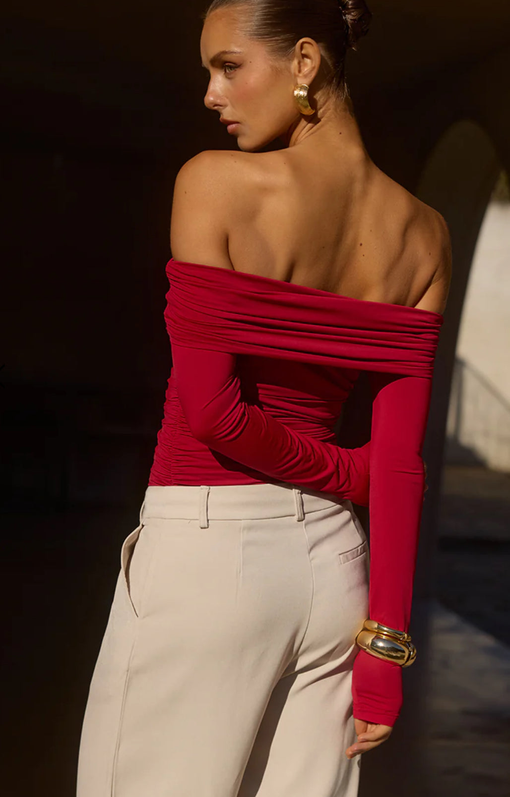 Our Azura Top features an off the shoulder neckline with ruching at the sides for a sleek feminine look, match this with our Zarriah Pant for the complete look. - Off the shoulder neckline