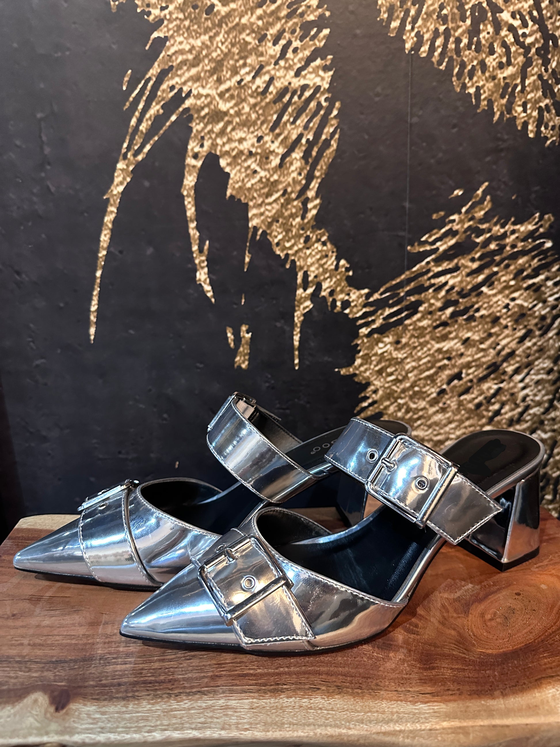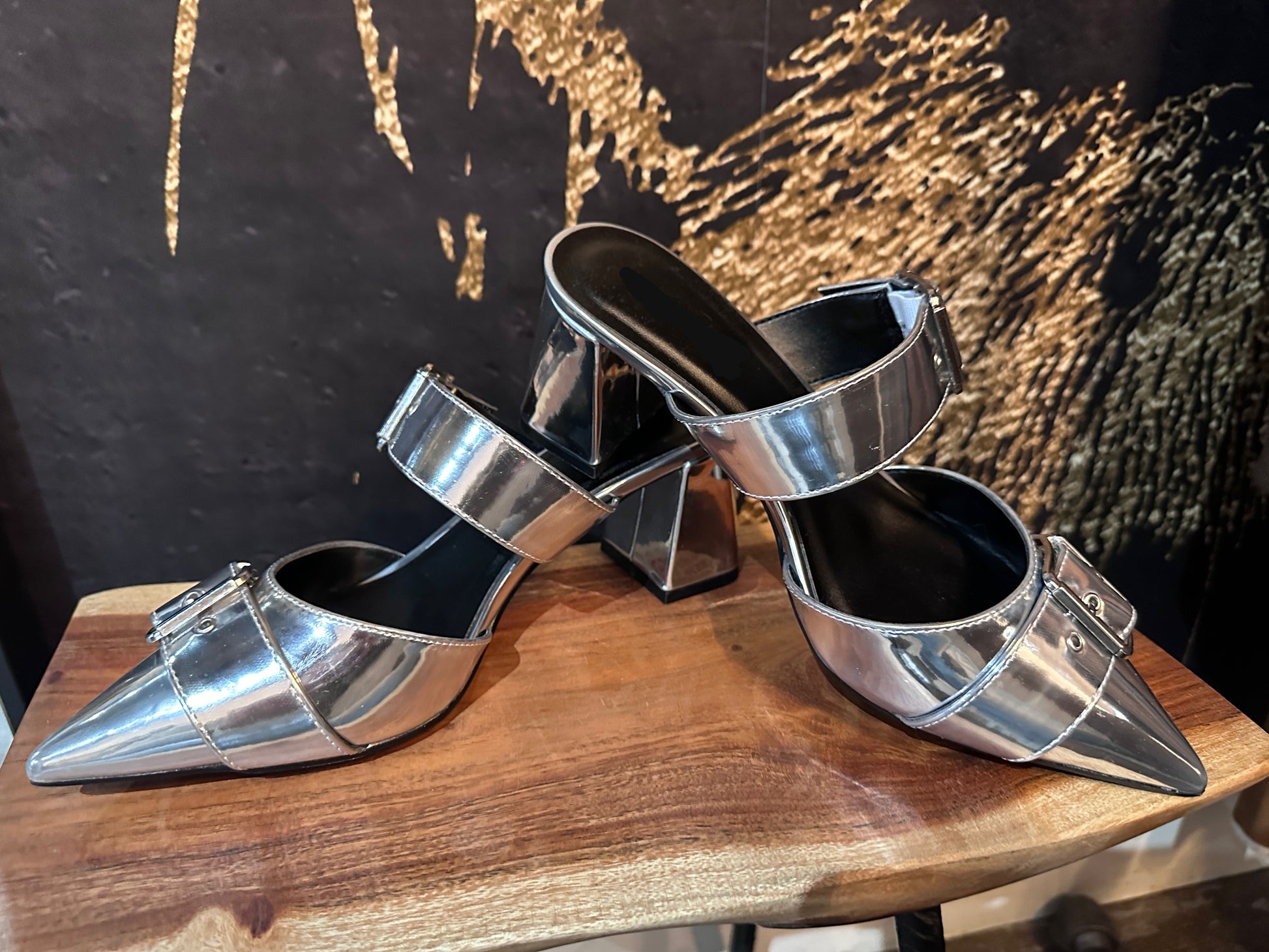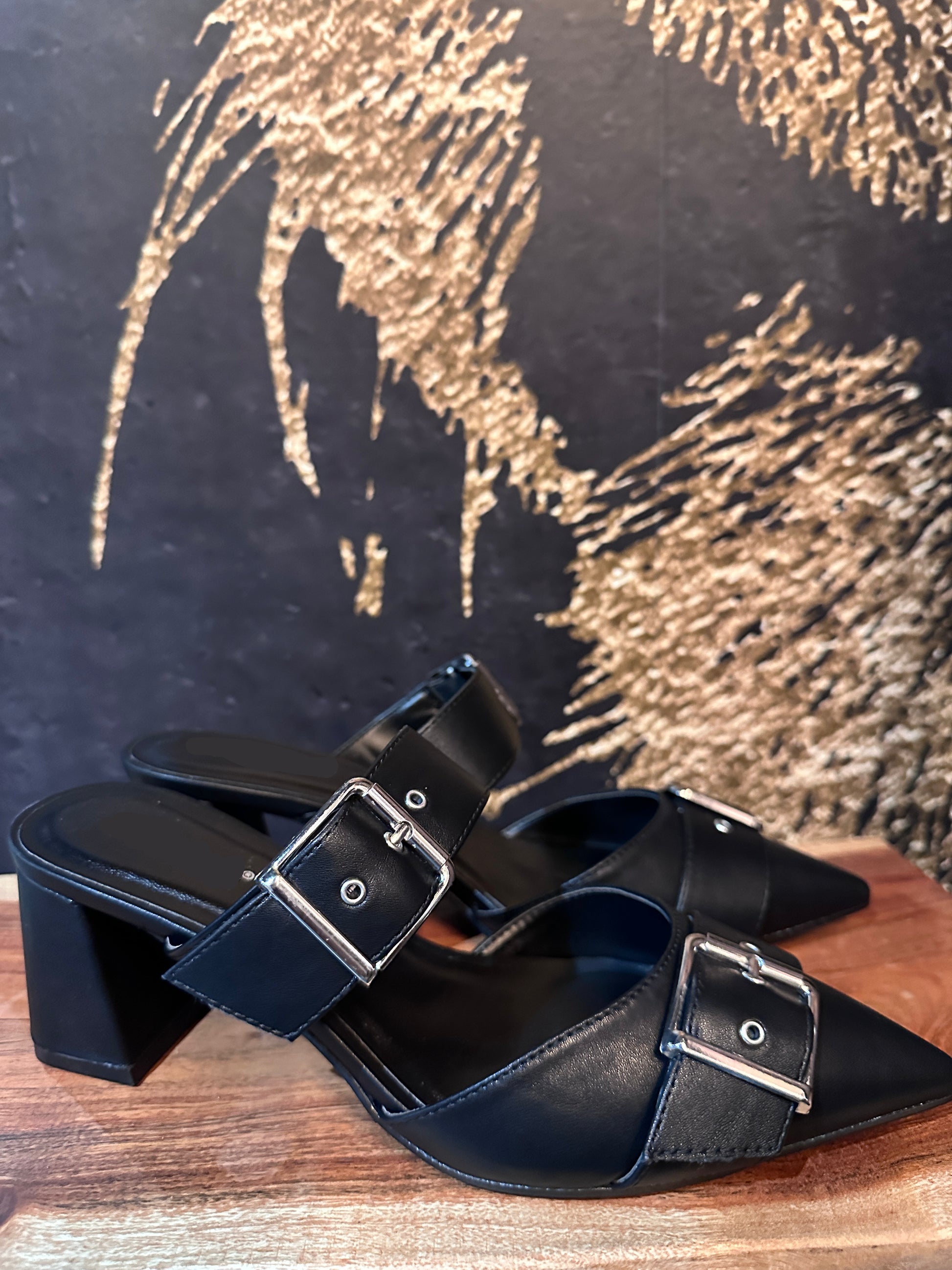 Gorgeous double buckle pointed toe mule with padded insole and block heel… where comfort meets edge.