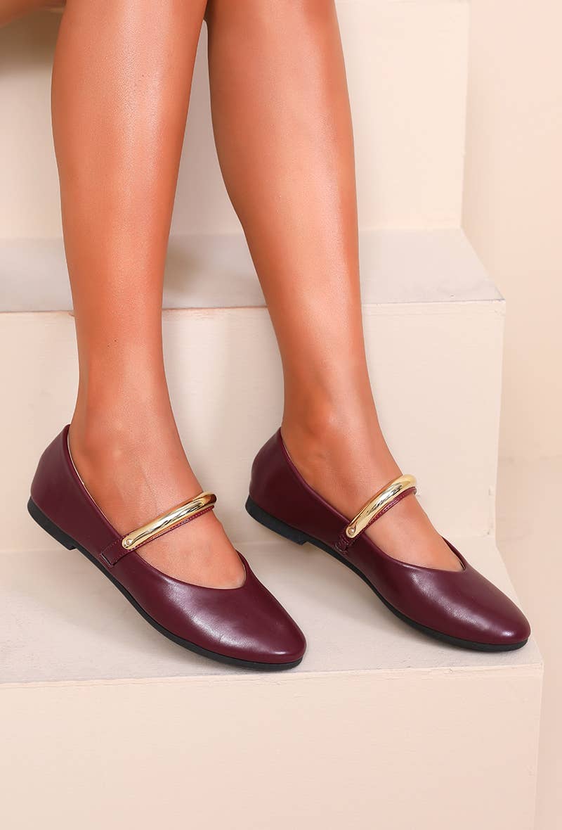 Slip into refined elegance with these burgundy Mary Jane flats, where classic charm meets modern sophistication. Crafted from smooth, supple faux leather, they feature a sleek almond toe and a striking gold-tone bar strap that elevates the timeless silhouette.