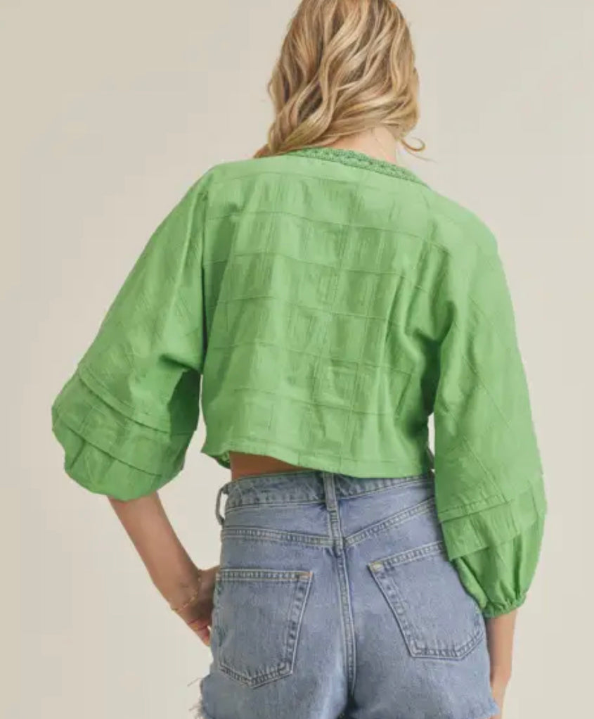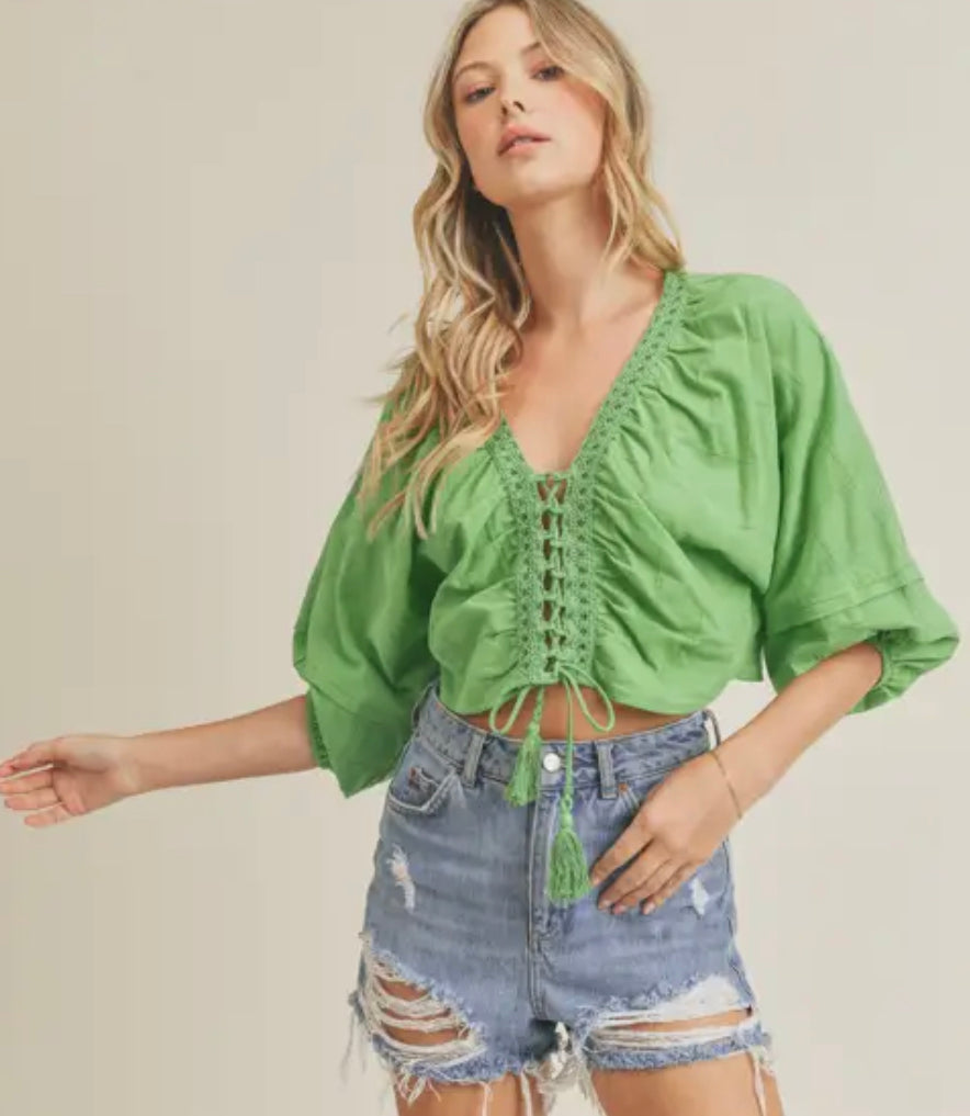 Lace Up Crochet Trim Blouse -3/4 balloon sleeves -Crop fit Care instruction: HAND WASH COLD, DO NOT BLEACH, LINE DRY, IRON LOW IF NEEDED, DO NOT TUMBLE DRY