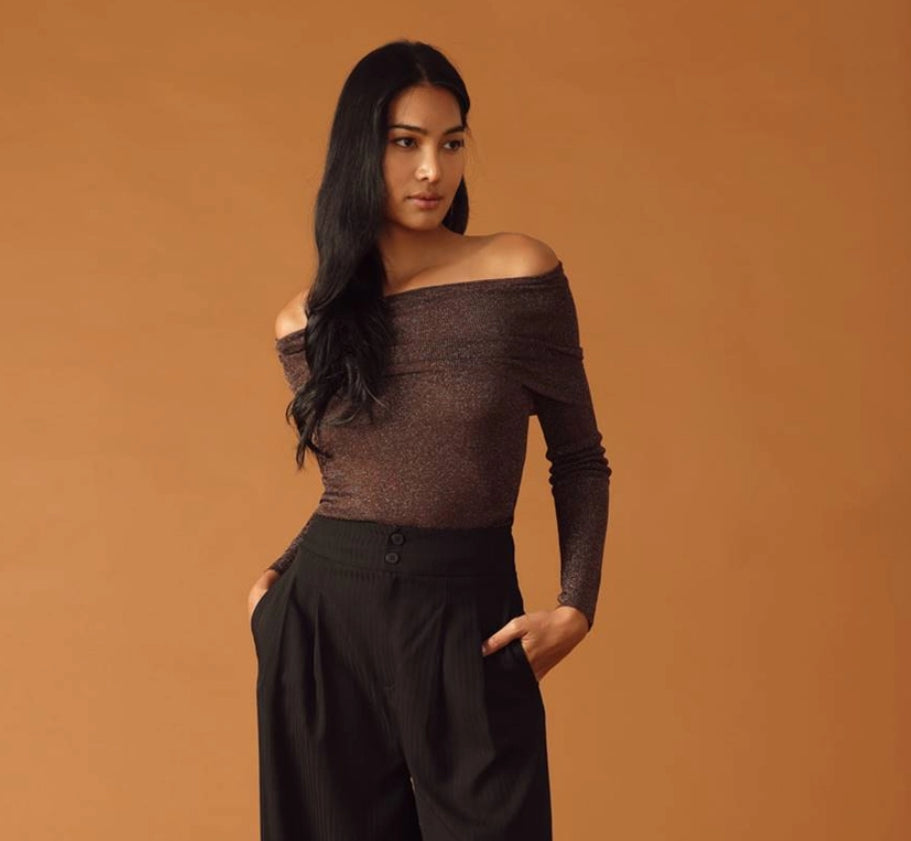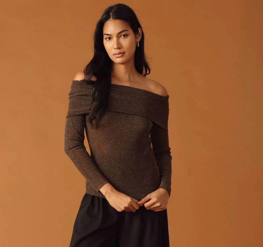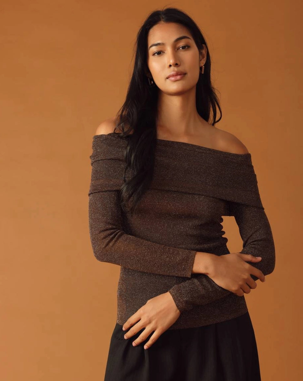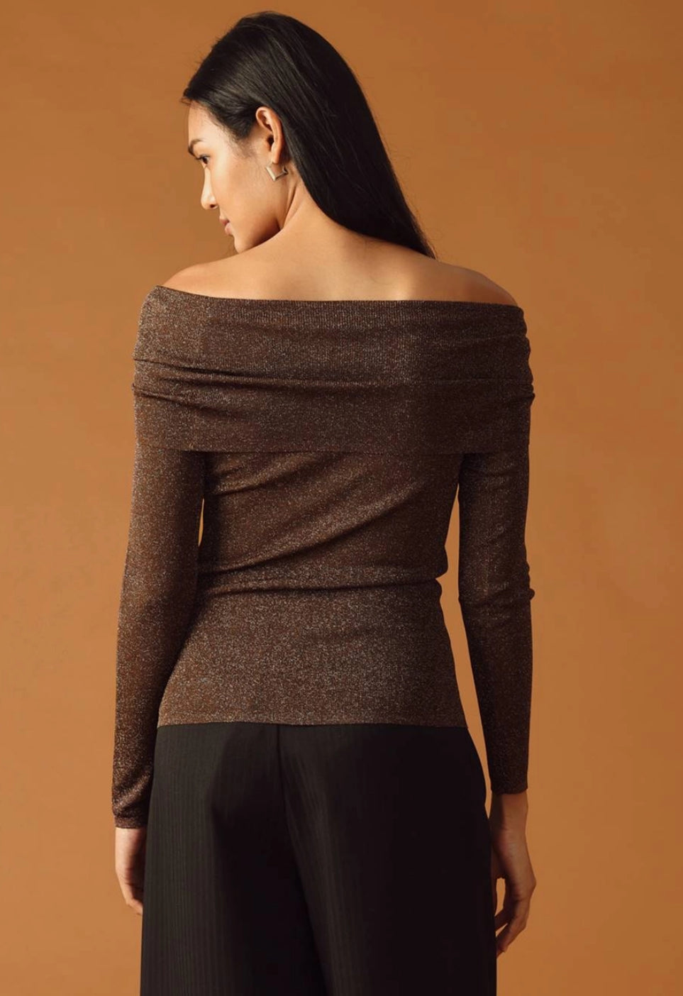 Delicate semi sheer knit blouse with subtle metallic sparkle.