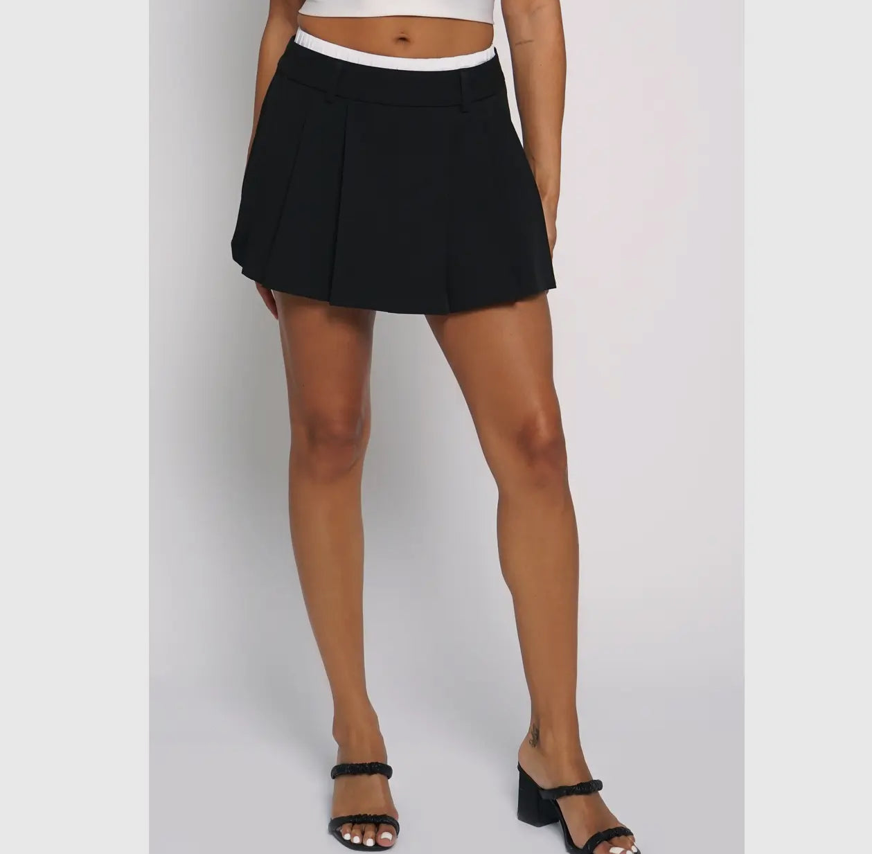 - 79% Polyester, 15% Rayon, 6% Spandex, Contrast 100% Cotton - Woven - Exposed boxer waistband - Pleated front - Mini length - Invisible zipper closure at side