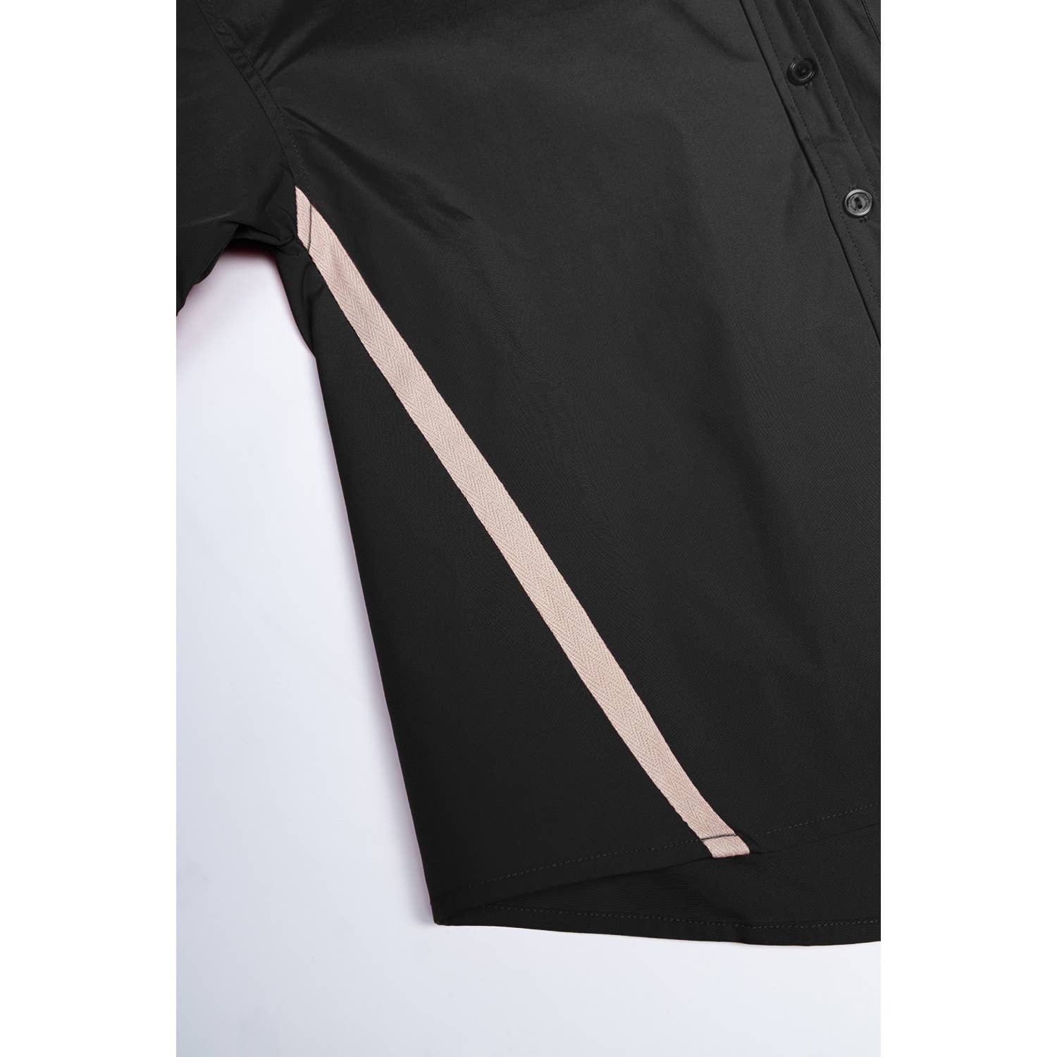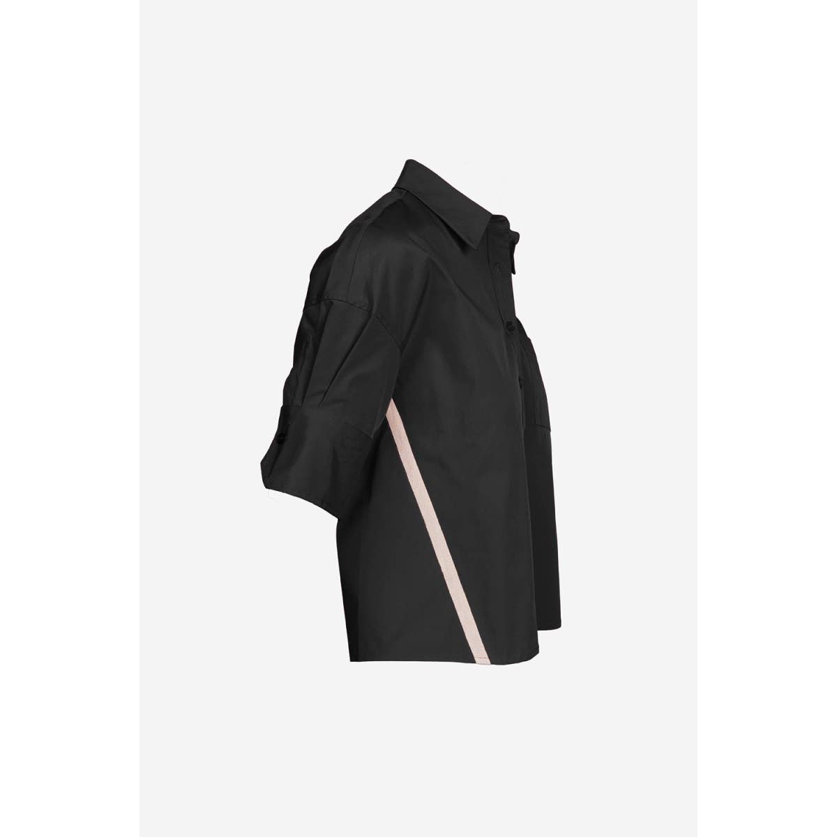 *Women's Boxy Half Sleeve Button Up Blouse With Stripe Accents Structured woven tafetta fabric that holds its shape. Pleated half sleeves secured by button for subtle volume. Short, boxy length creates a modern silhouette. Stripe accents add a crisp, elevated finish. Style with tailored pants for the office or pair with denim for effortless chic.