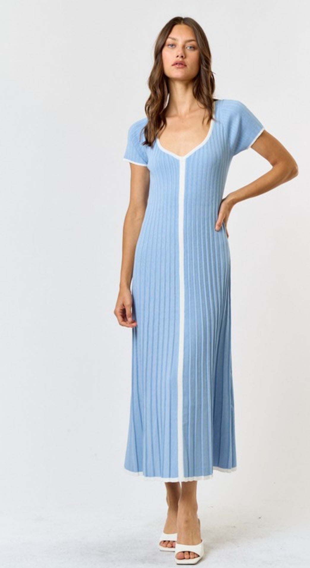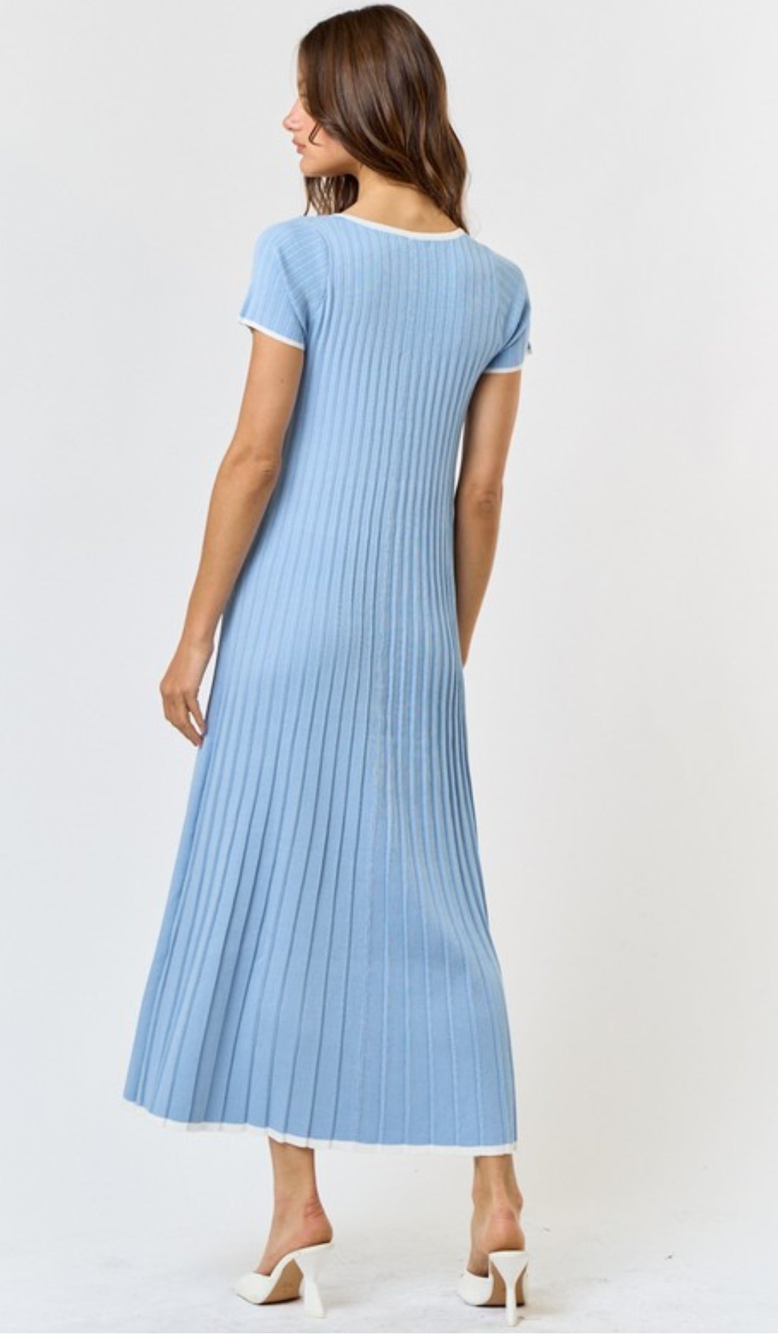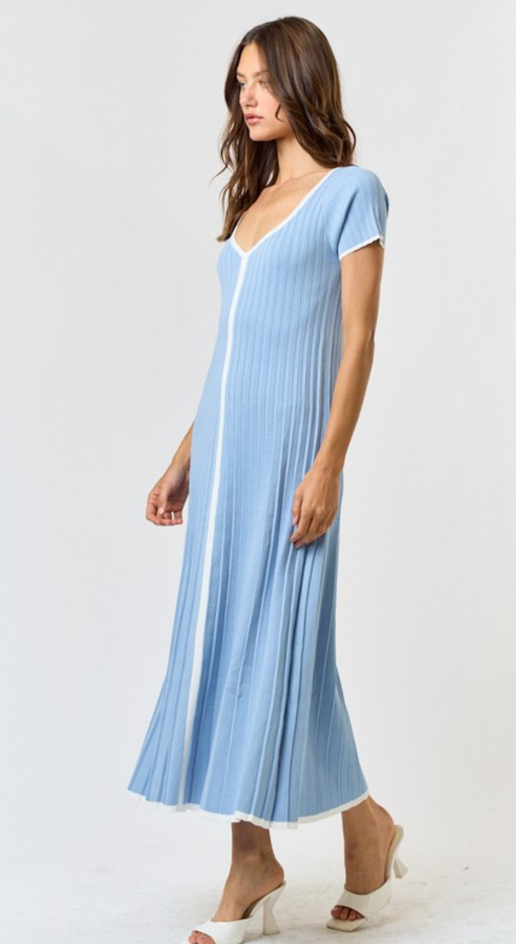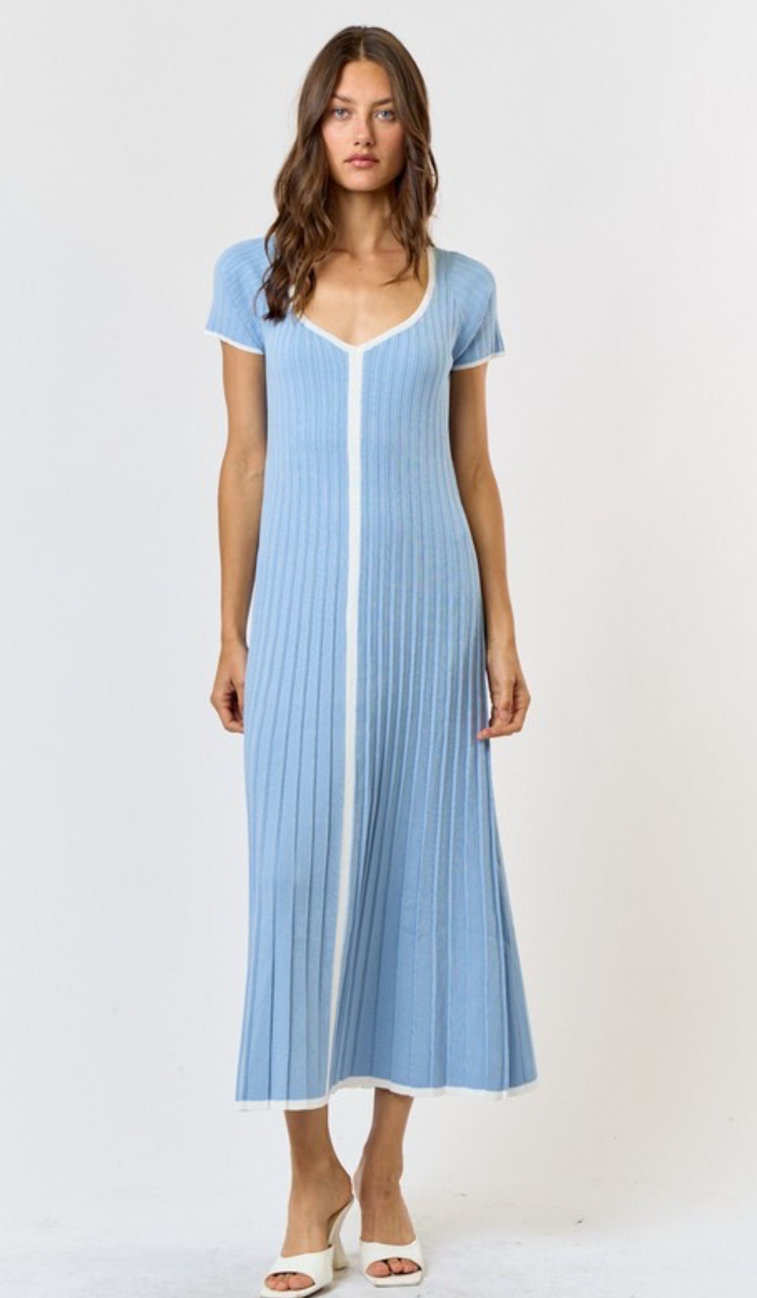 Contrast binding knit dress features a subtle A line pleated skirt and squared sweetheart neckline.