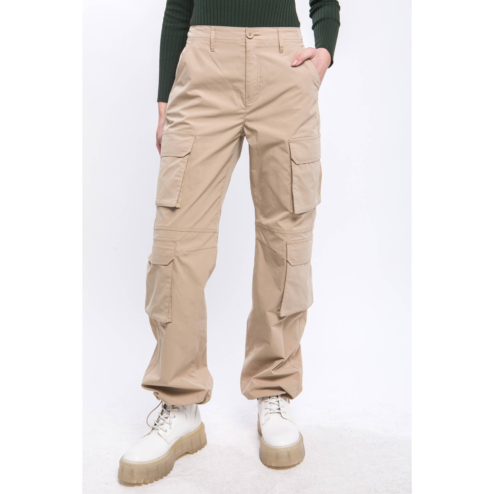 The perfect Cargo Pants With Button Closure & Multiple Pockets. Bungee cord ankles to draw leg in, elastic at back waist. Flat panel zipper front. True to size.