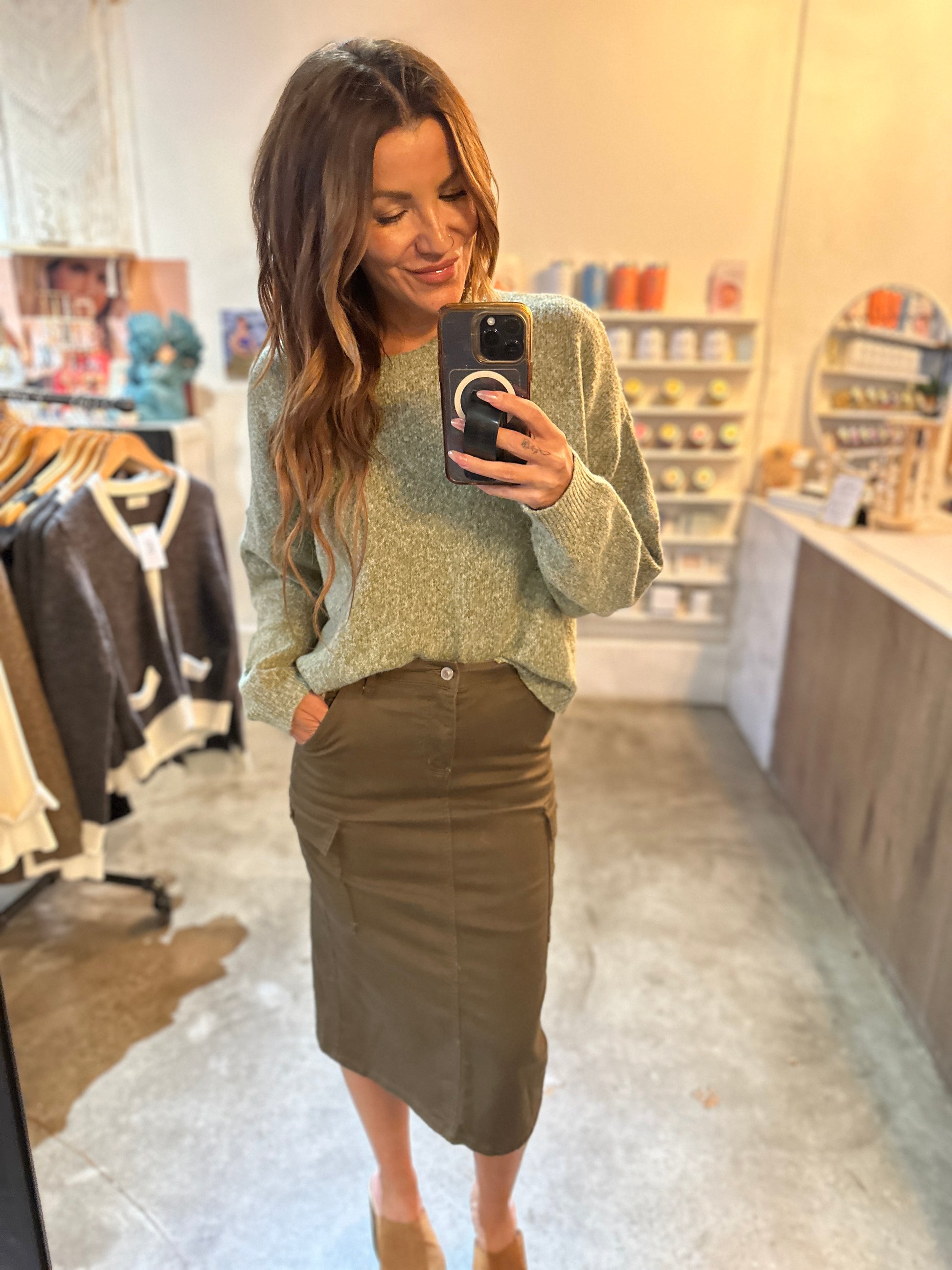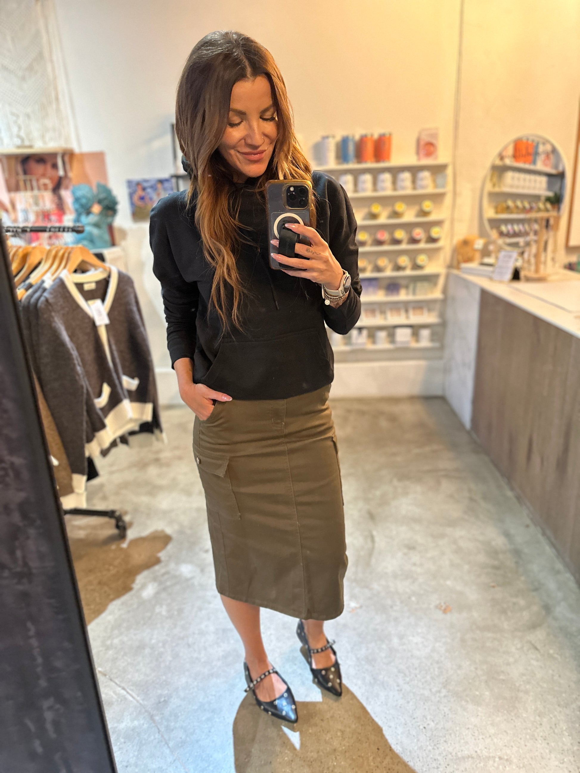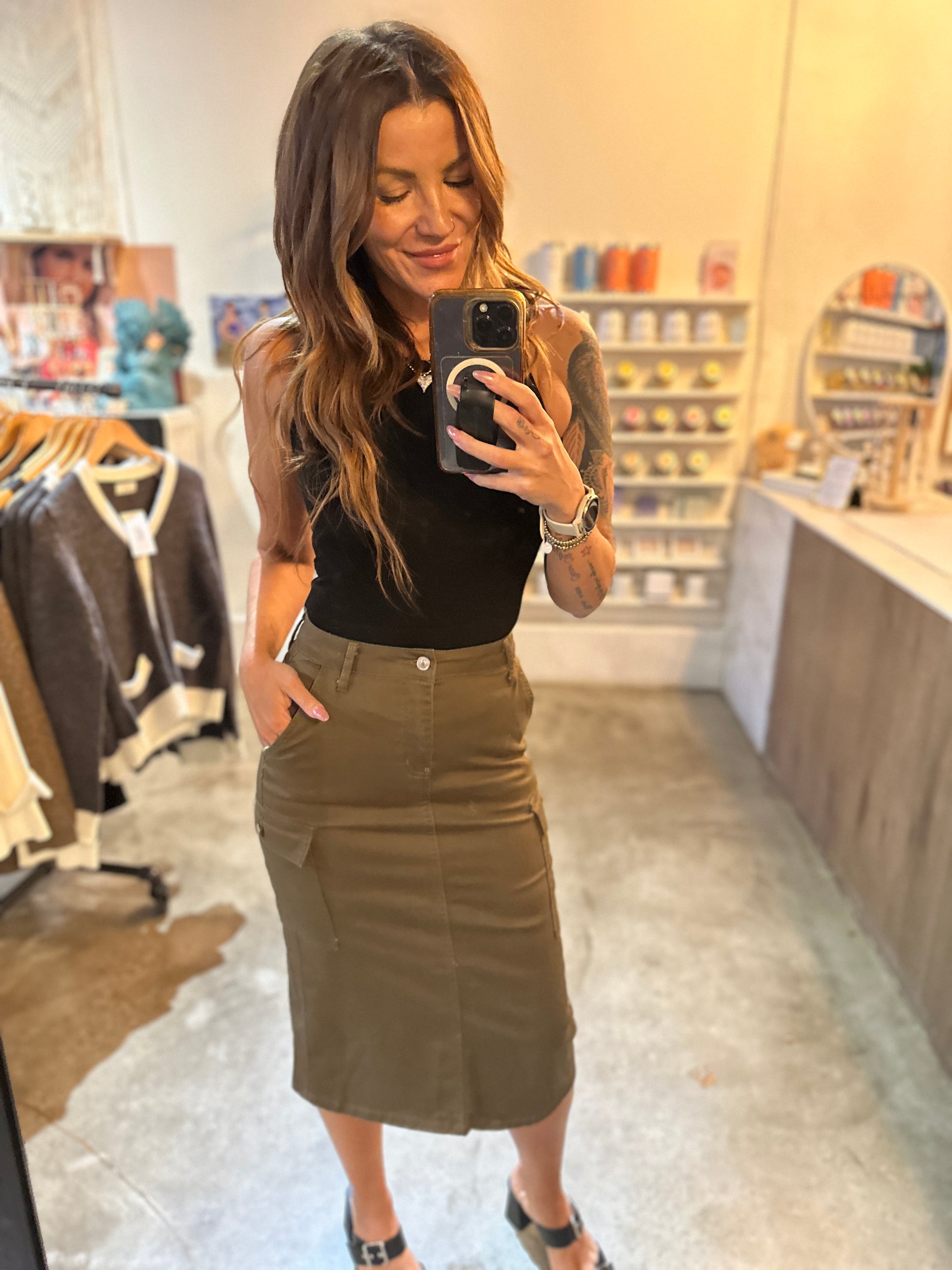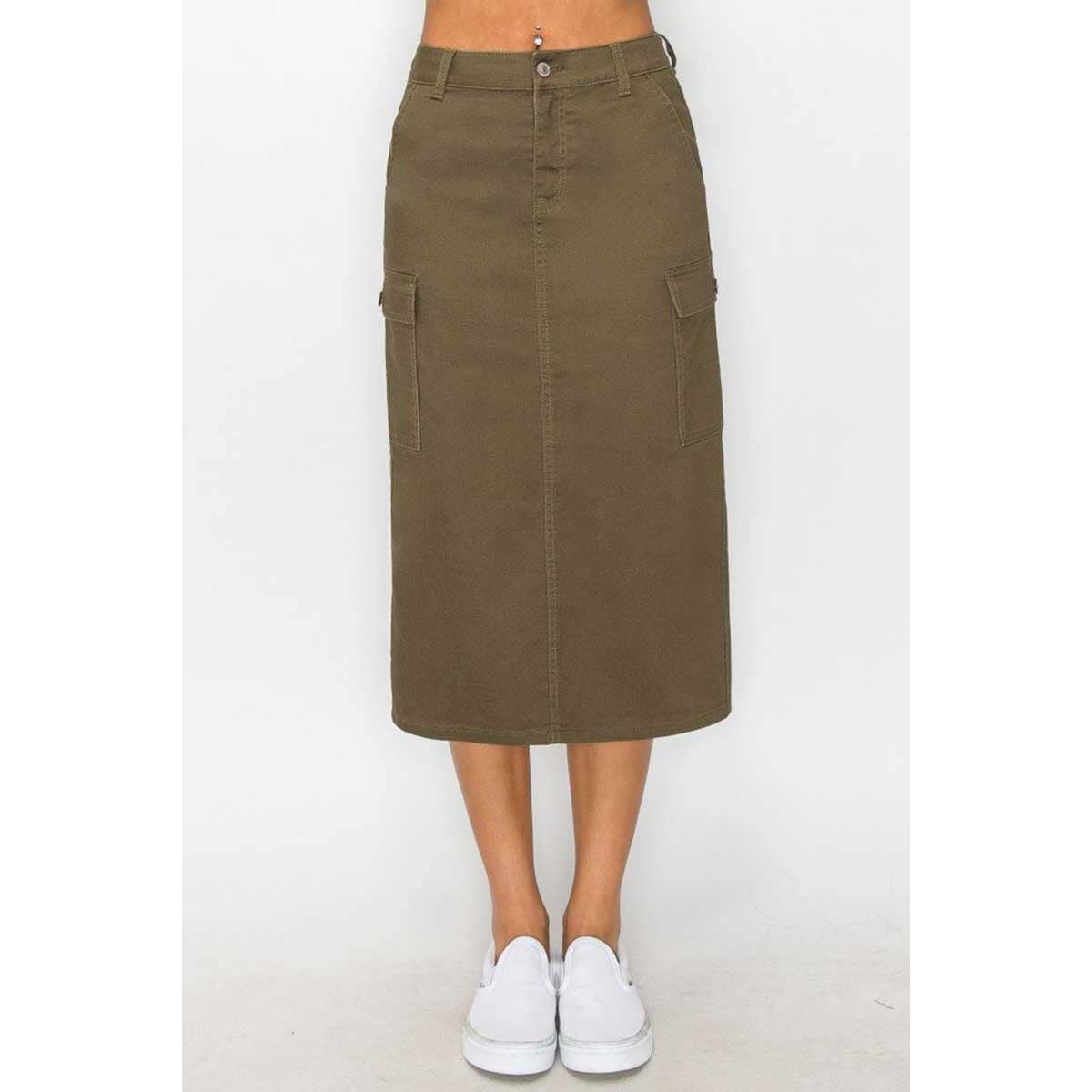 CARGO POCKET TWILL MAXI SKIRT back slit 67% Cotton 27% Polyester 3% Viscose 3% Spandex