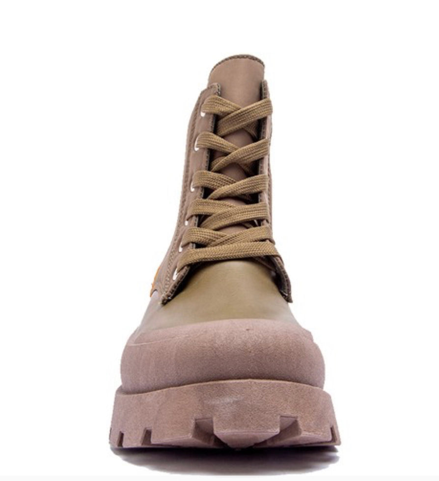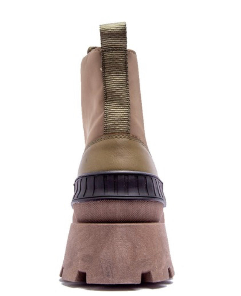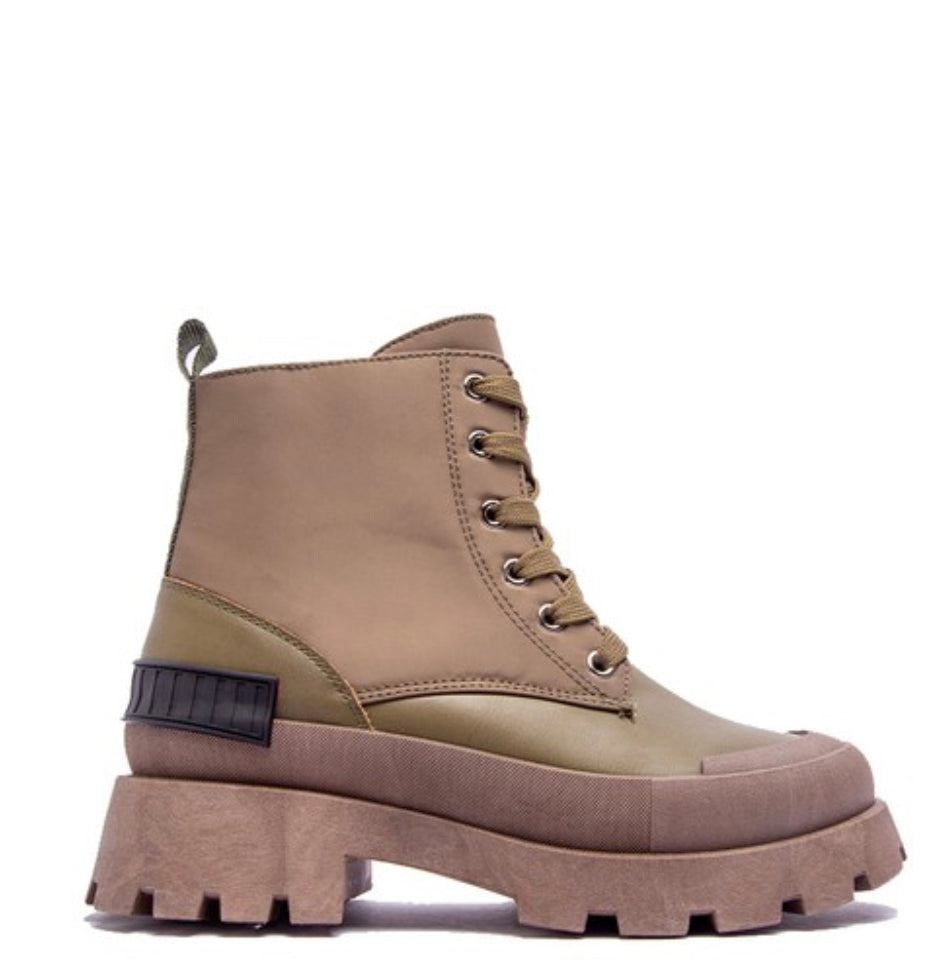 This mixed material boot features a taupe lug sole, vegan leather base and nylon upper. A combat style with lace up front.