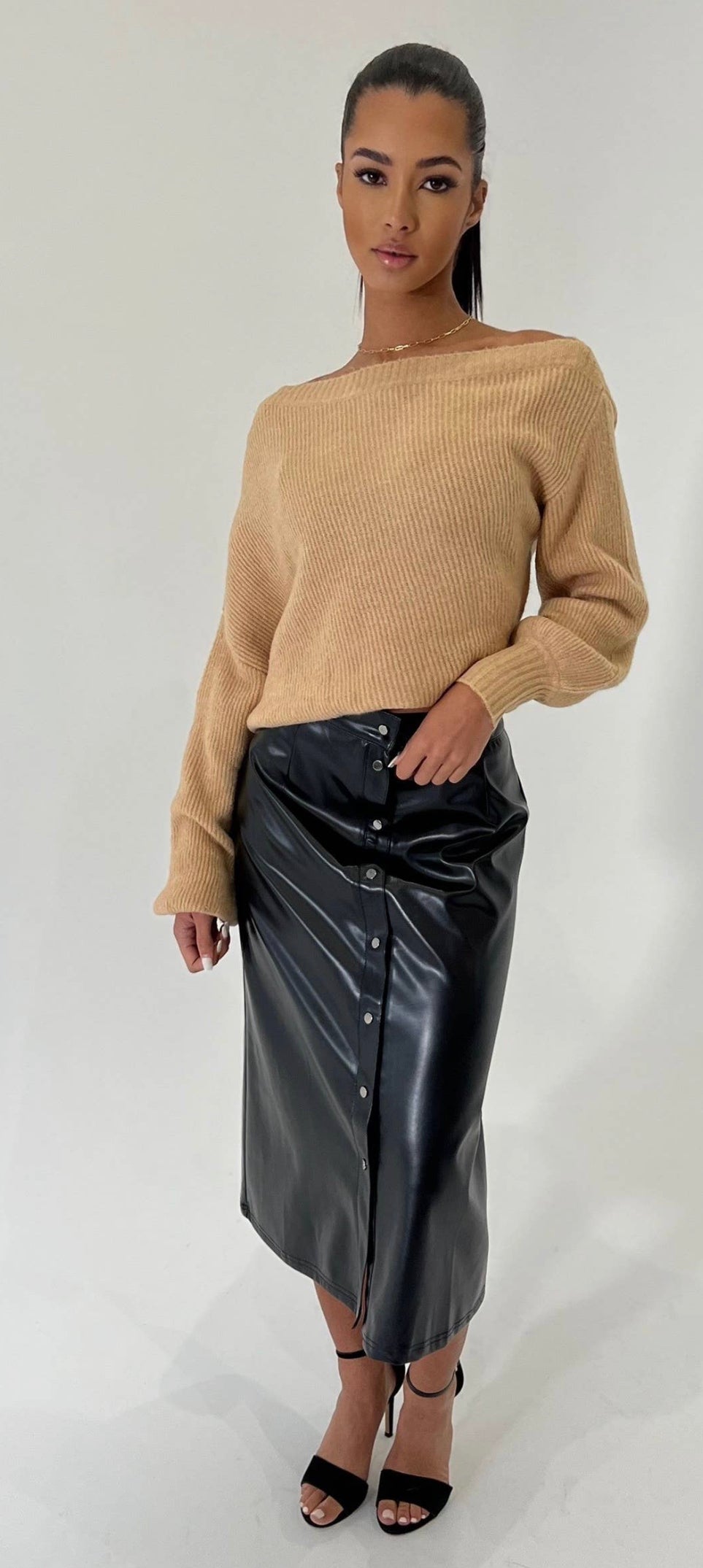 Vegan leather straight line midi skirt featuring flat waist and snap button front.