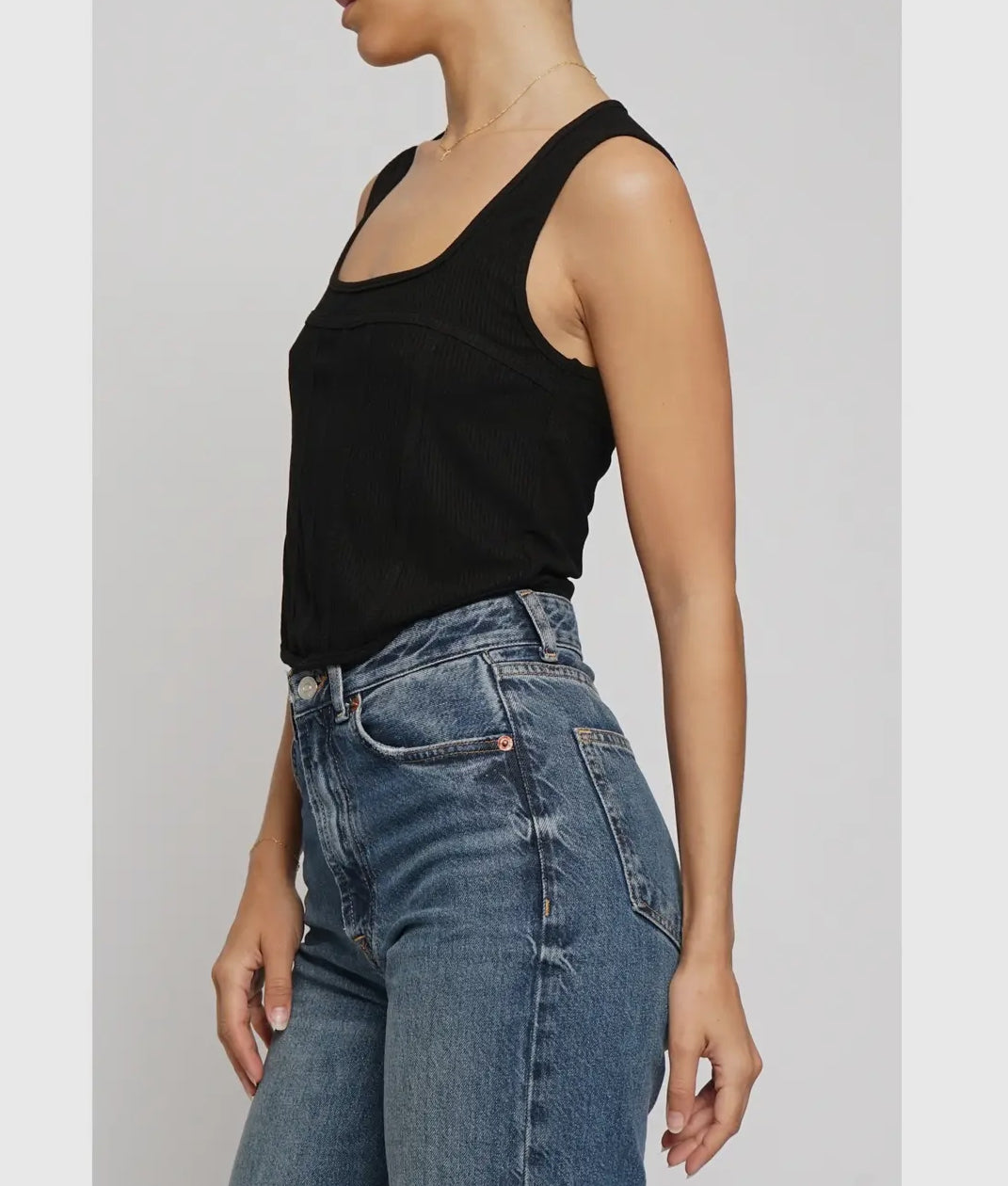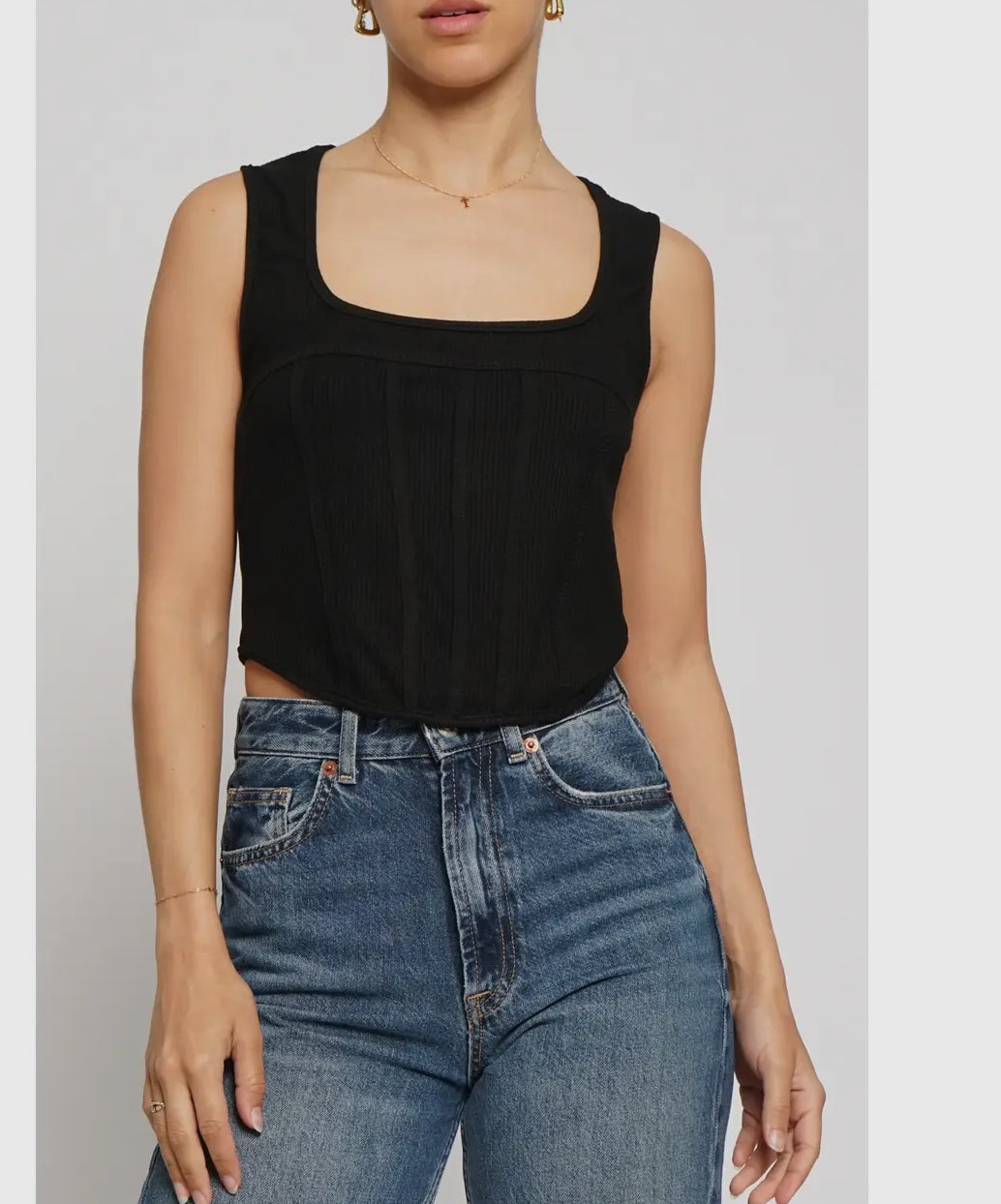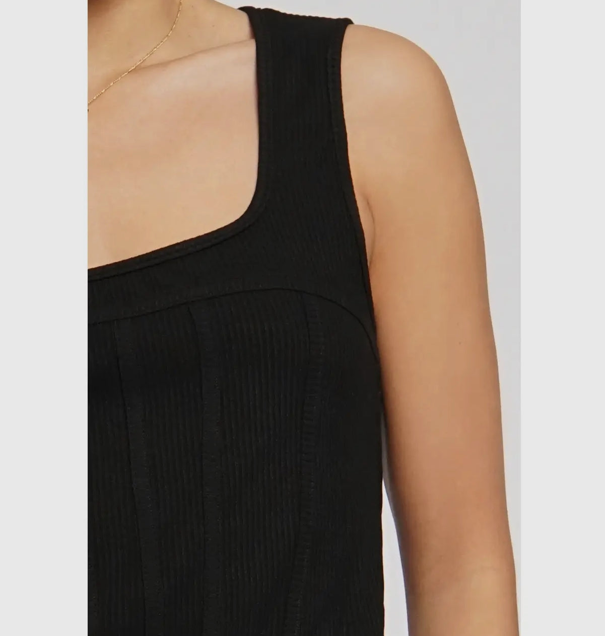 Knit - 92% Rayon, 8% Spandex - Sleeveless - Faux corset seams - Slightly cropped - Ribbed