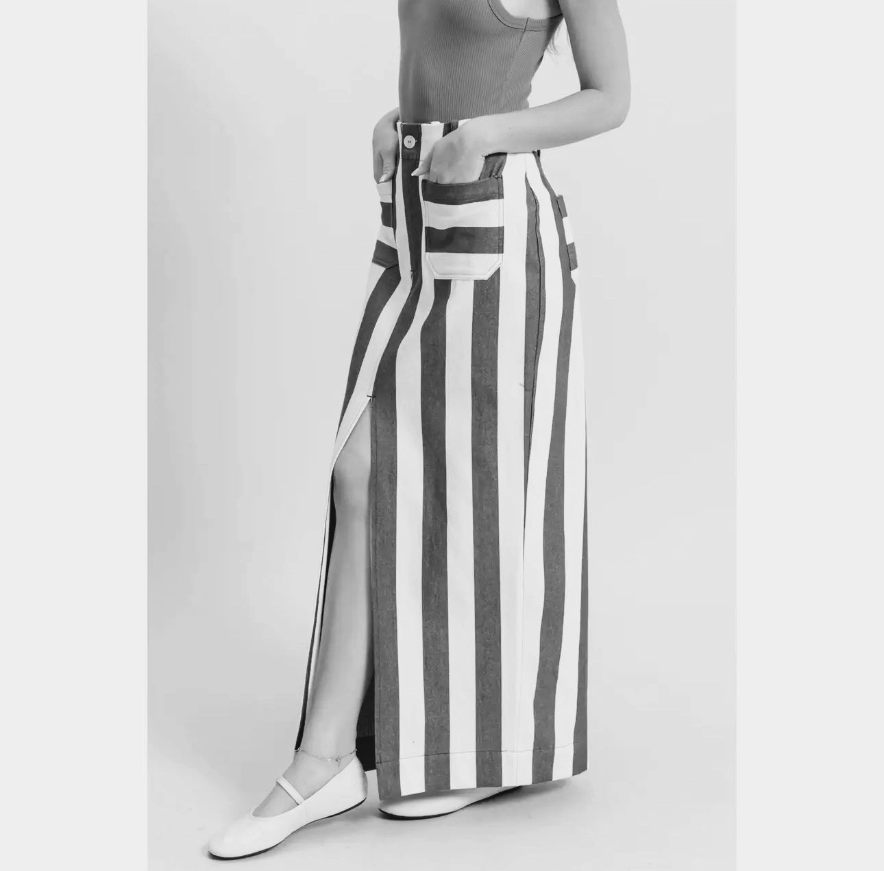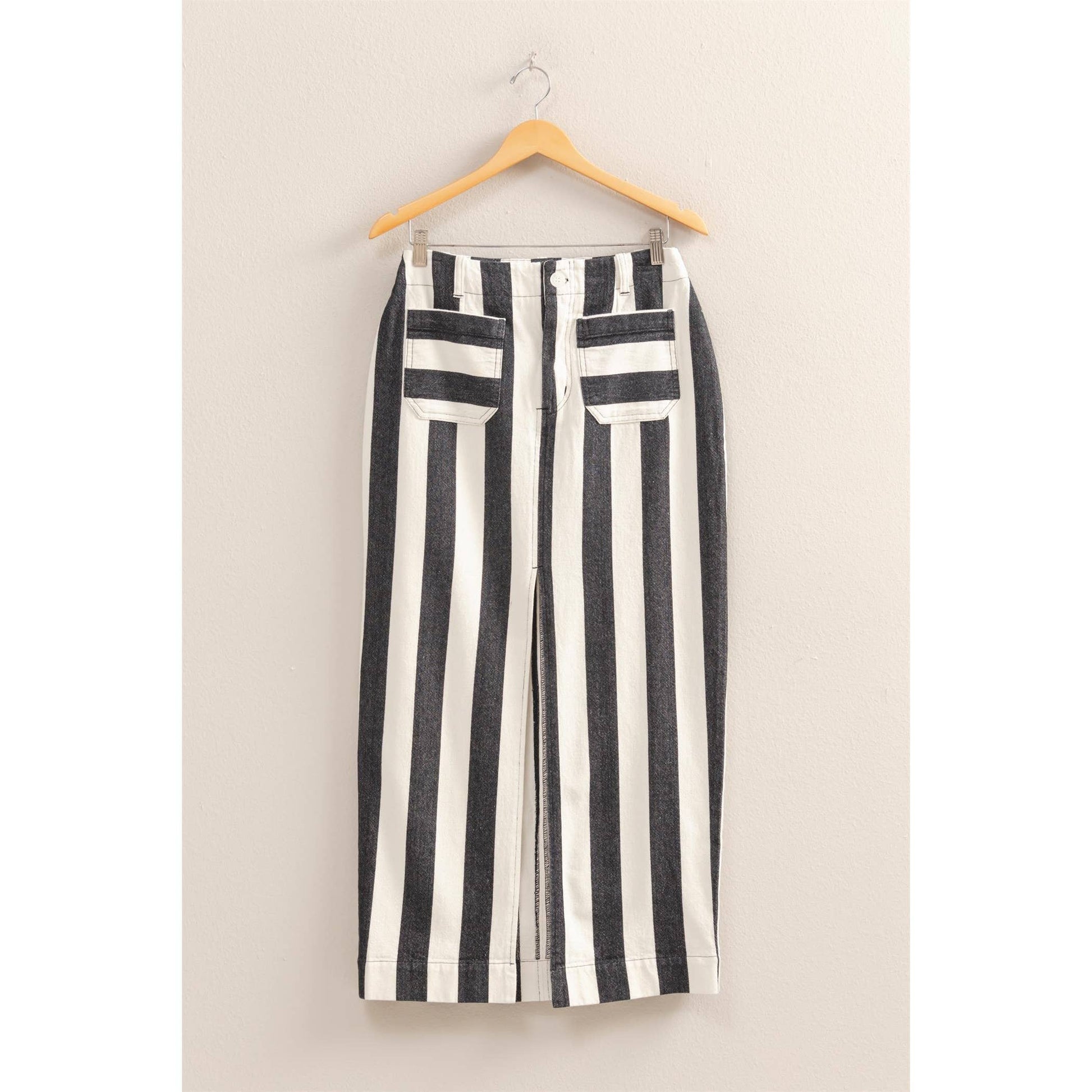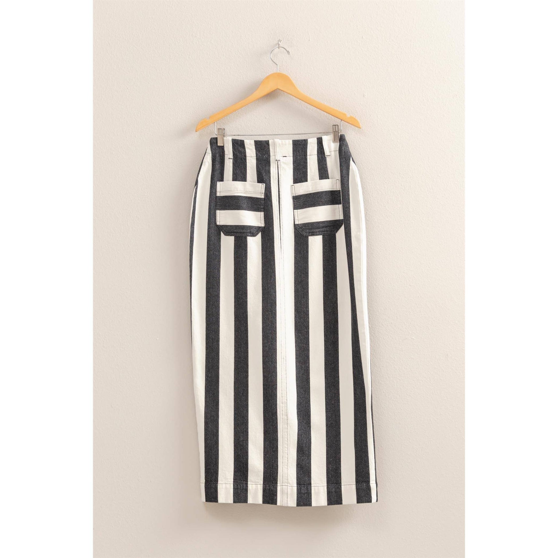 You Wont Ever Get Tired Of Wearing A Skirt This Cute. Decorated In A Striped Pattern, This Skirt Has A High-Rise Fit With A Button Closure. Two Front Pockets Lead To A Close Fitted Maxi Skirt With A Sexy Front Slit.