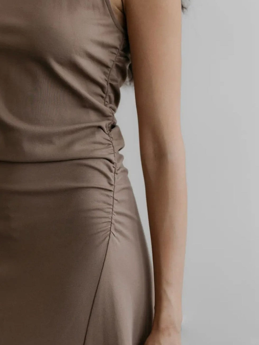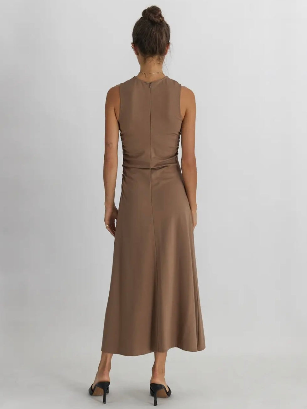 A fresh take on a classic cut, this sleeveless dress is detailed with asymmetrical ruching at the sides for a customizable fit. Features an invisible back zip closure and detailed with a fit and flare bodice, The Elena Dress is versatile enough to wear everyday or dressed up for a night time look.