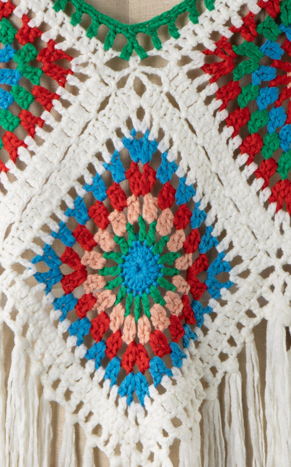 Gorgeous patchwork crochet cami with multiple colors and fringe bottom. V neckline.