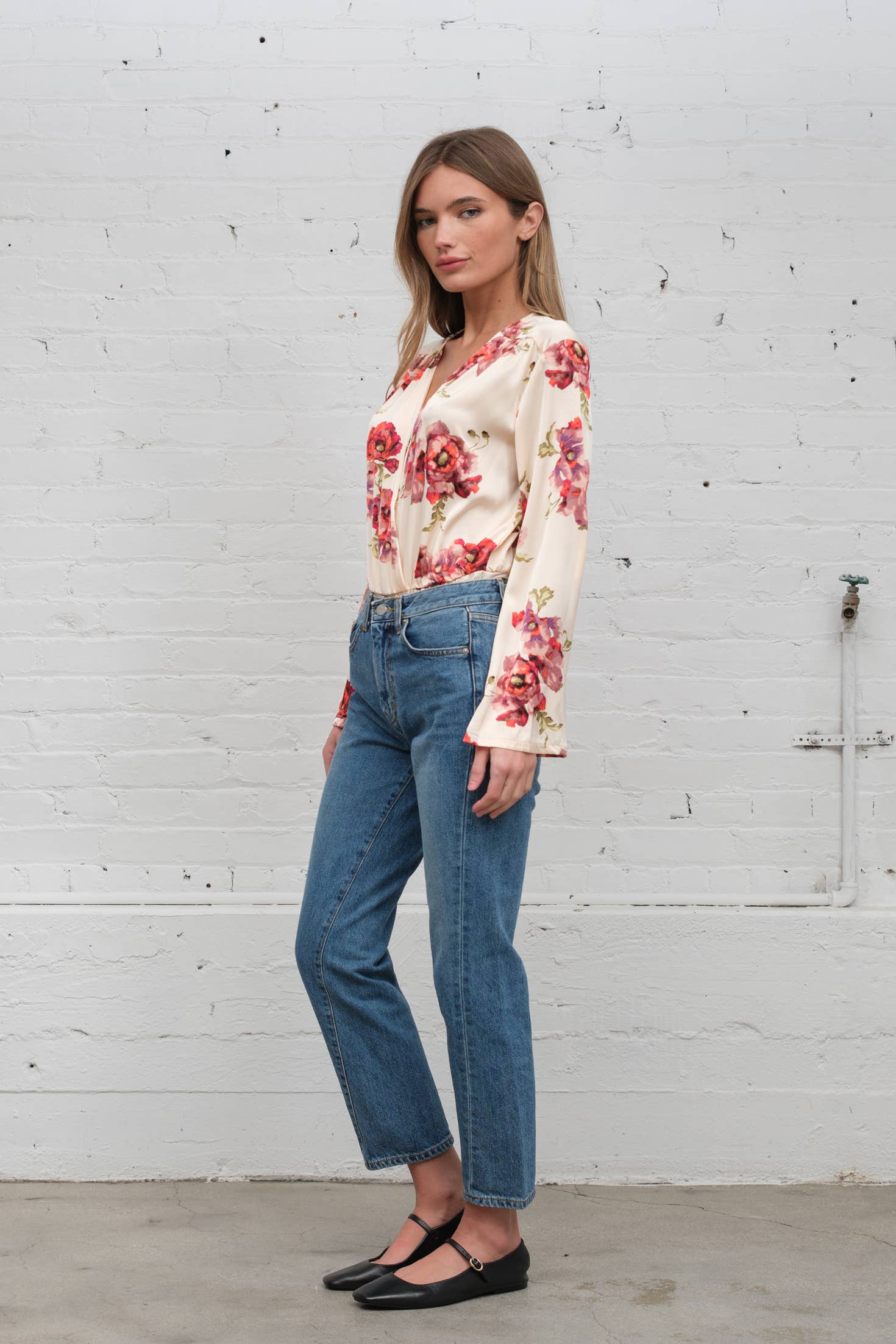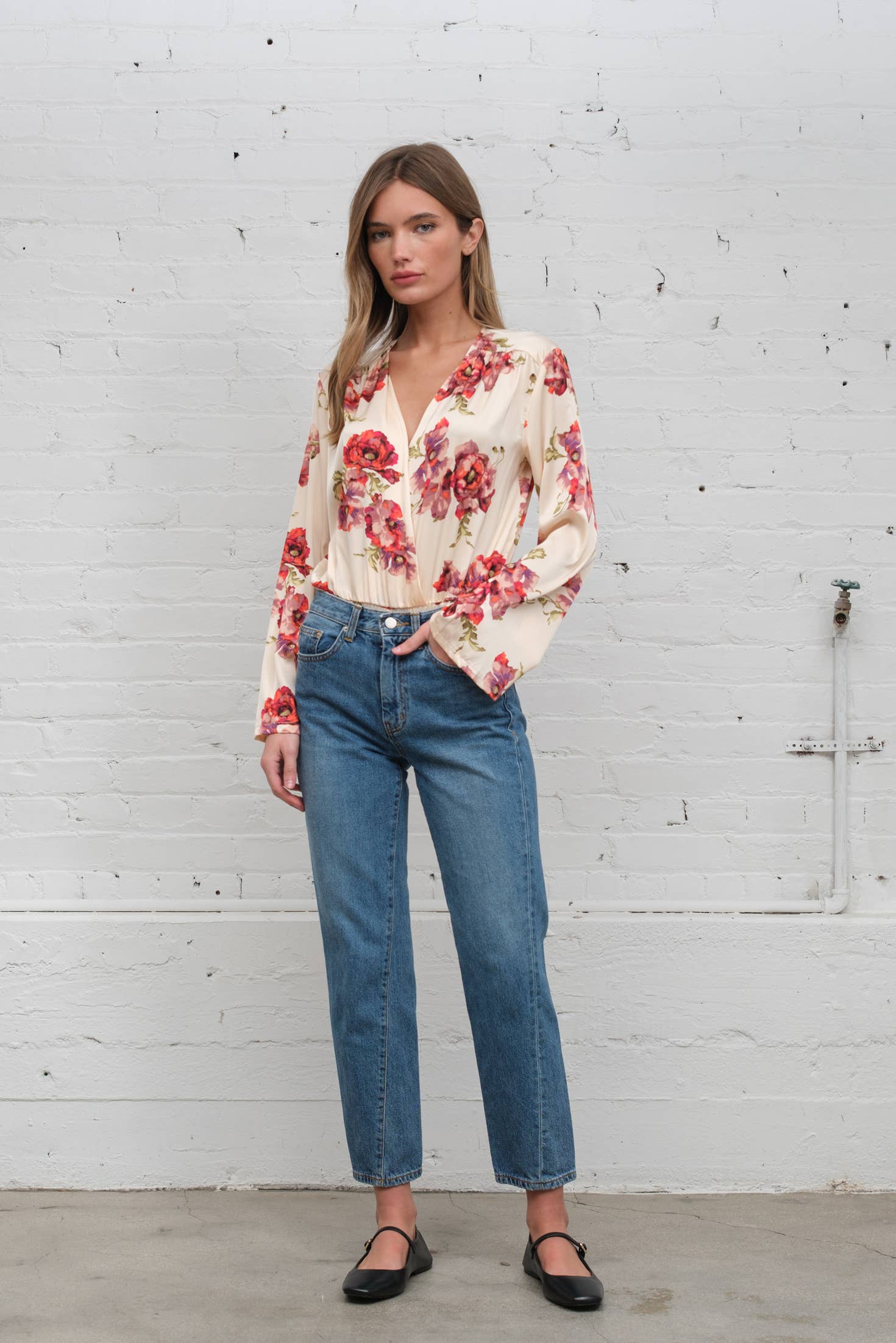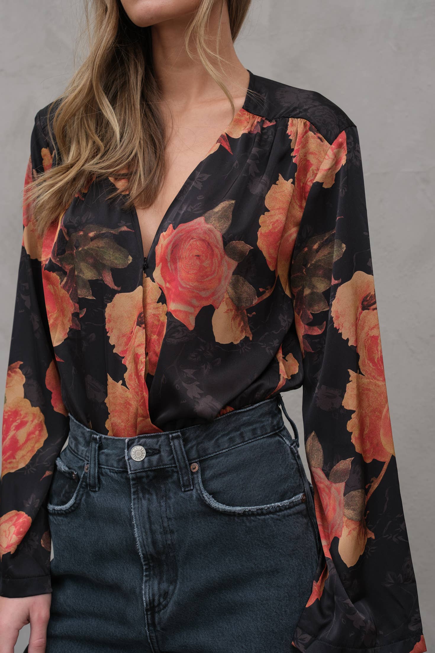-Silky bold flower print long sleeve bodysuit -Front overlap detail -Front snap button closure ** Model is wearing size S