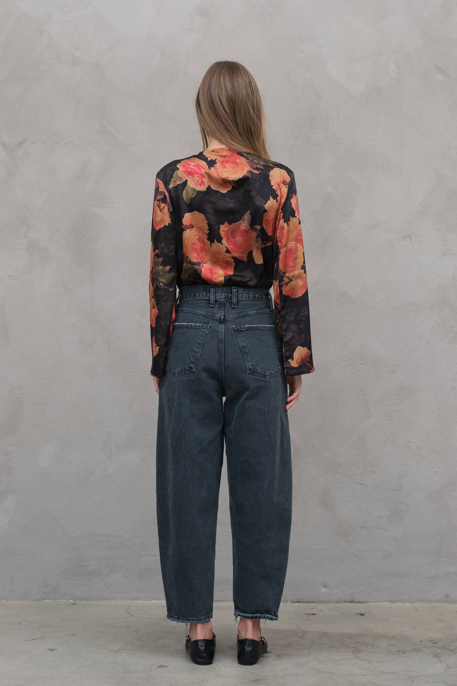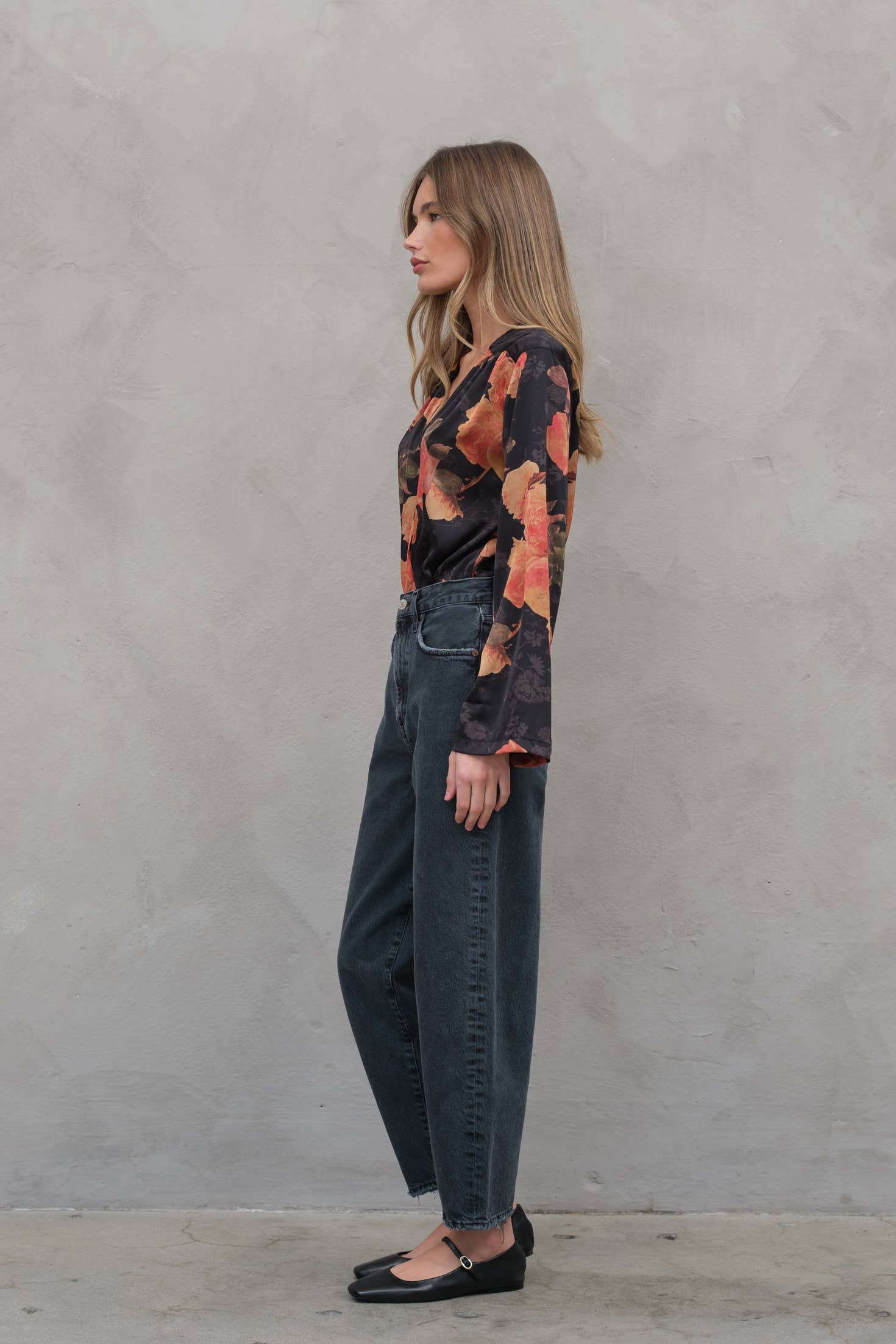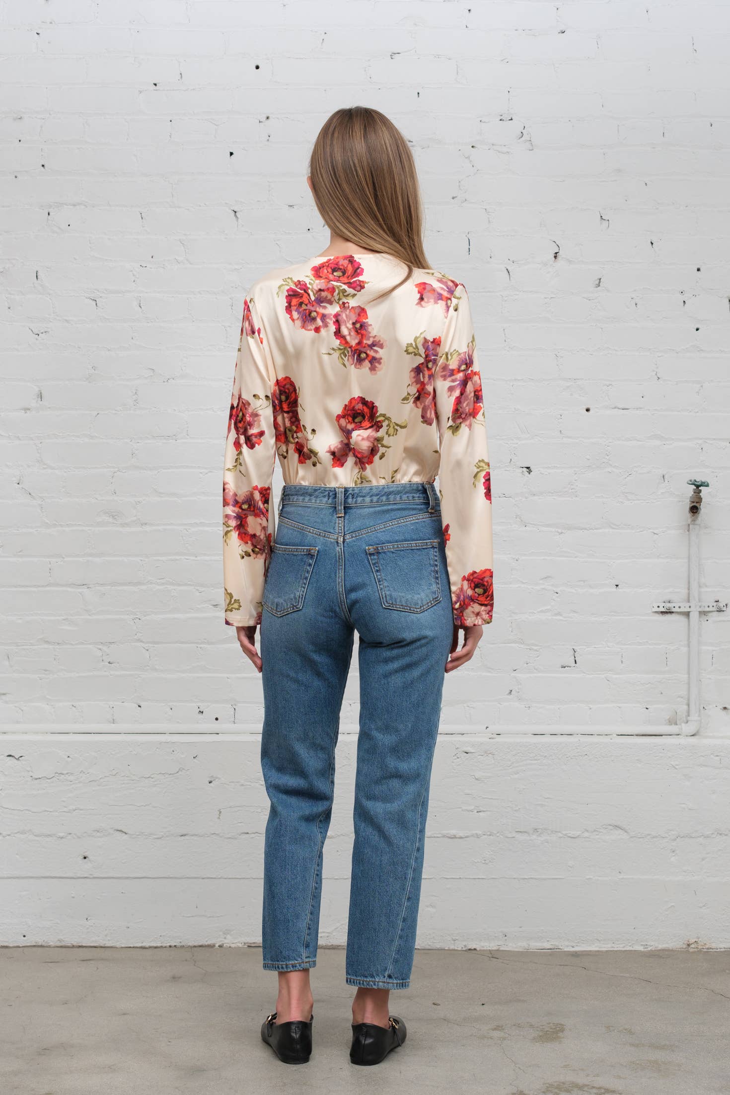 -Silky bold flower print long sleeve bodysuit -Front overlap detail -Front snap button closure ** Model is wearing size S