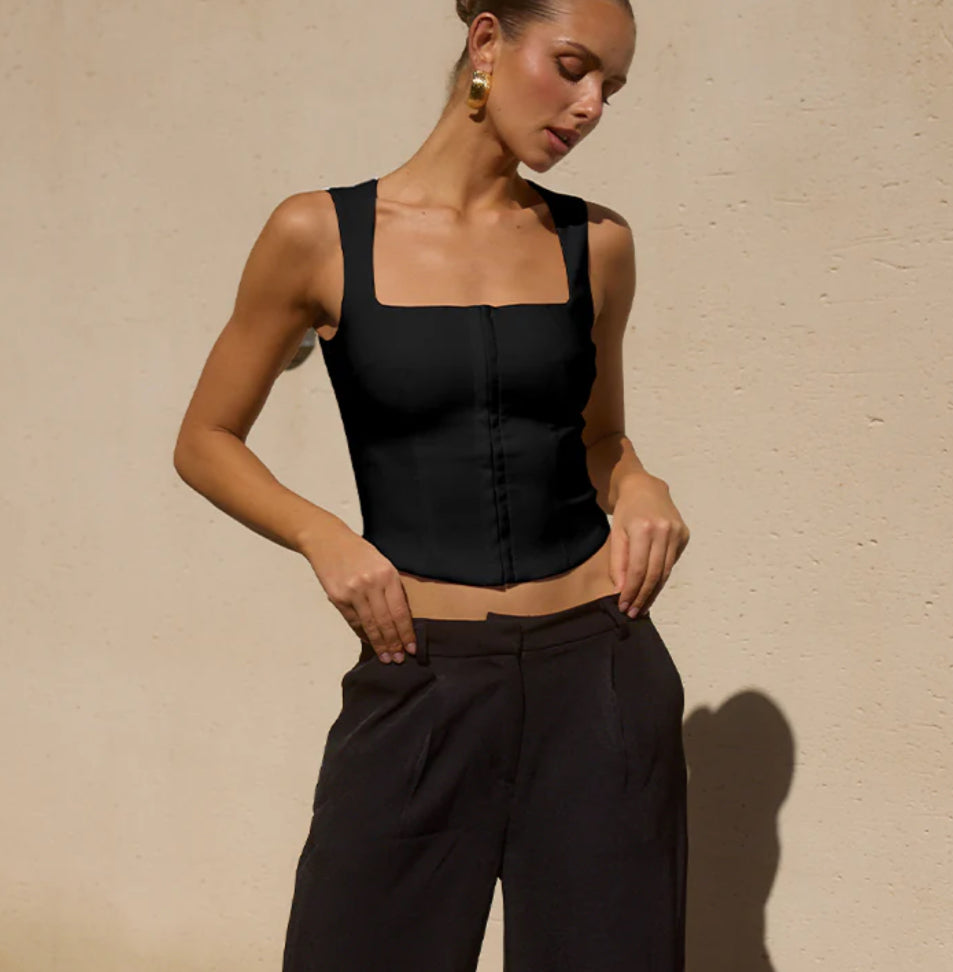 Featuring a hook and eye detail and squared neckline, our Flynn Top will a subtle sexiness to your look, match this with our Zarriah Pant for the complete look.