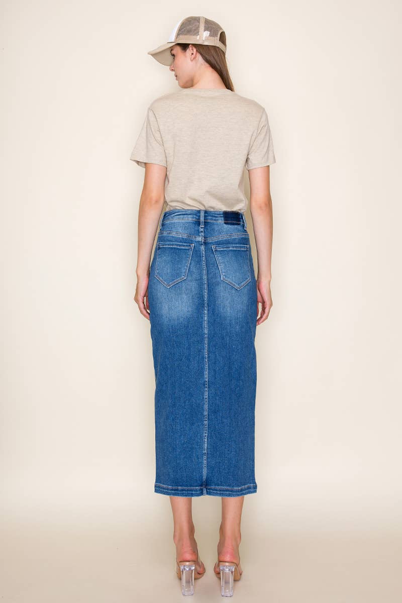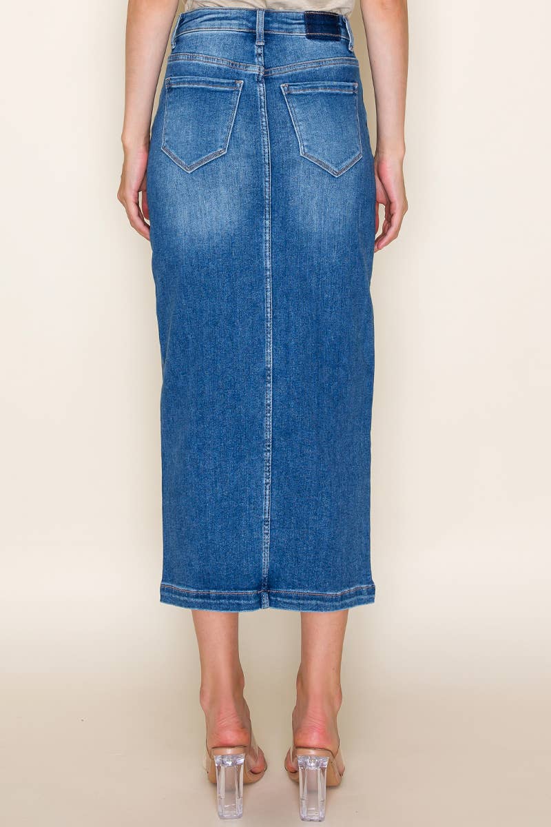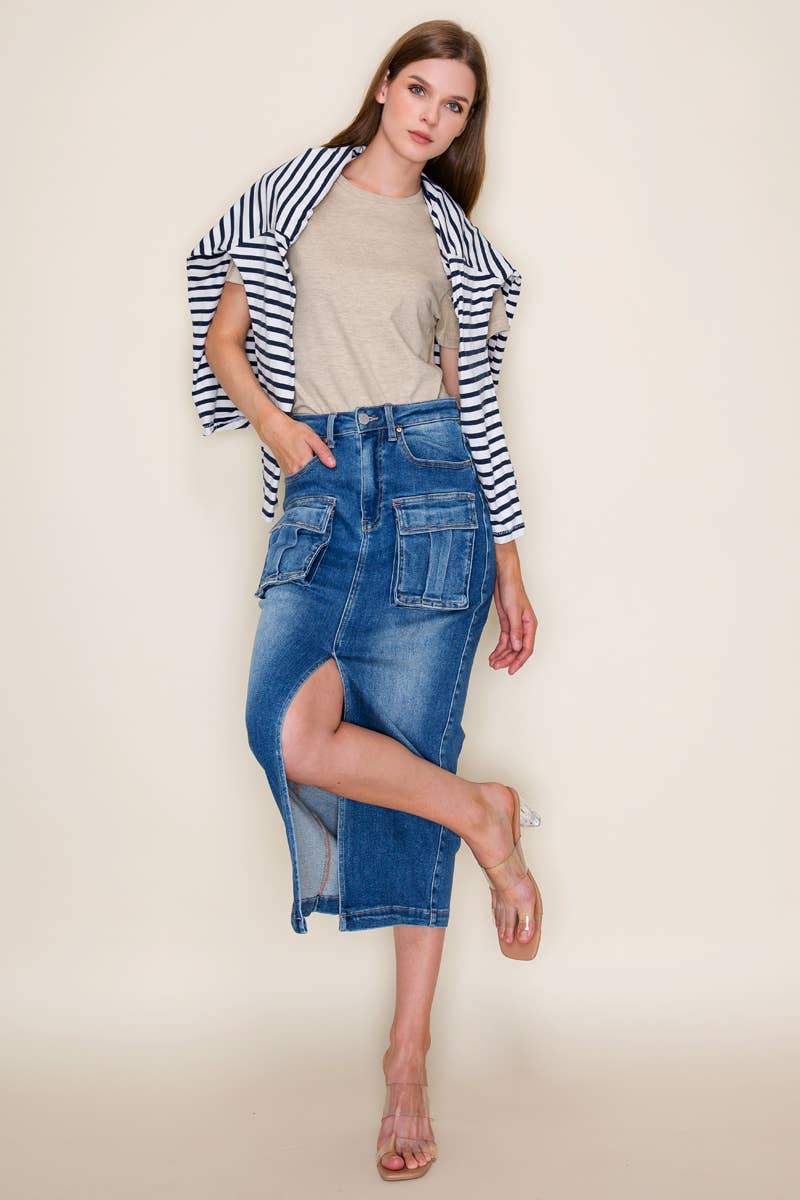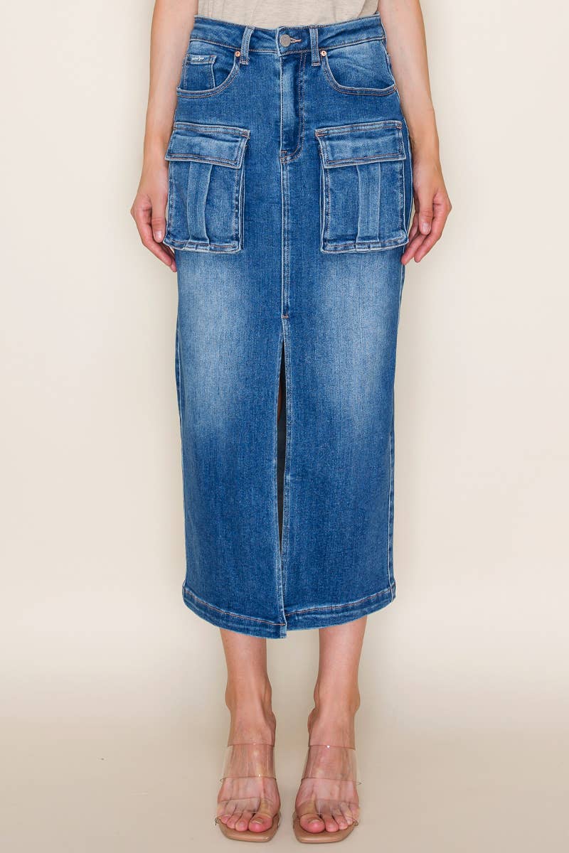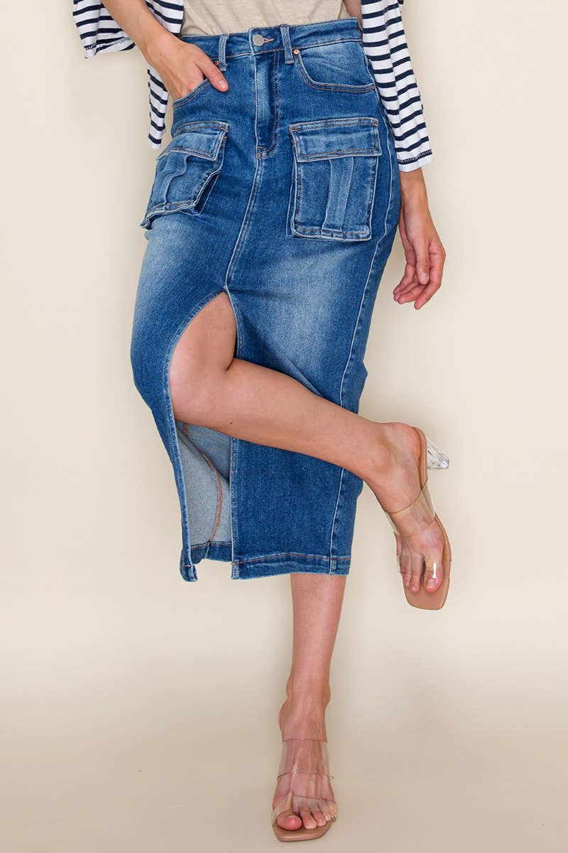 Long Skirt Closure Type: Zipper Fly Detail: Long Skirt, Stretch Denim, Front Cargo Pocket Detail, Front Slit Waist Line: High Rise Fit Type: Regular Fit Fabric: Stretch Material: Denim Composition: 74% cotton, 24% polyester, 2% spandex
