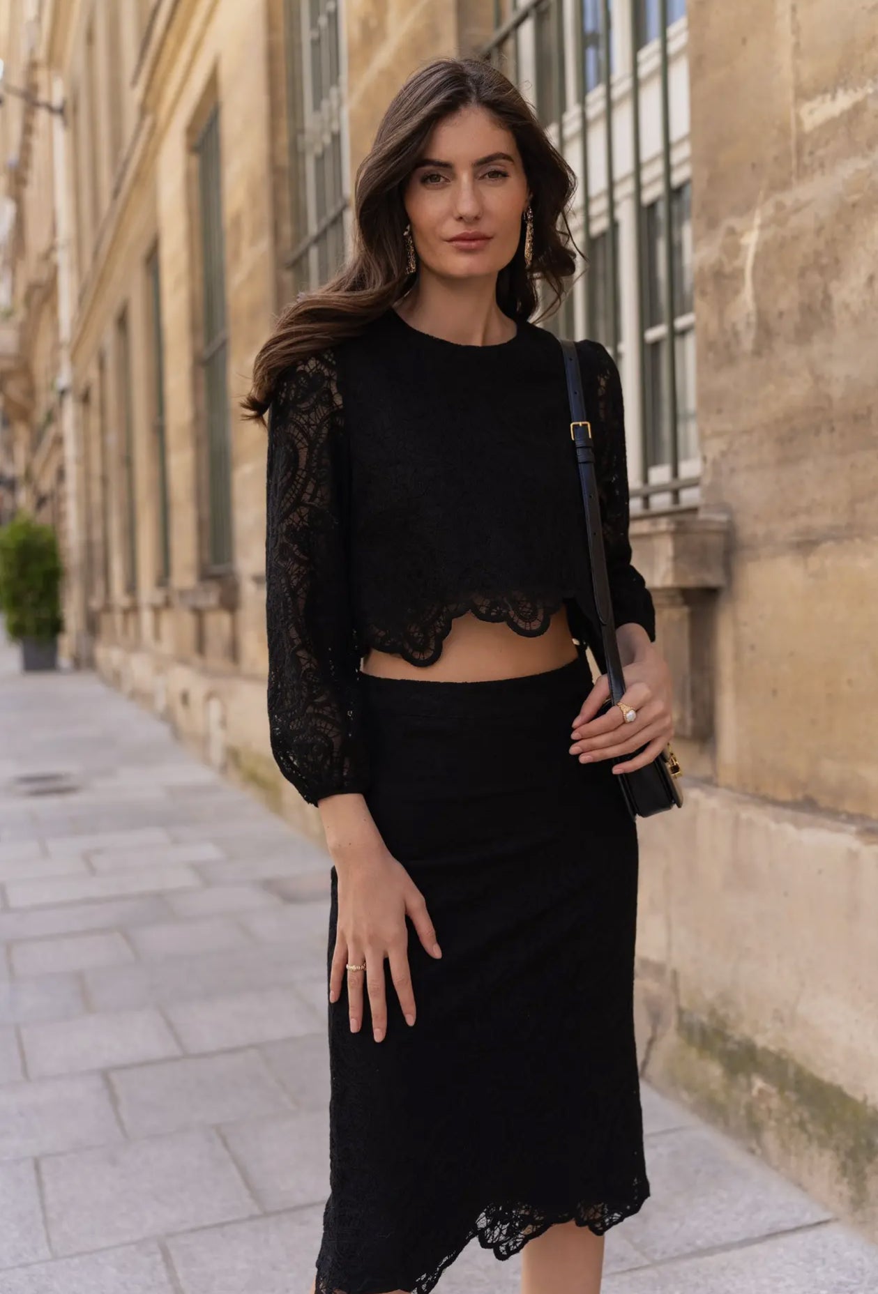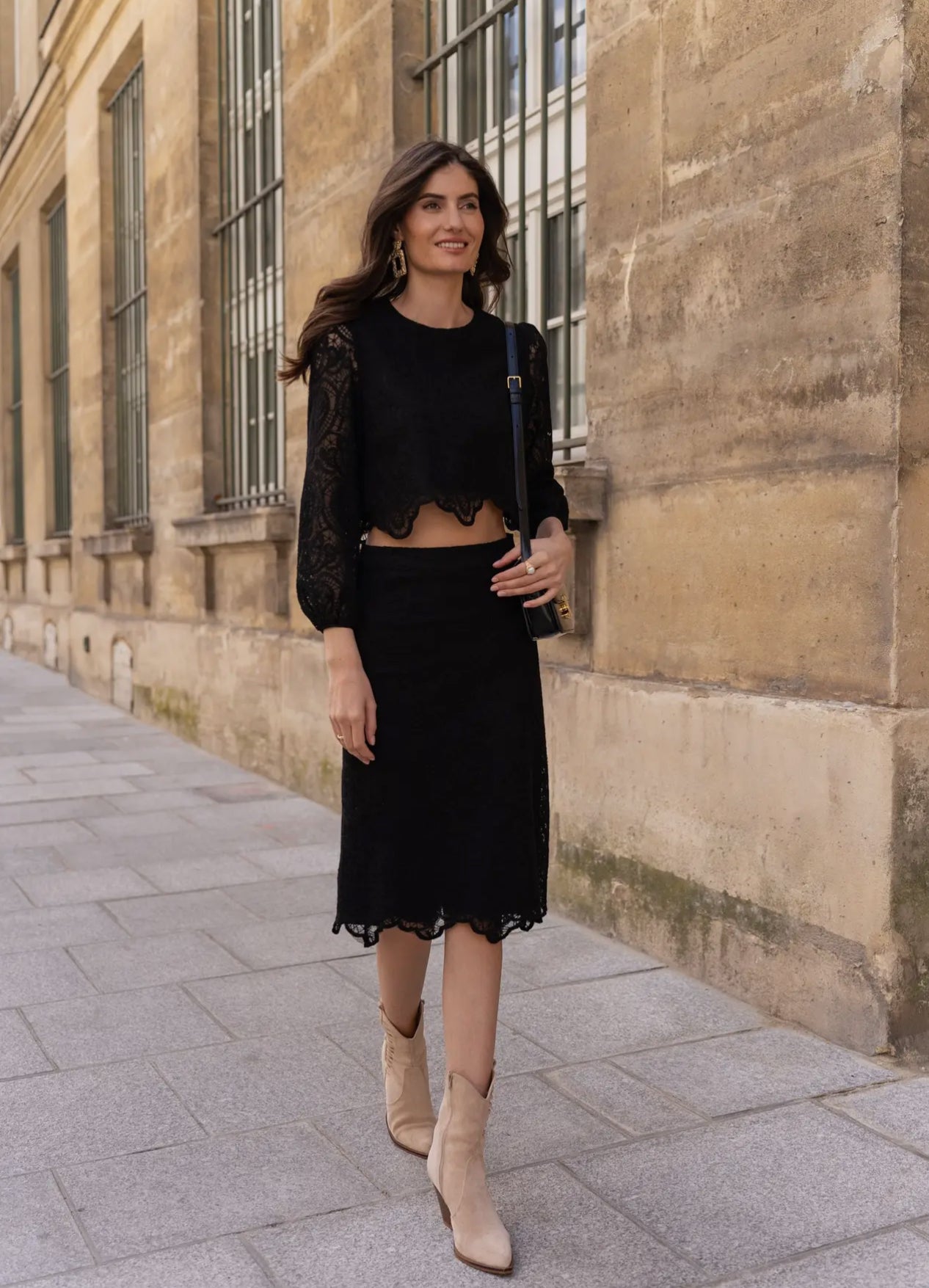 All the way from Paris comes our Lace garance midi skirt: - Floral lace - Midi and fitted cut - Inner lining - High waist - Zip closure on the side Perfect for special occasions, combine with the matching Garance top
