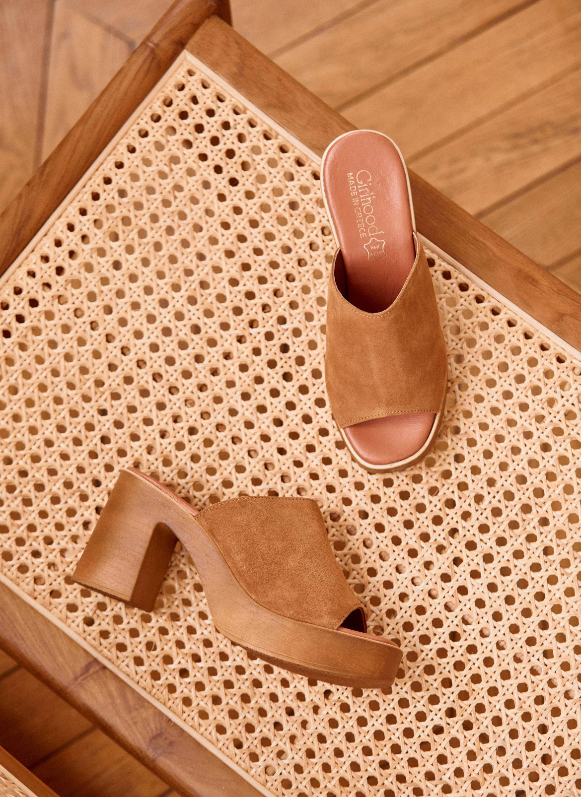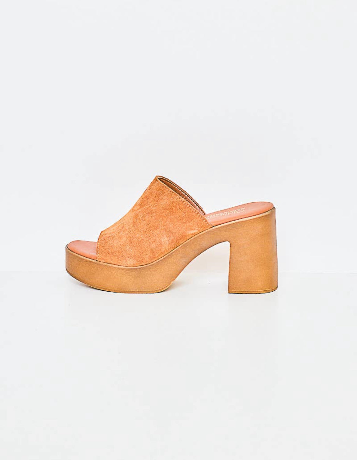 Hera leather platform mule. Wood block heel and suede upper. Fits true to size.