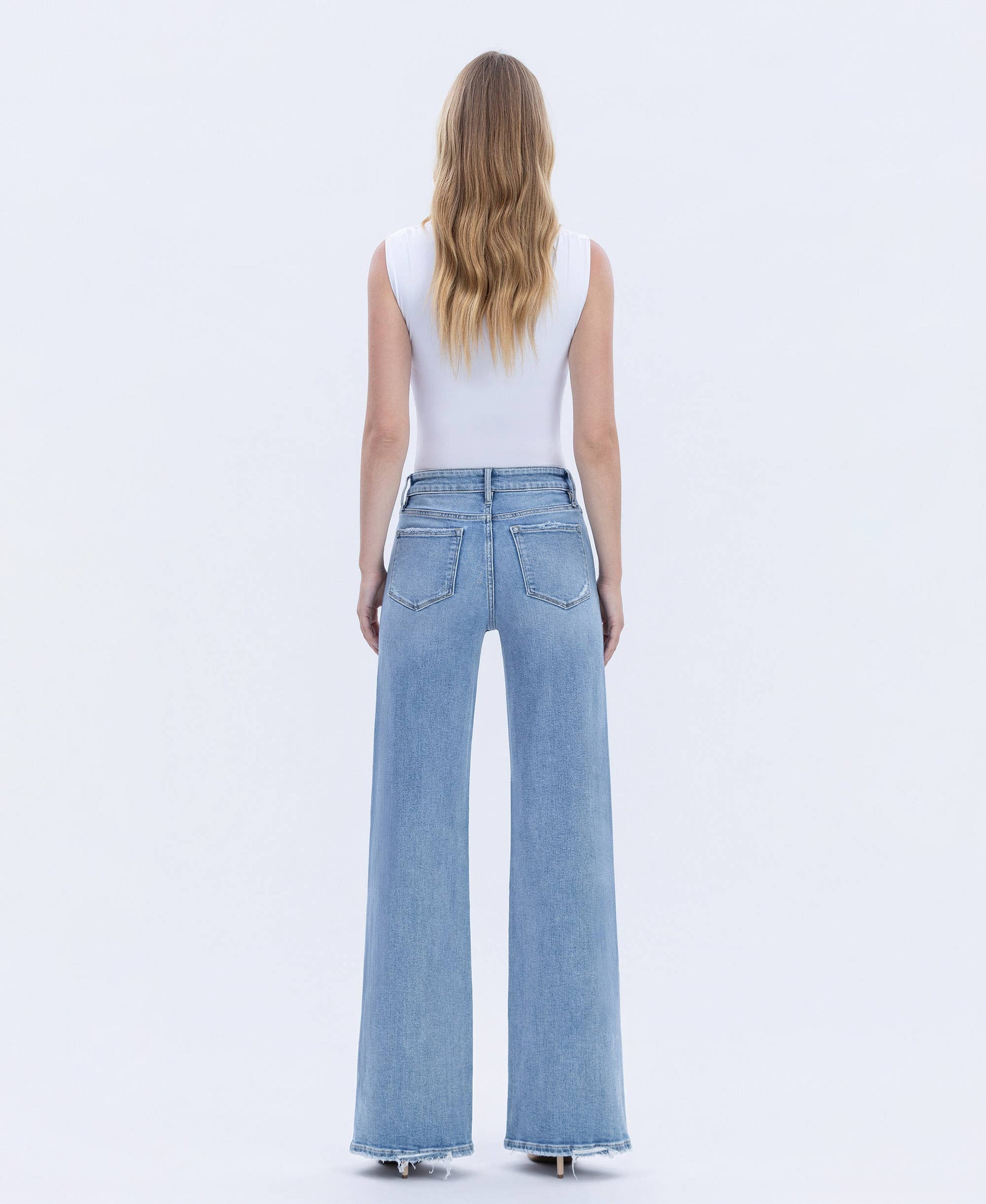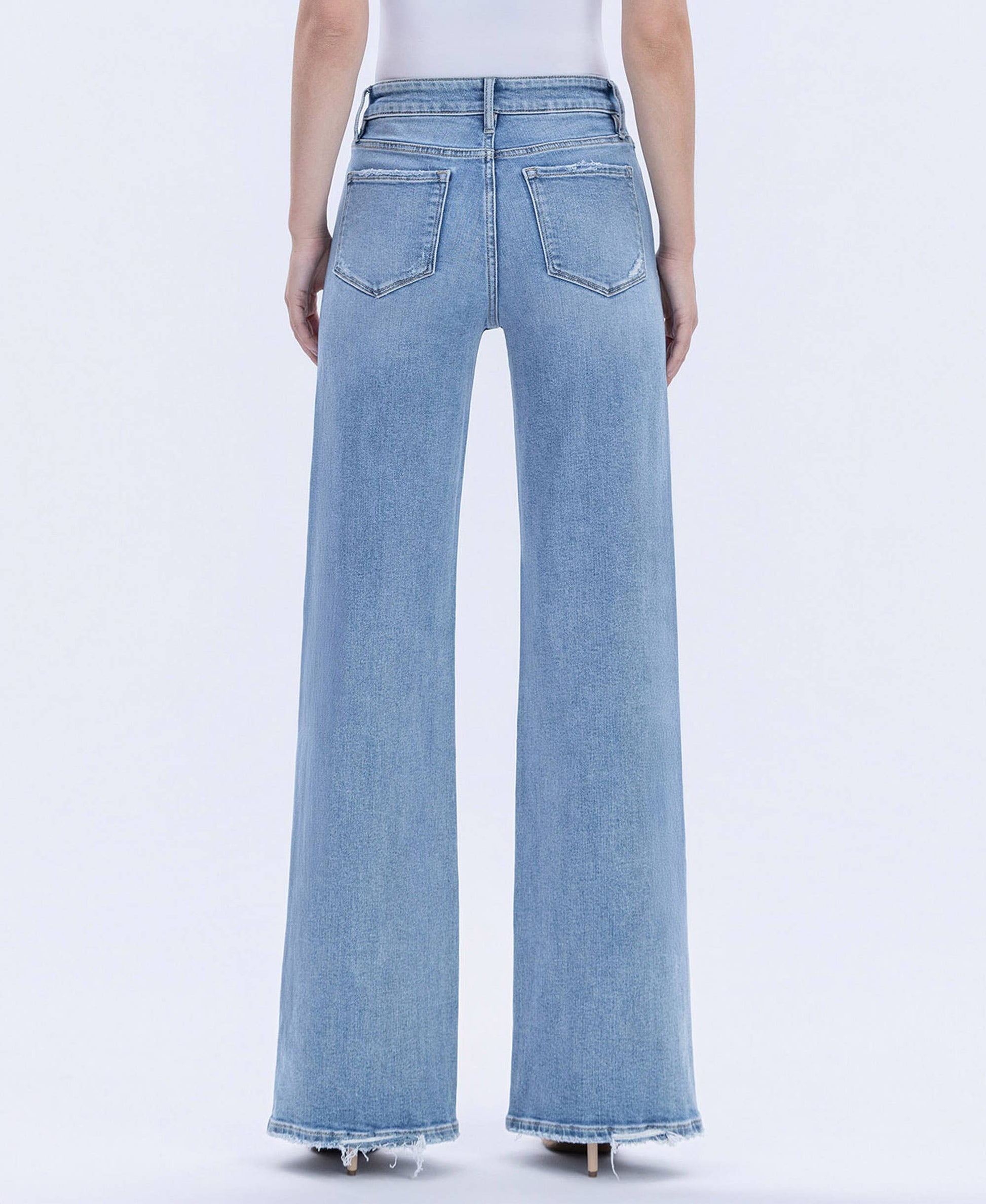 COMFORT STRETCH DENIM, HIGH RISE WAIST, LIGHTLY DISTRESSED DETAIL, FULL LENGTH, WIDE JEANS