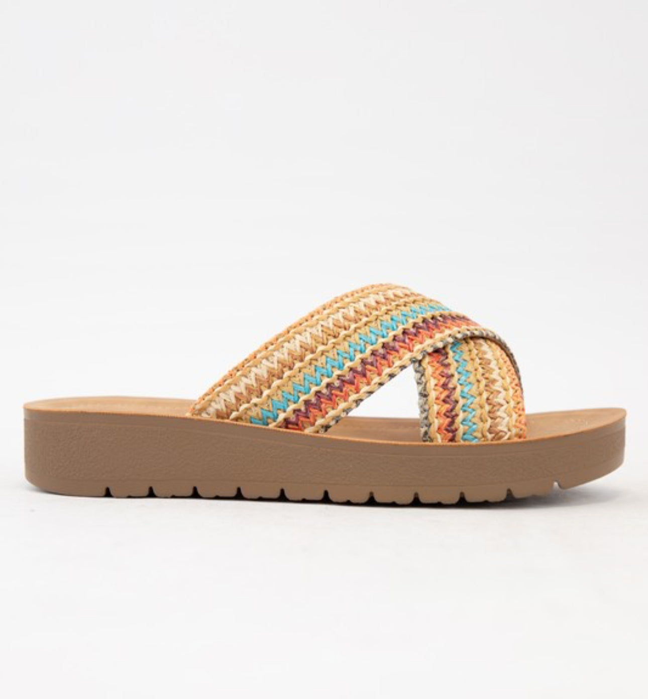 Bold rafia multicolor cross strap slip on sandal… On a foam cushion mini platform sandal.
