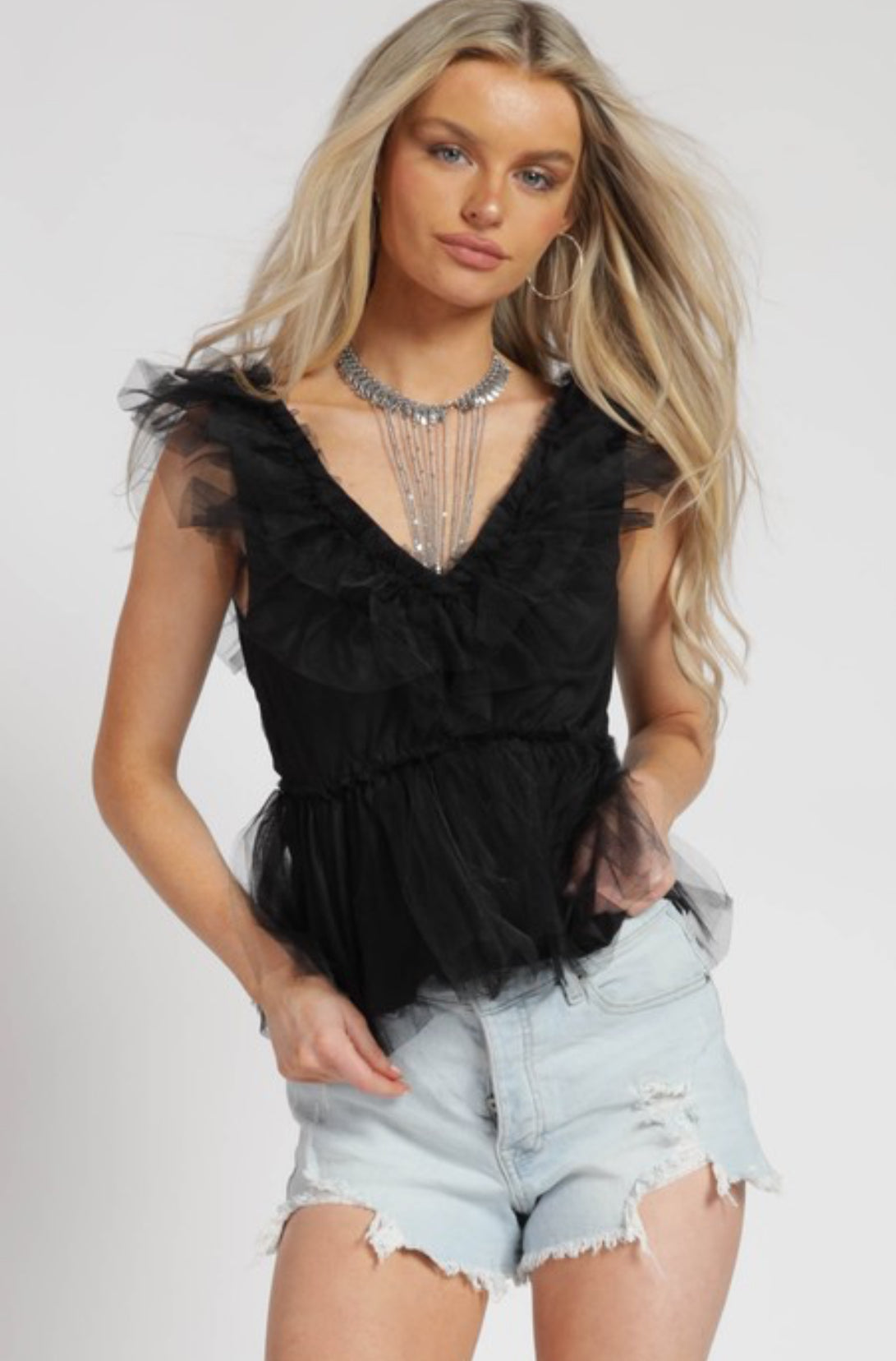 V neckline and tulle ruffles come together in this peplum style blouse.