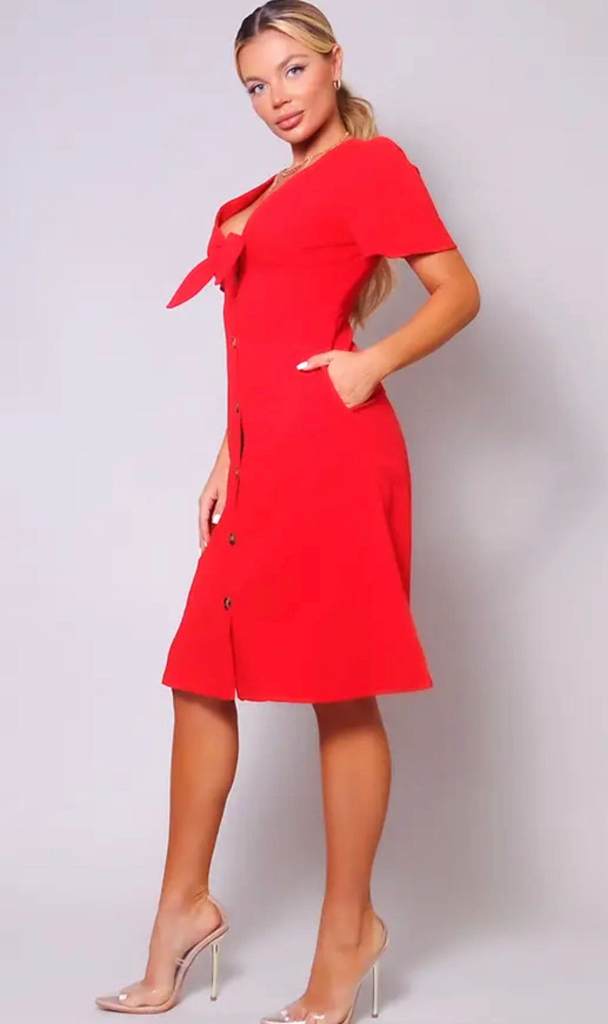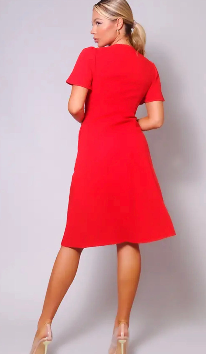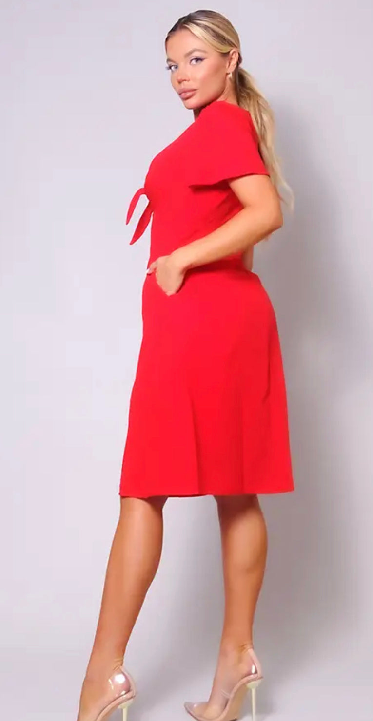 Linen texture fully line midi dressed featuring a flutter sleeve, tie at bust and button down front in tortoise.