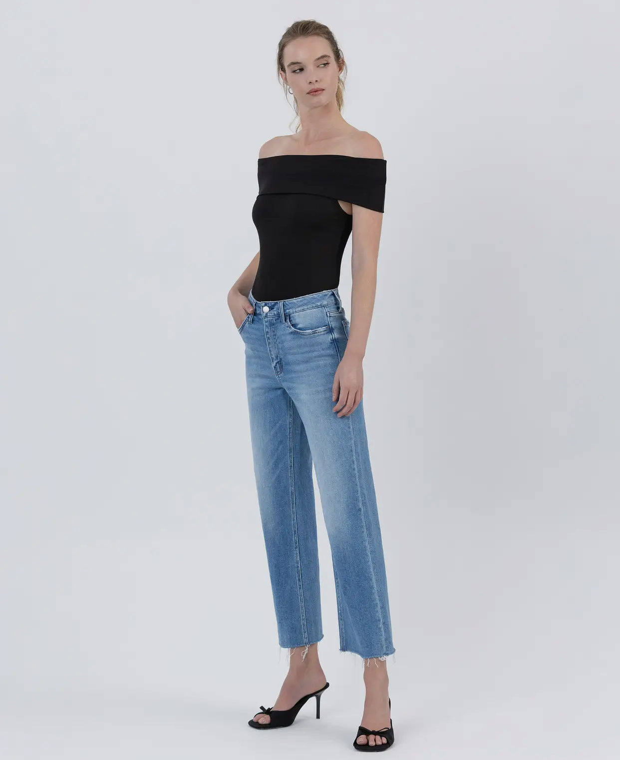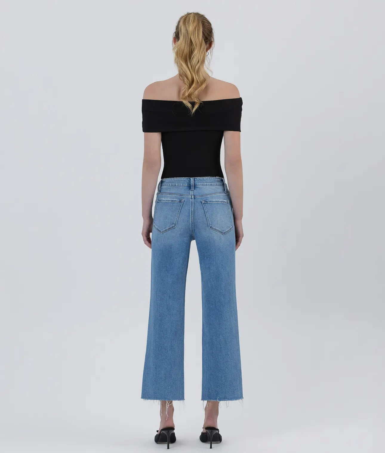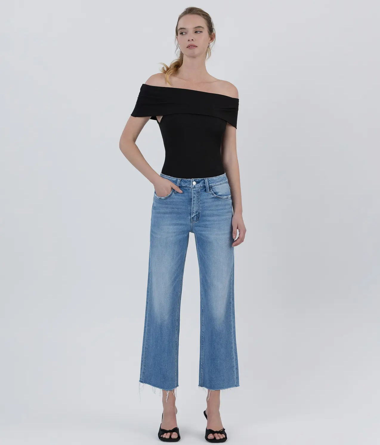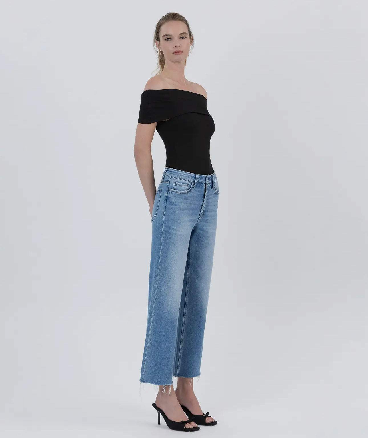 Comfort stretch denim, mid rise waist, raw hem cropped length, slim wide jeans