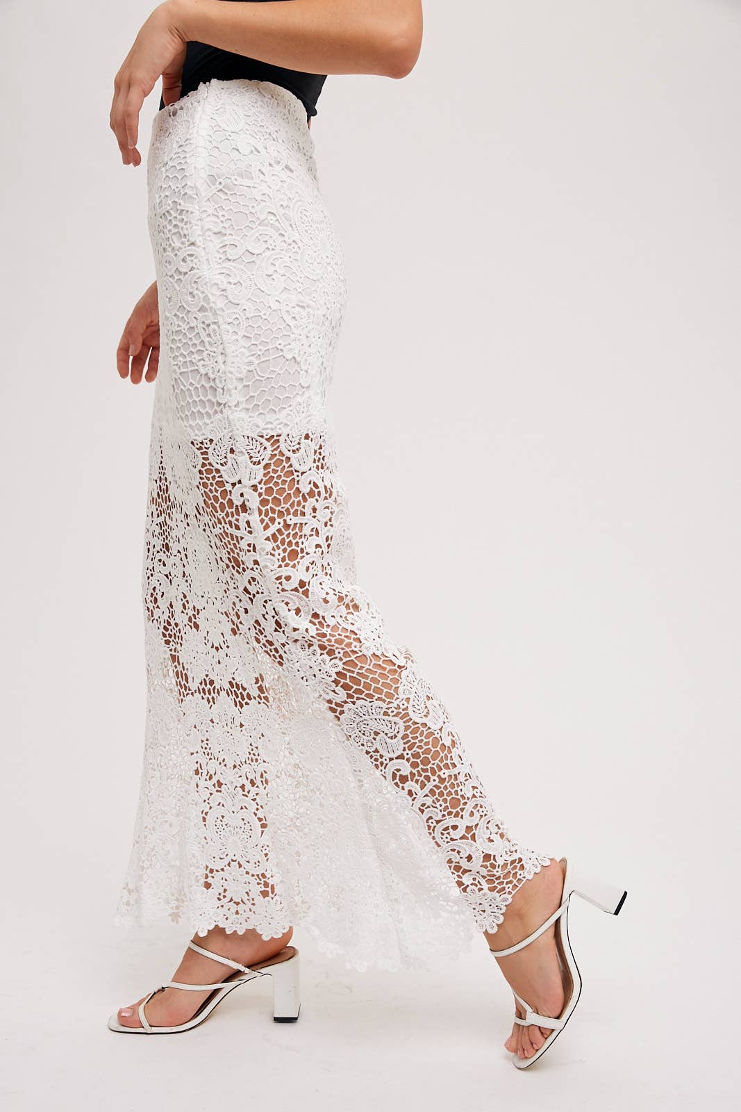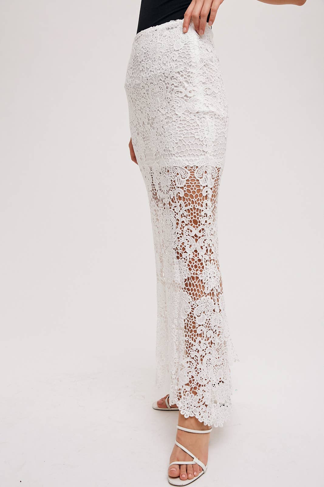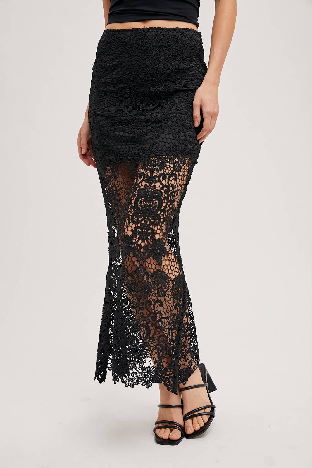 Introducing an enchanting women's laced maxi skirt, designed to enhance your style. This skirt showcases intricate lace detailing that adds sophistication and allure. The scalloped hemline lends a delicate finish, while the bodycon silhouette flatters your figure. With an elasticized waist for comfort and an inner mini skirt for coverage, this piece effortlessly blends elegance and practicality, making it a versatile addition to your wardrobe.