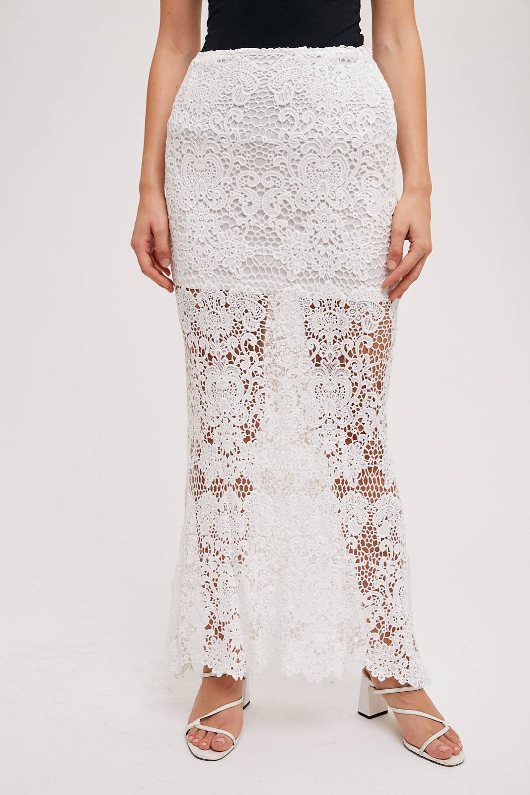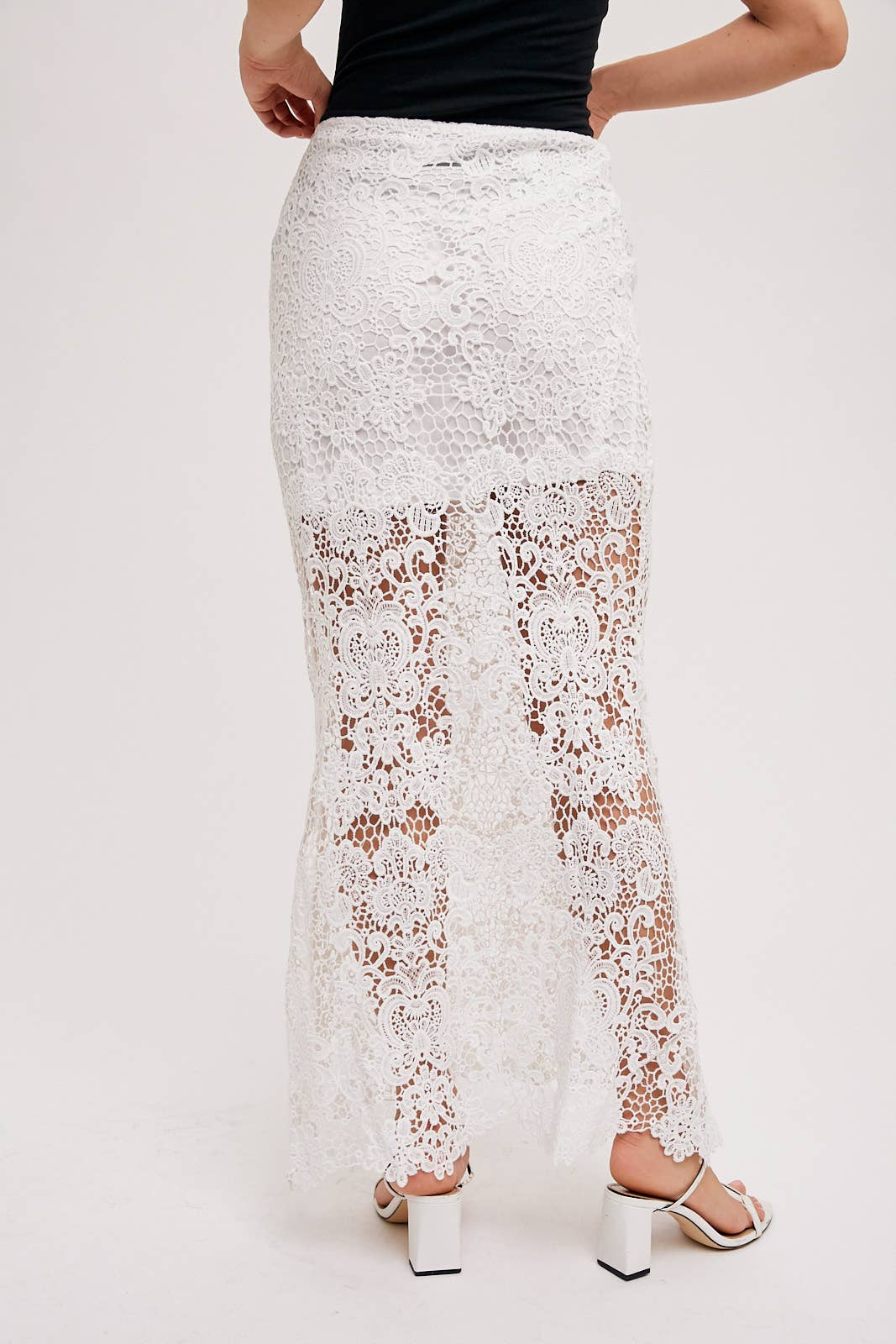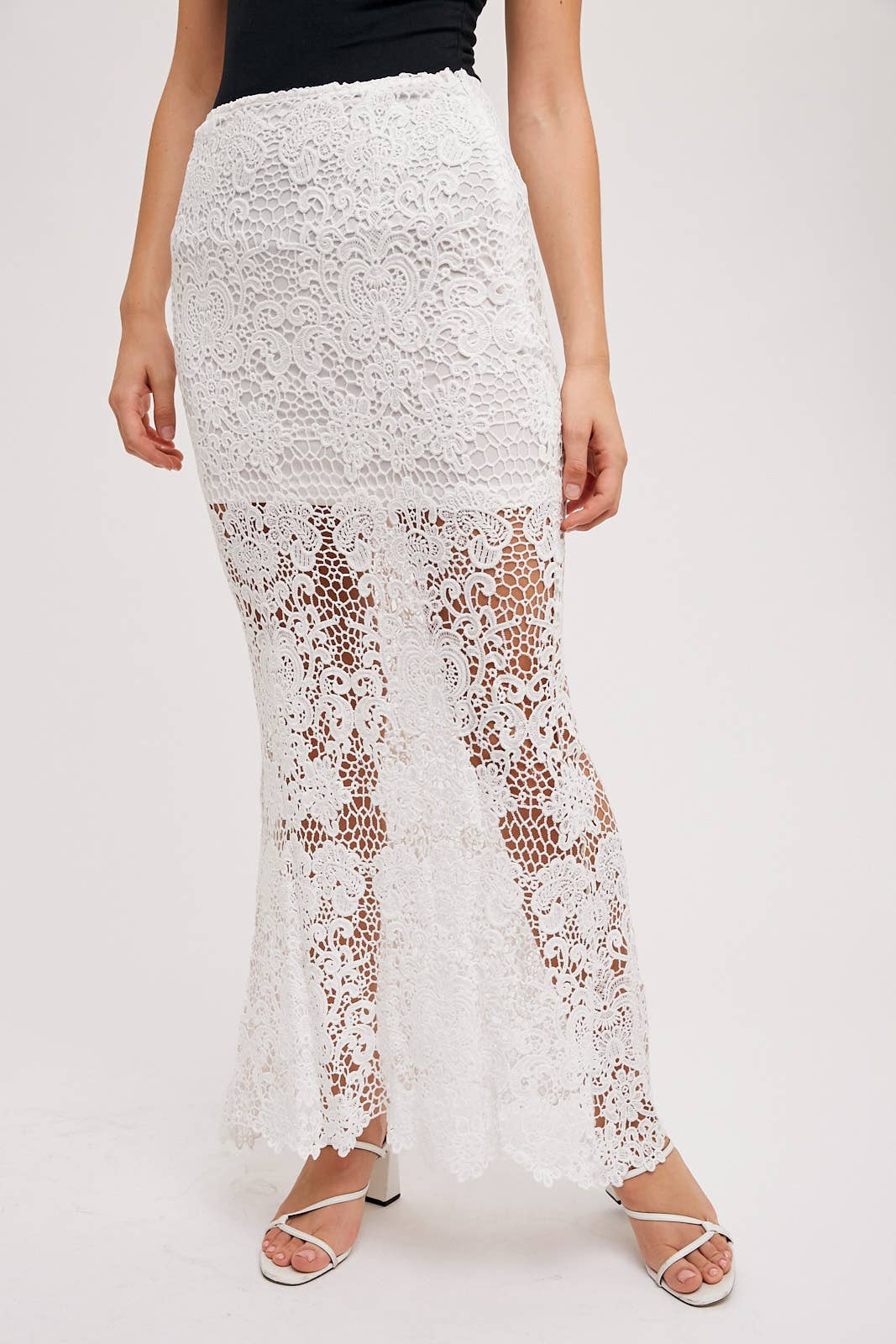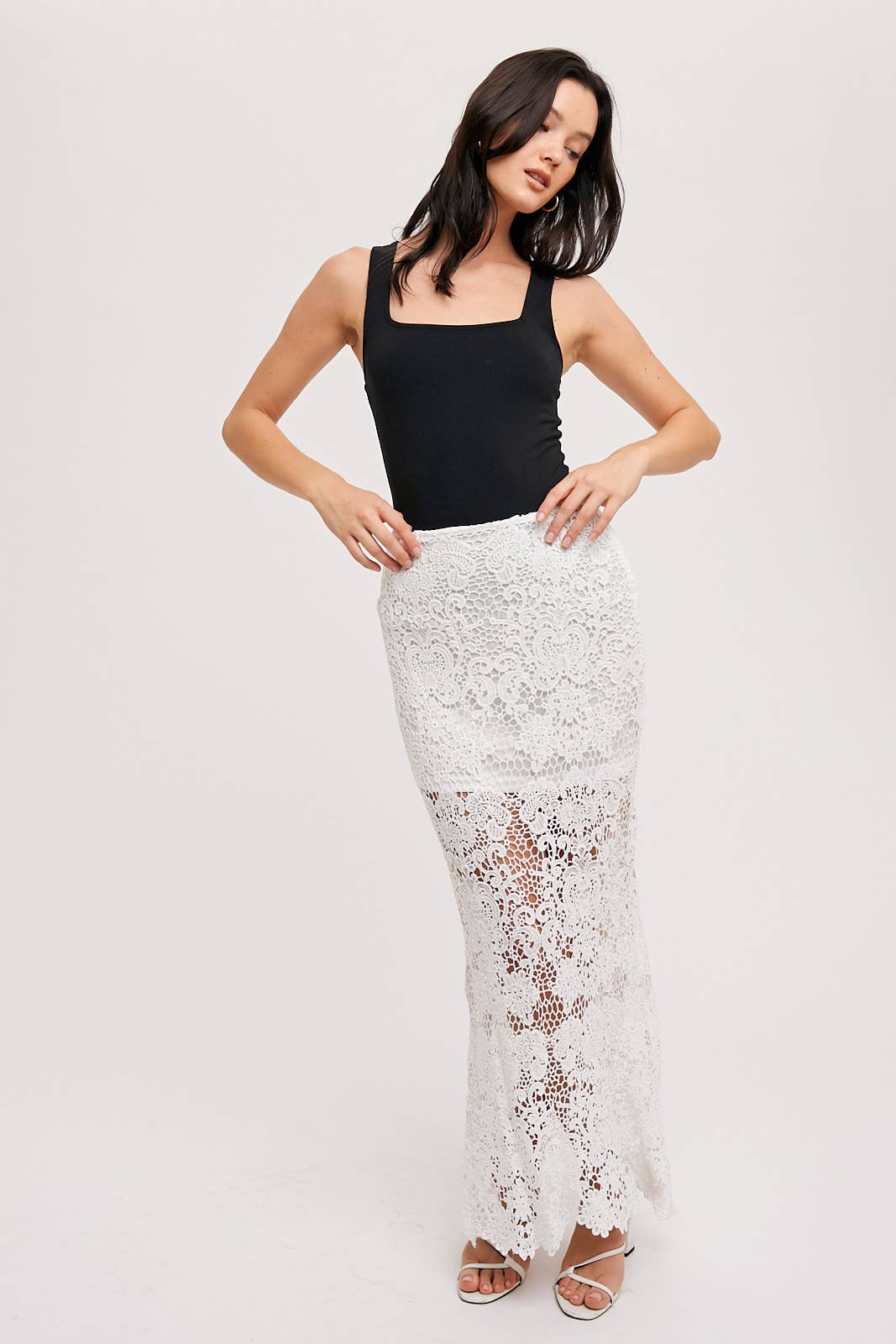 Introducing an enchanting women's laced maxi skirt, designed to enhance your style. This skirt showcases intricate lace detailing that adds sophistication and allure. The scalloped hemline lends a delicate finish, while the bodycon silhouette flatters your figure. With an elasticized waist for comfort and an inner mini skirt for coverage, this piece effortlessly blends elegance and practicality, making it a versatile addition to your wardrobe.