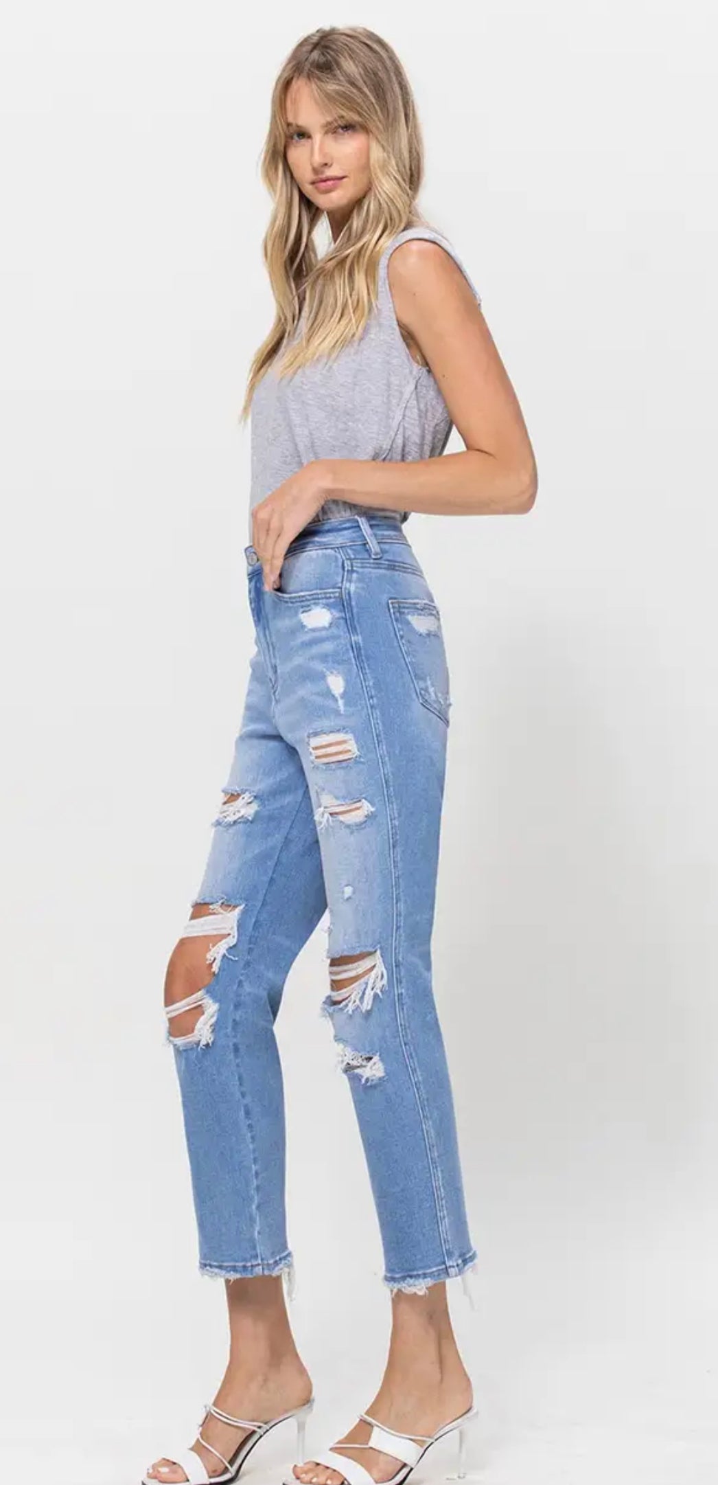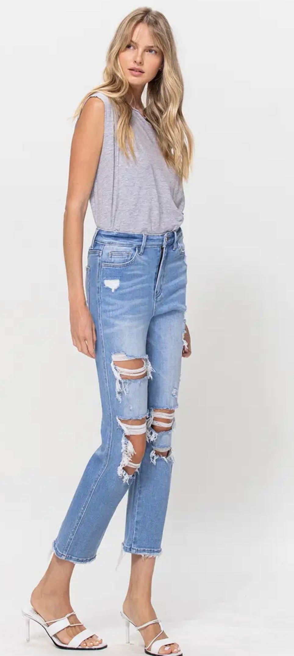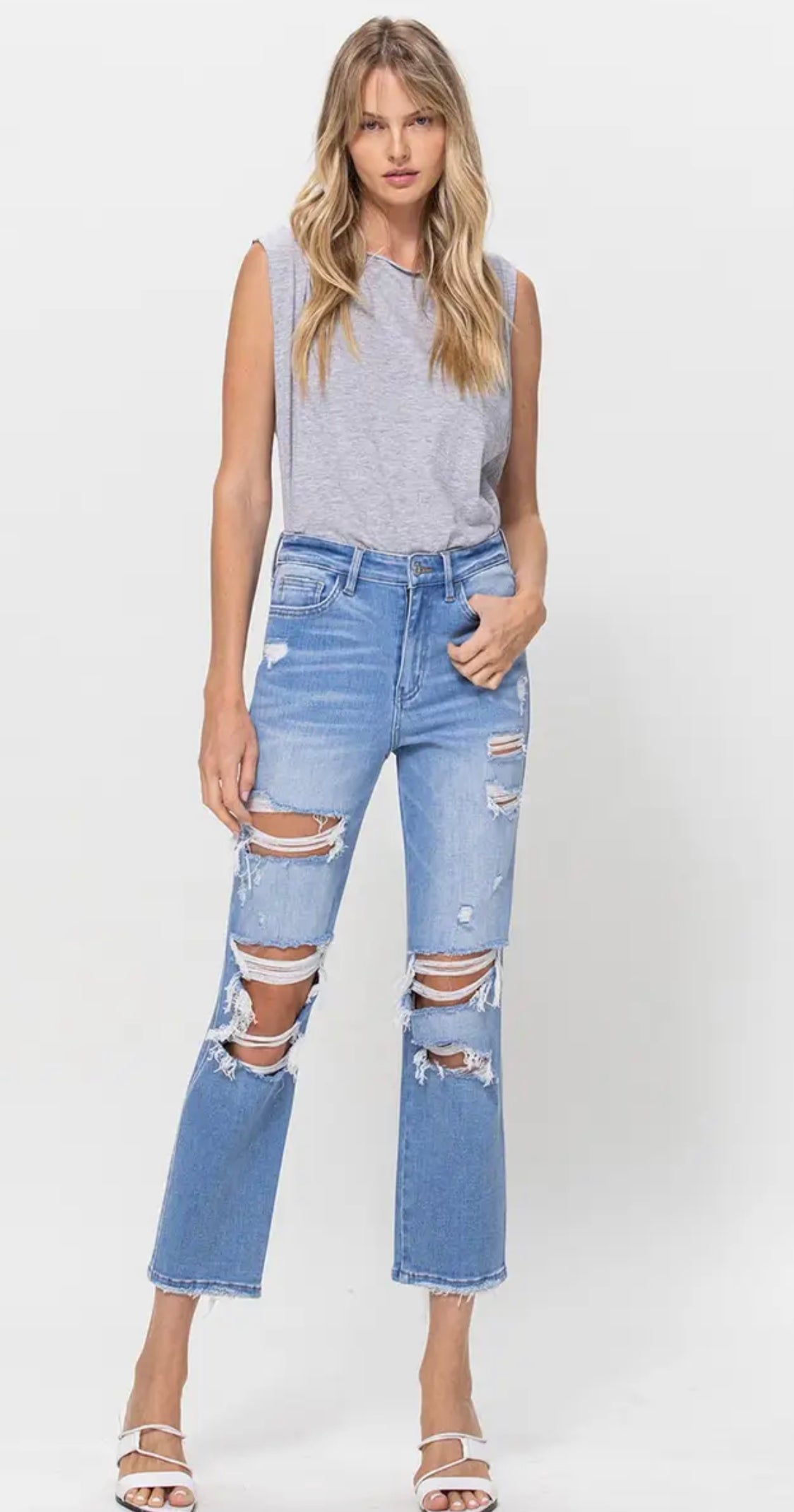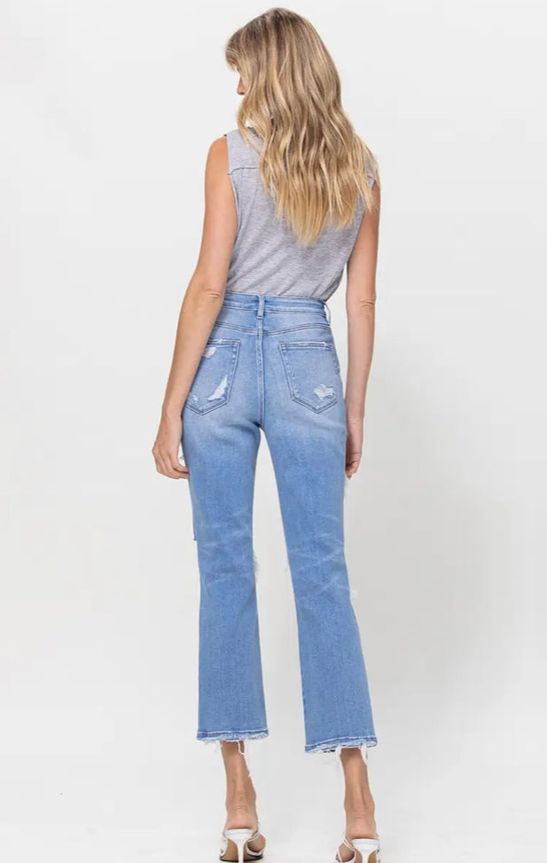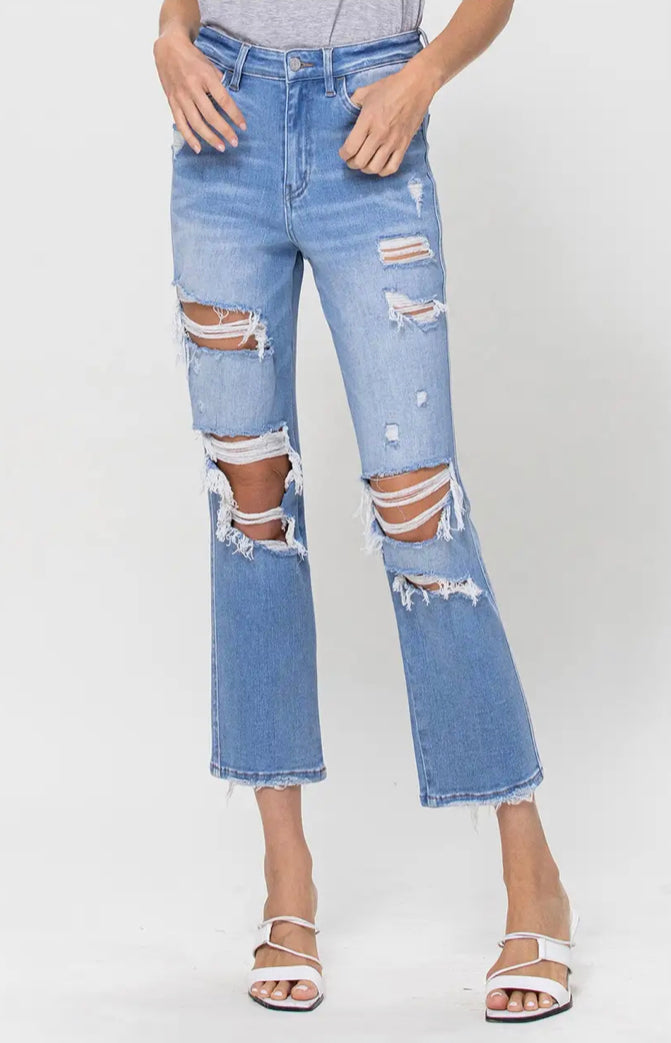 STRETCH SUPER HIGH RISE CROP STRAIGHT (SKU# T5434) - COMFORT STRETCH DENIM, SUPER HIGH RISE, CROPPED LENGTH, DISTRESSED DETAIL F. RISE: 11" / INSEAM: 26'' / LEG OPENING: 15'' 98% COTTON 2% SPANDEX MODEL IS 5' 9'' WEARING SIZE 26