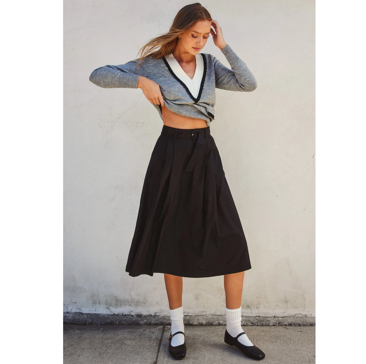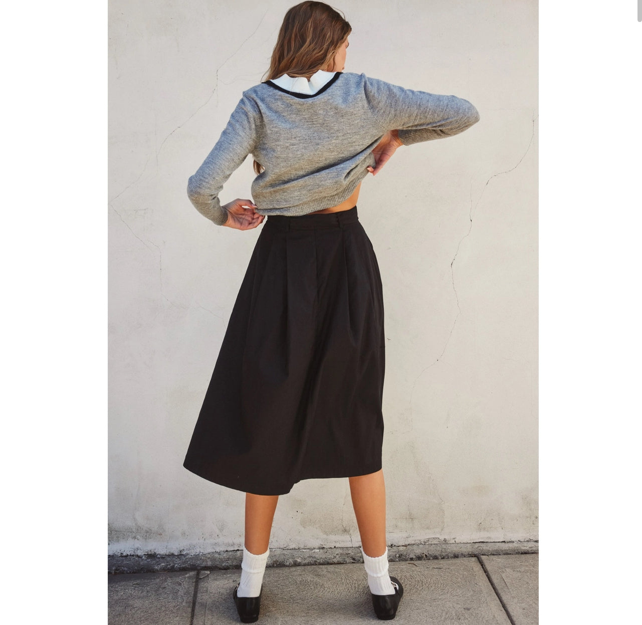 Cotton midi trouser styled skirt. Model is 5'10" and wearing size Small. - Some pleats - Belt loops - Hidden center zipper closures - Side pockets - Lined Shell: 100% Cotton Lining: 65% Polyester, 35% Cotton