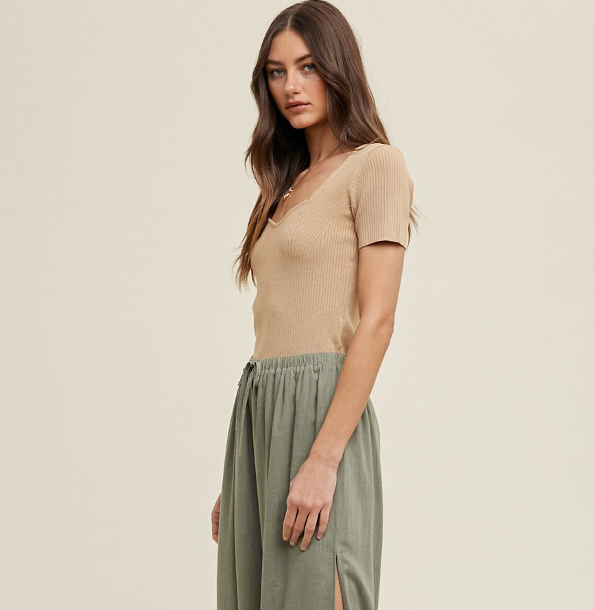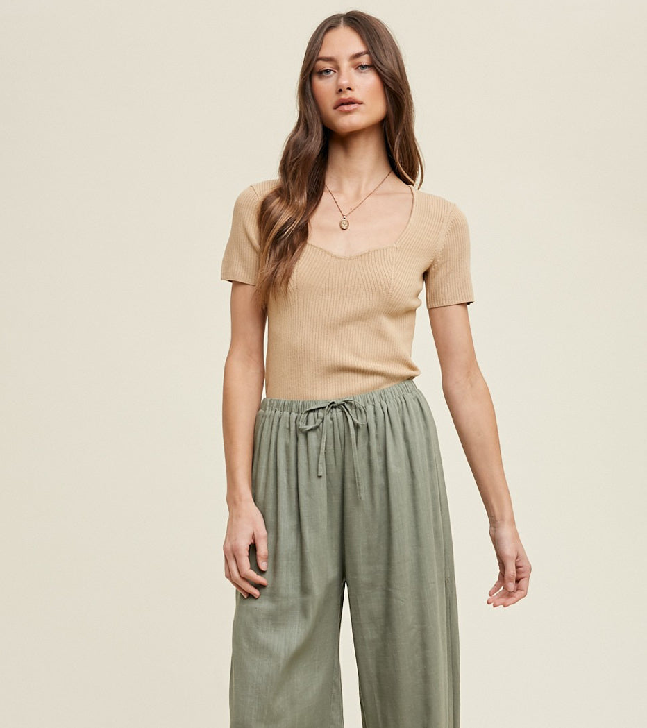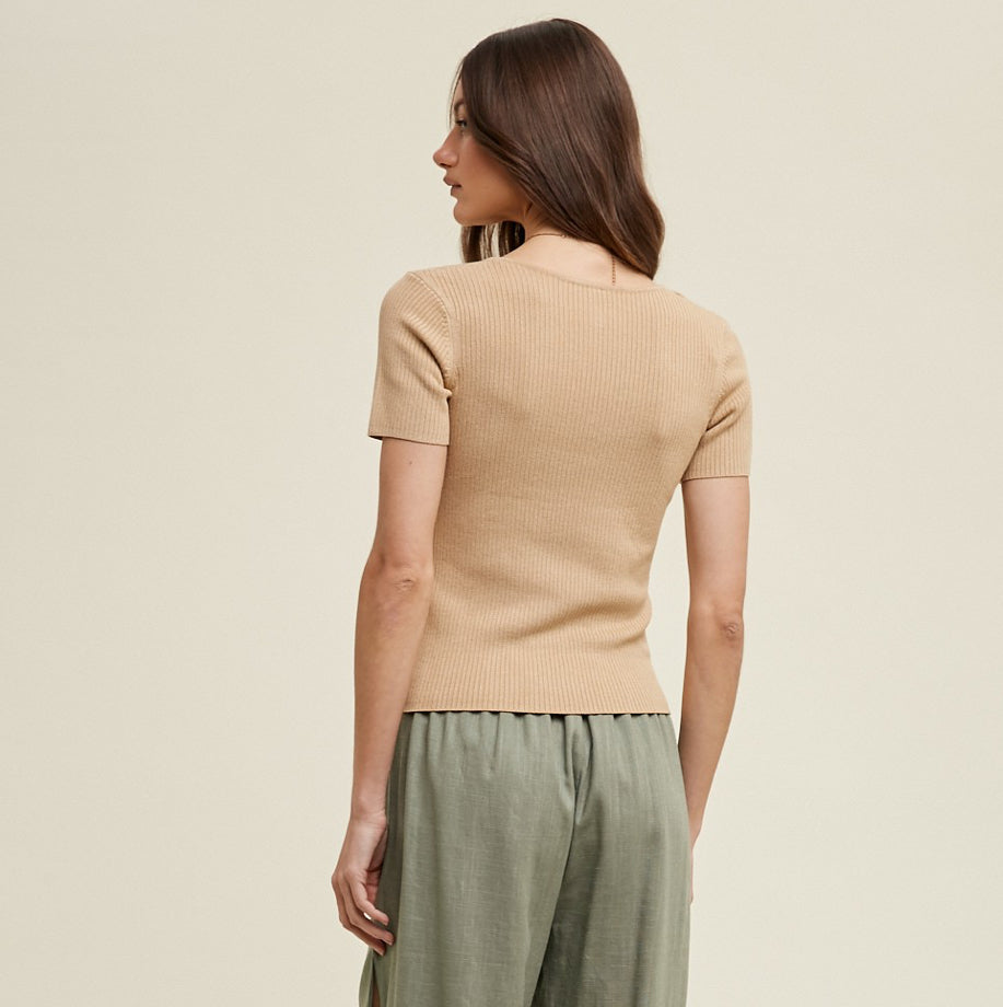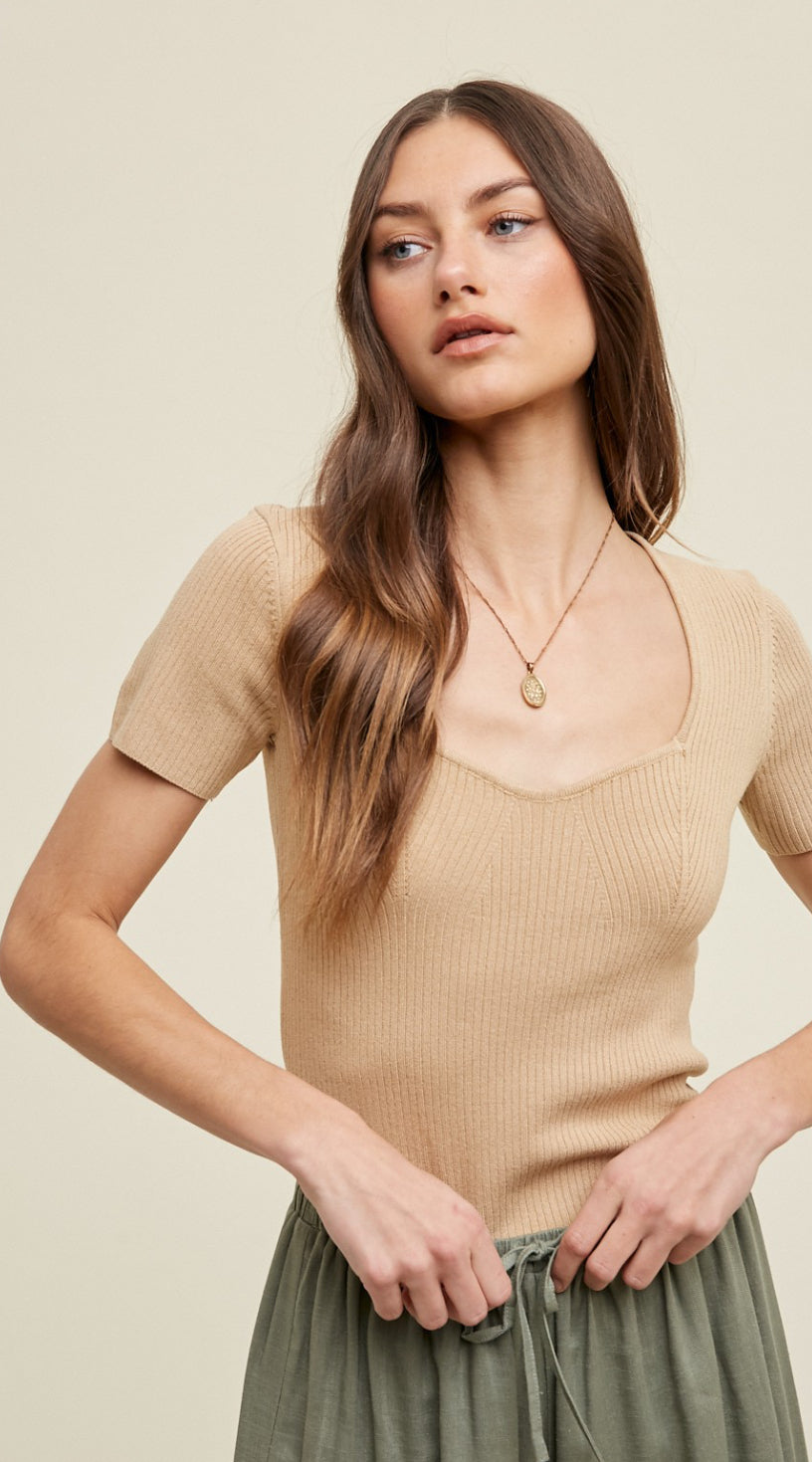 Sweetheart knit short sleeve blouse. Ribbed viscose knit.