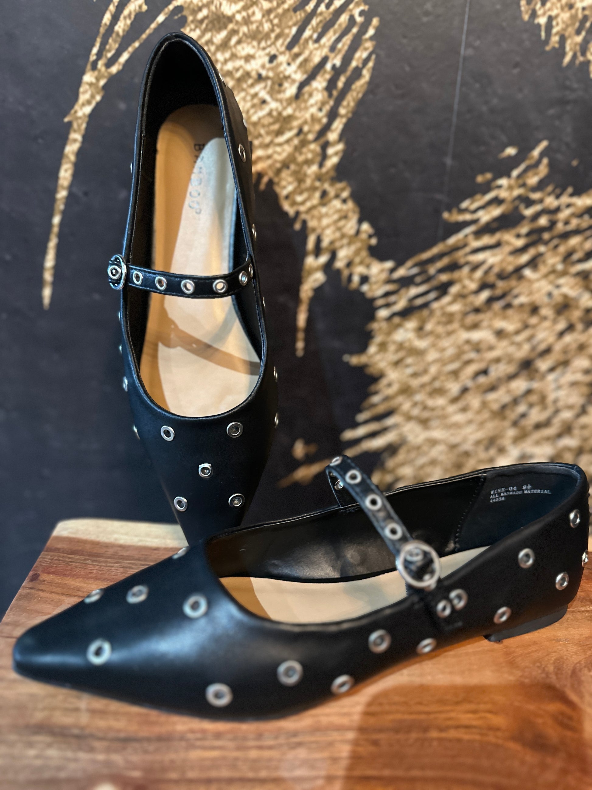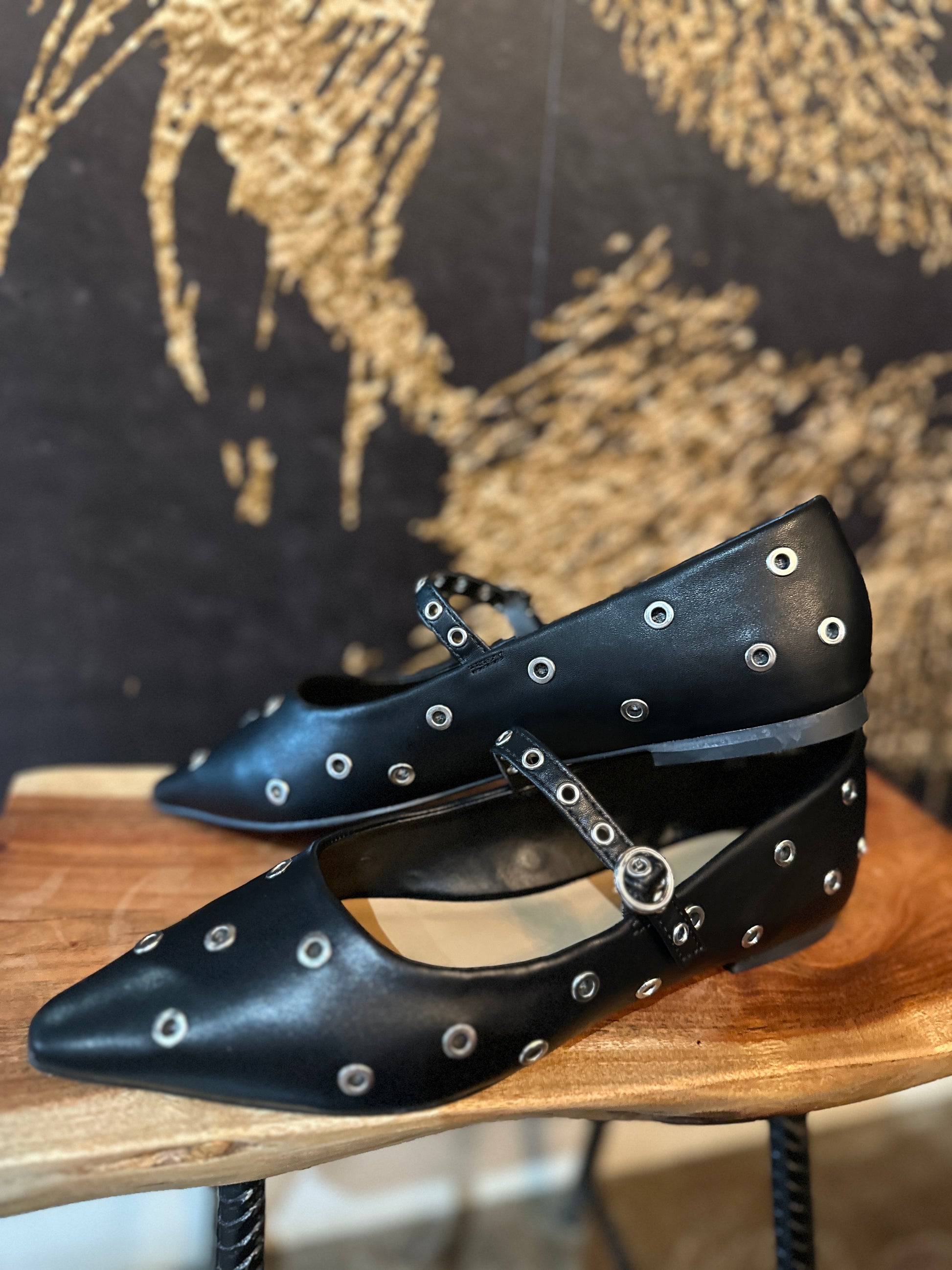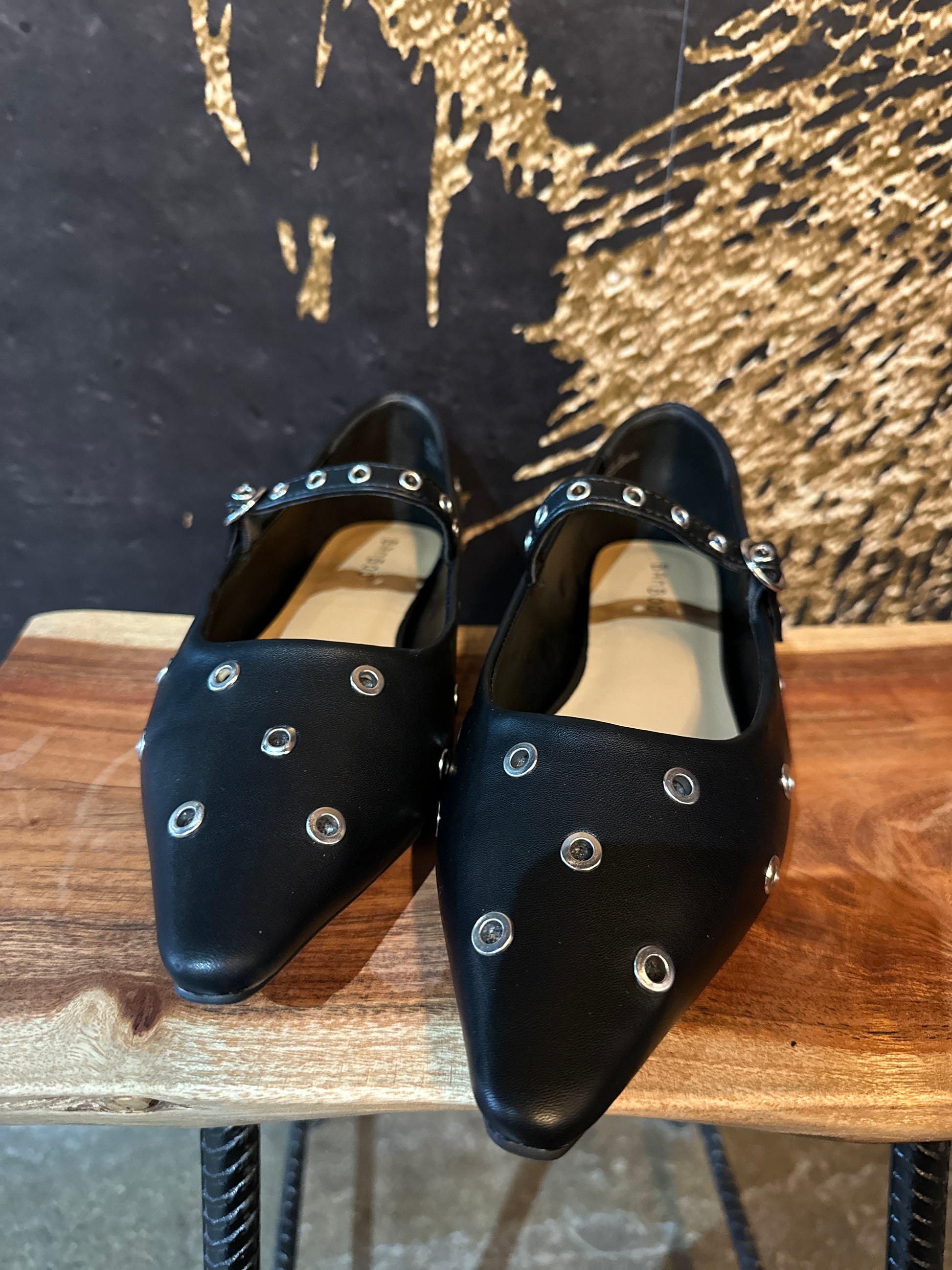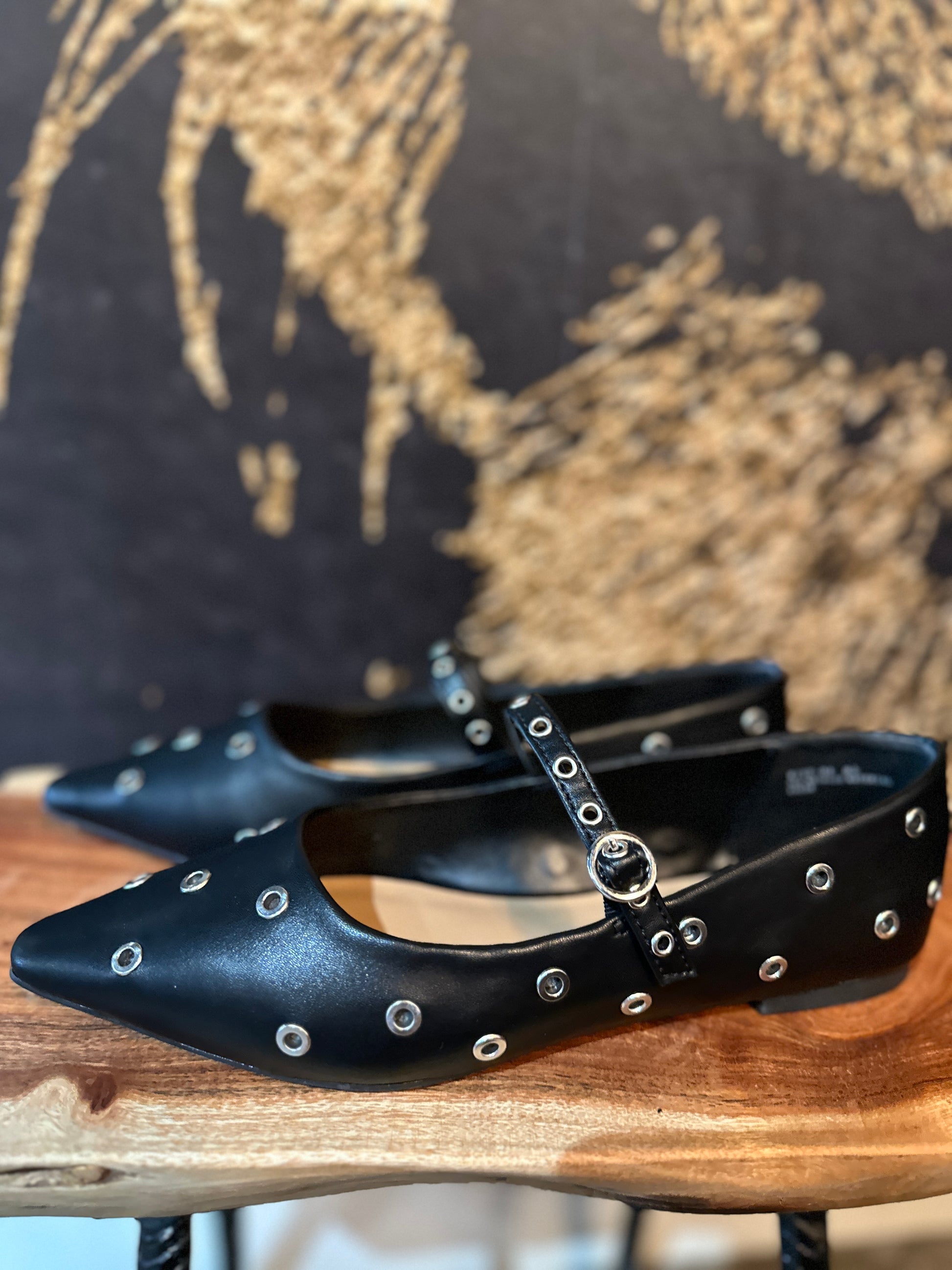 Pointed toe, grommet eyelet ballerina flat with a Mary Jane strap