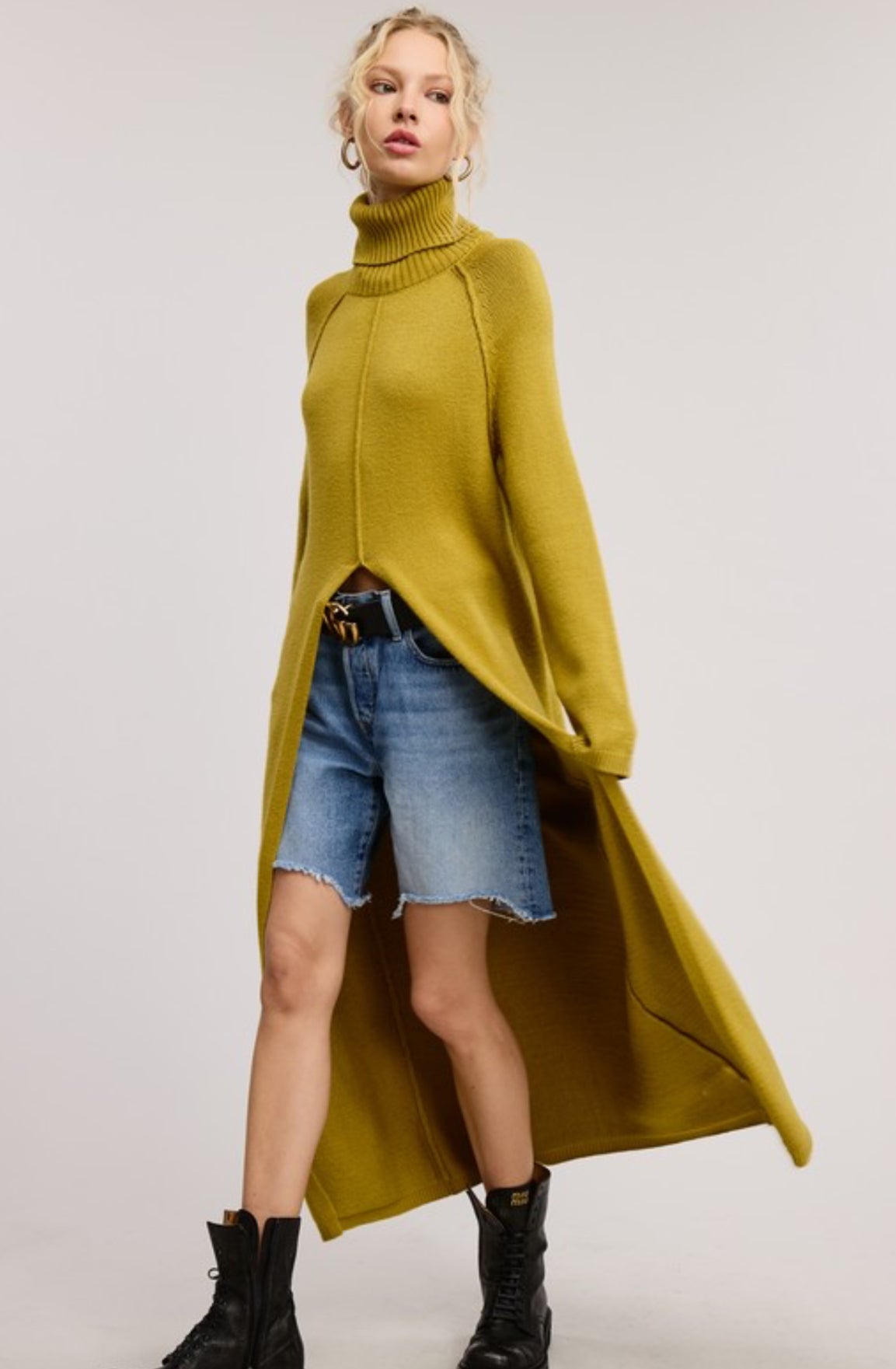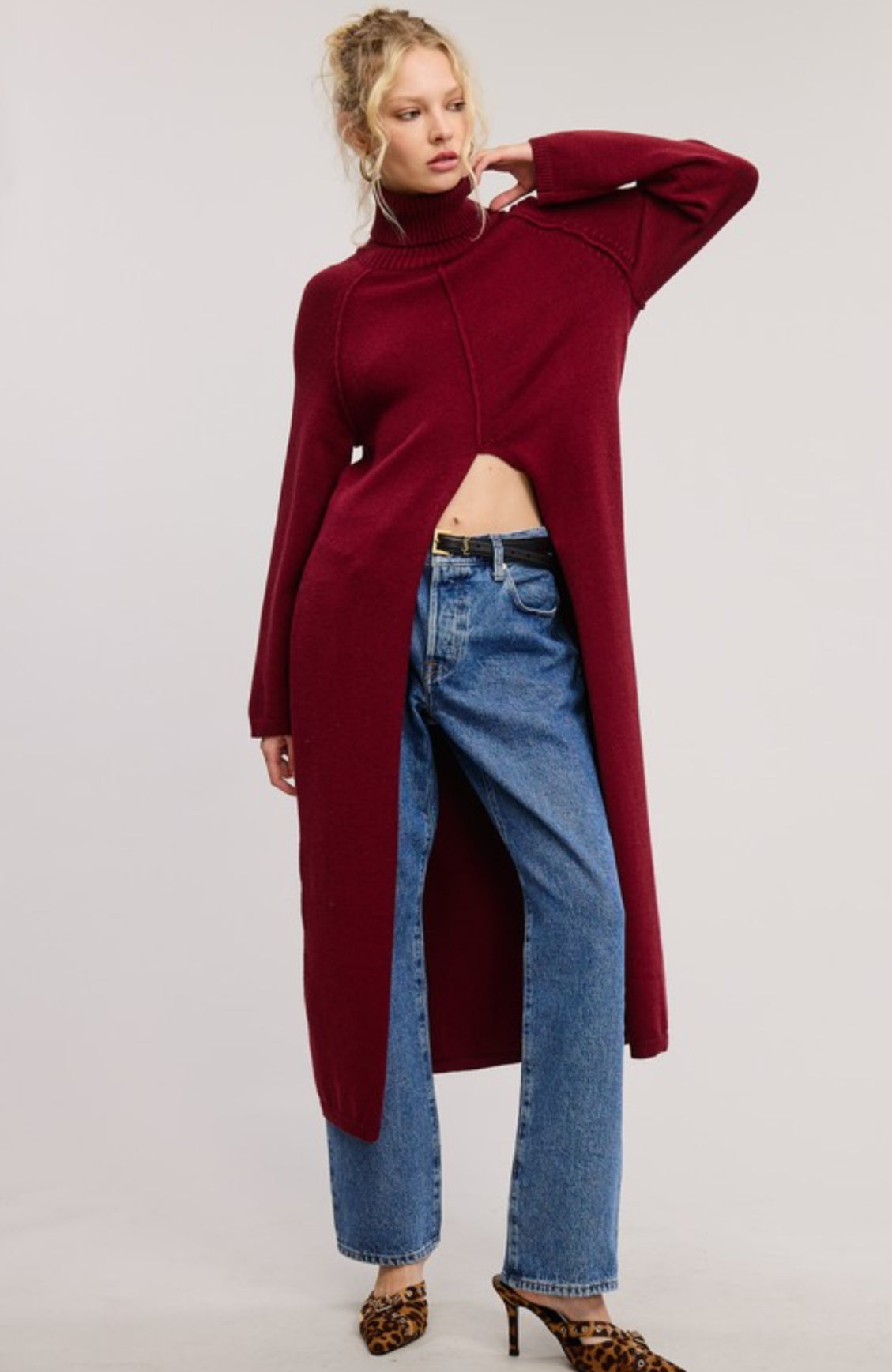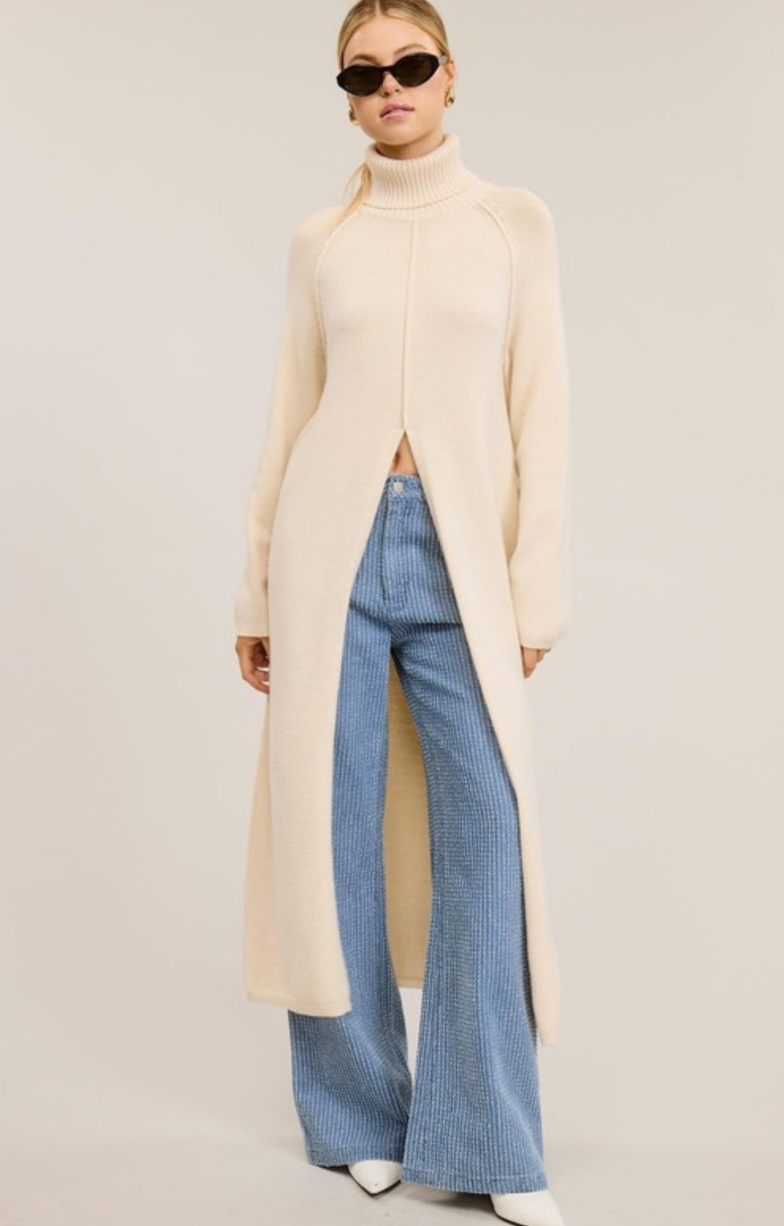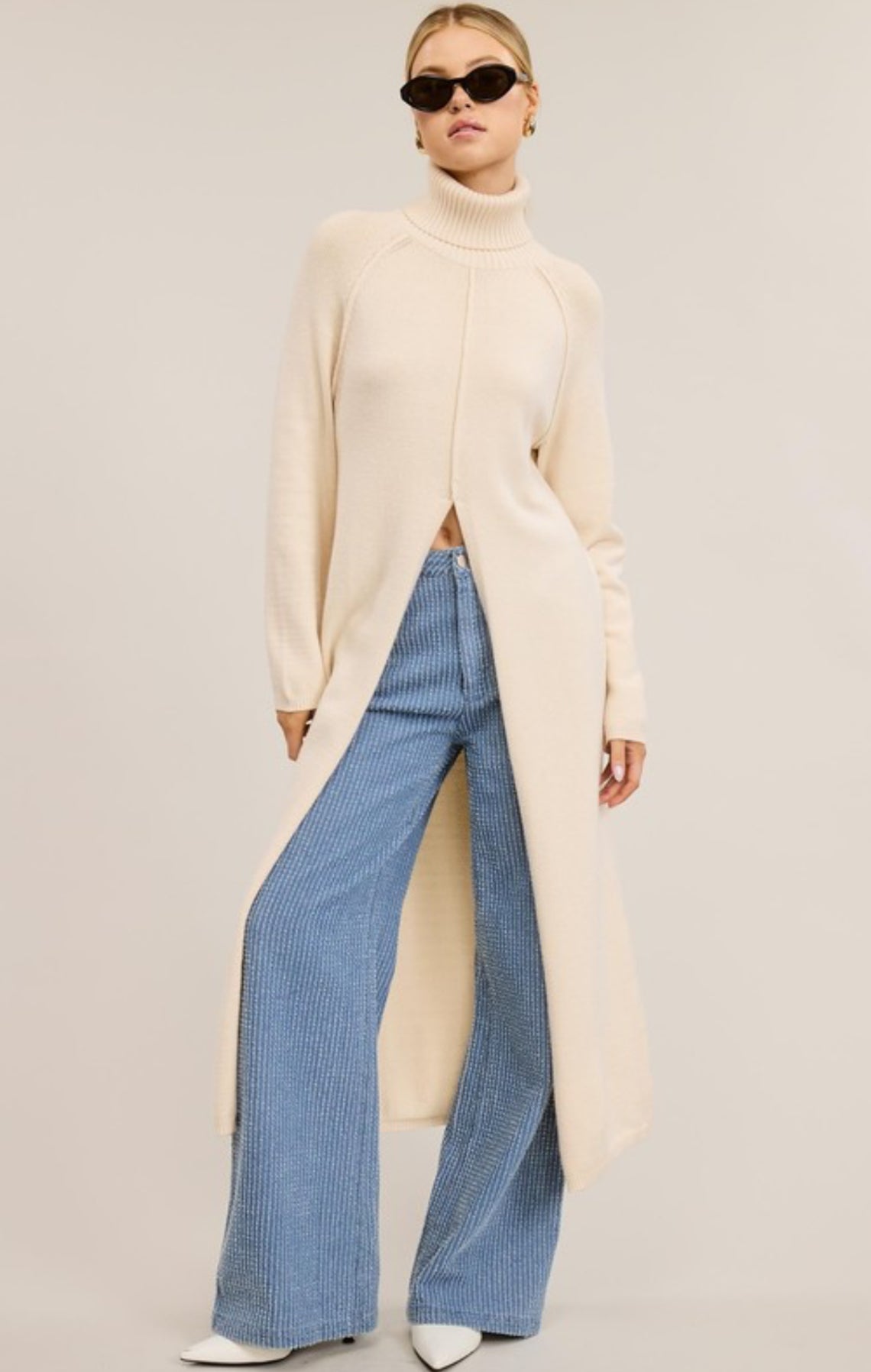 The knit tunic of our dreams in this midi length split front turtleneck. Soft and cozy and makes a statement entering the room…