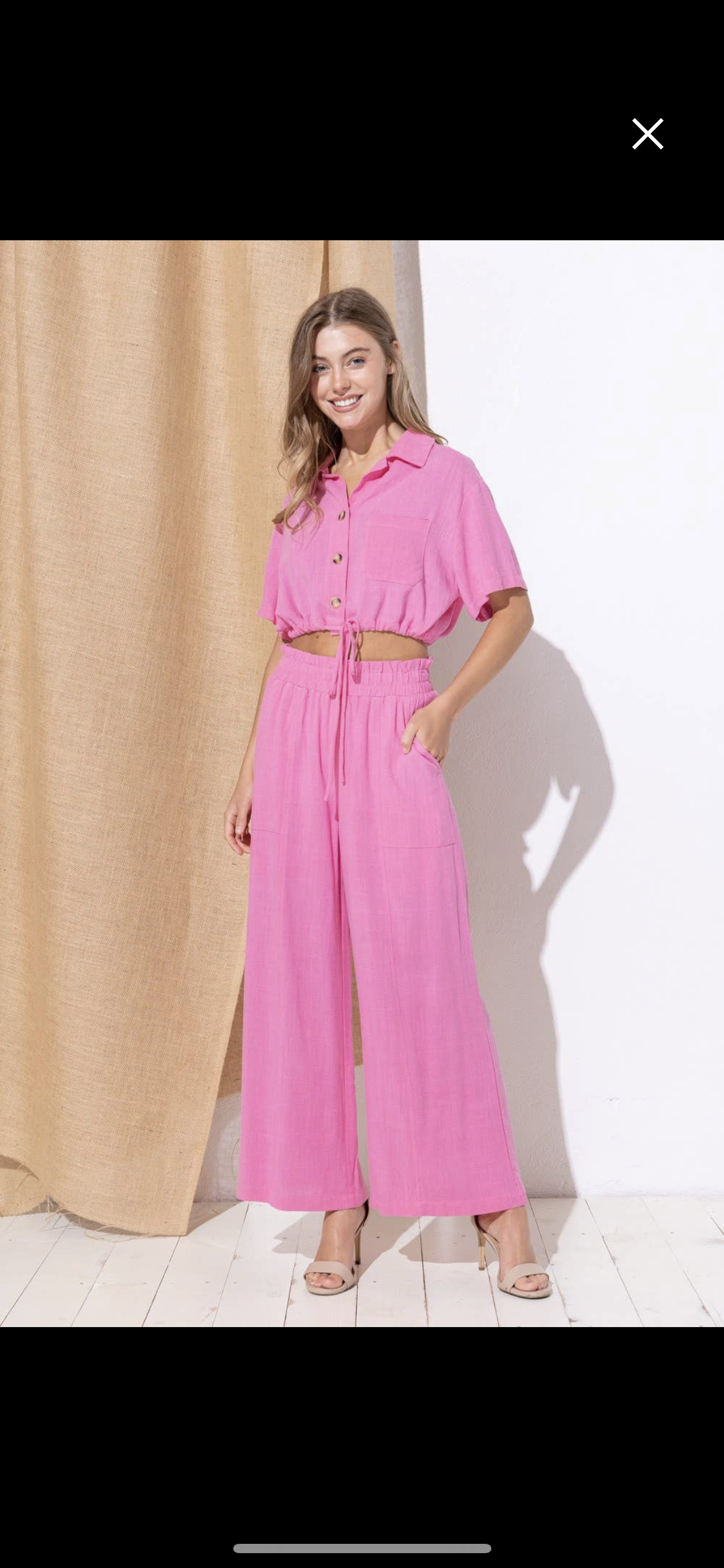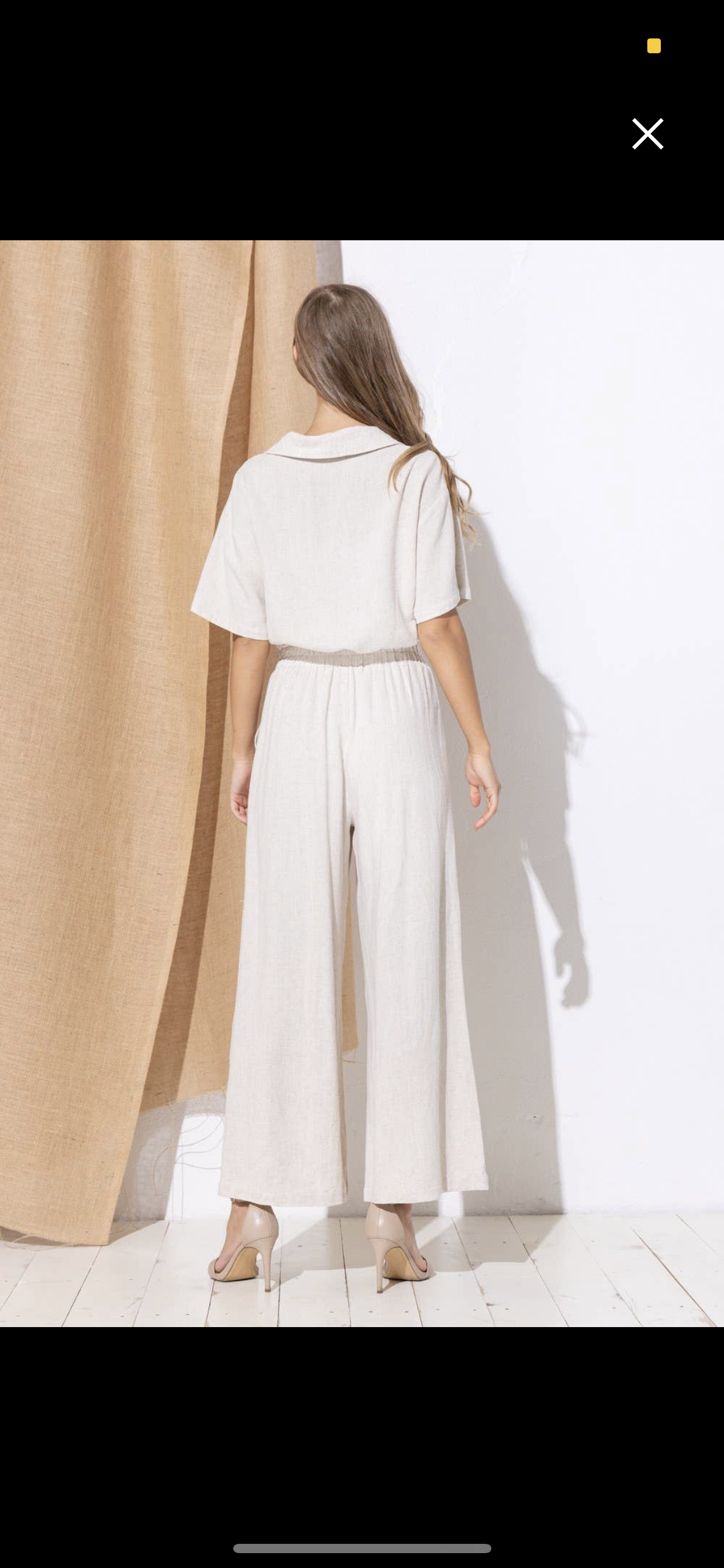 Button down with collar * Cropped length * Waist string * Short sleeve * 70% rayon 30% linen * Available matching set