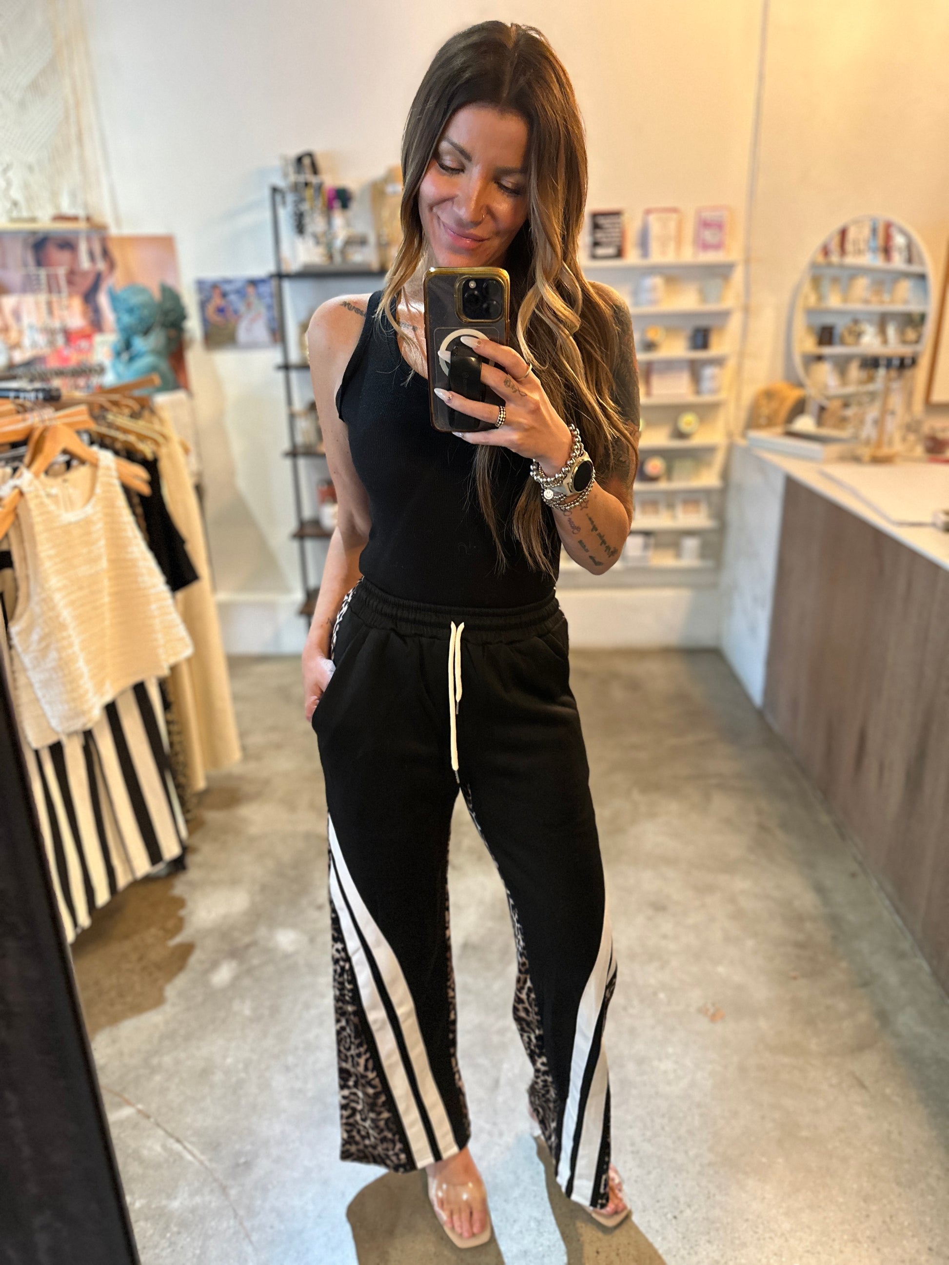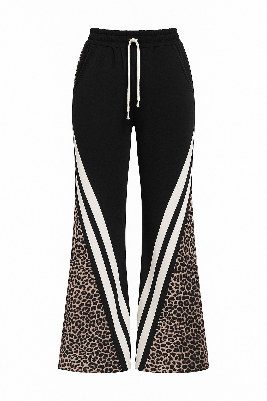 This Leopard Contrast Track Pants are the perfect blend of comfort and bold style. Made from soft velour fleece, these track pants feature an elastic waistband with an adjustable drawstring for a snug fit. The standout detail is the contrasting leopard print panels that run along the sides of the legs, adding a wild and edgy touch to the classic track pant silhouette. White stripe accents further enhance the sporty look, while the wide-leg design offers a relaxed and comfortable fit.