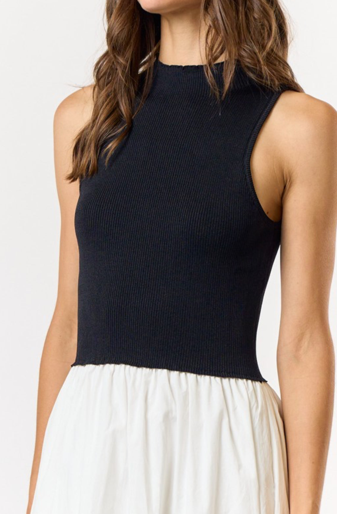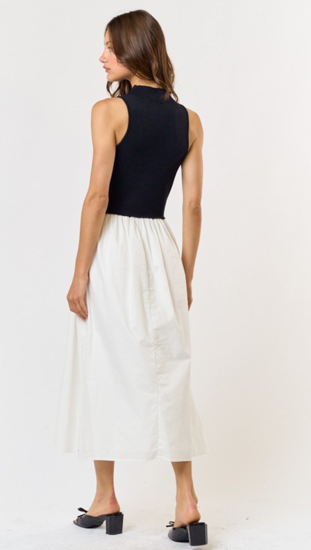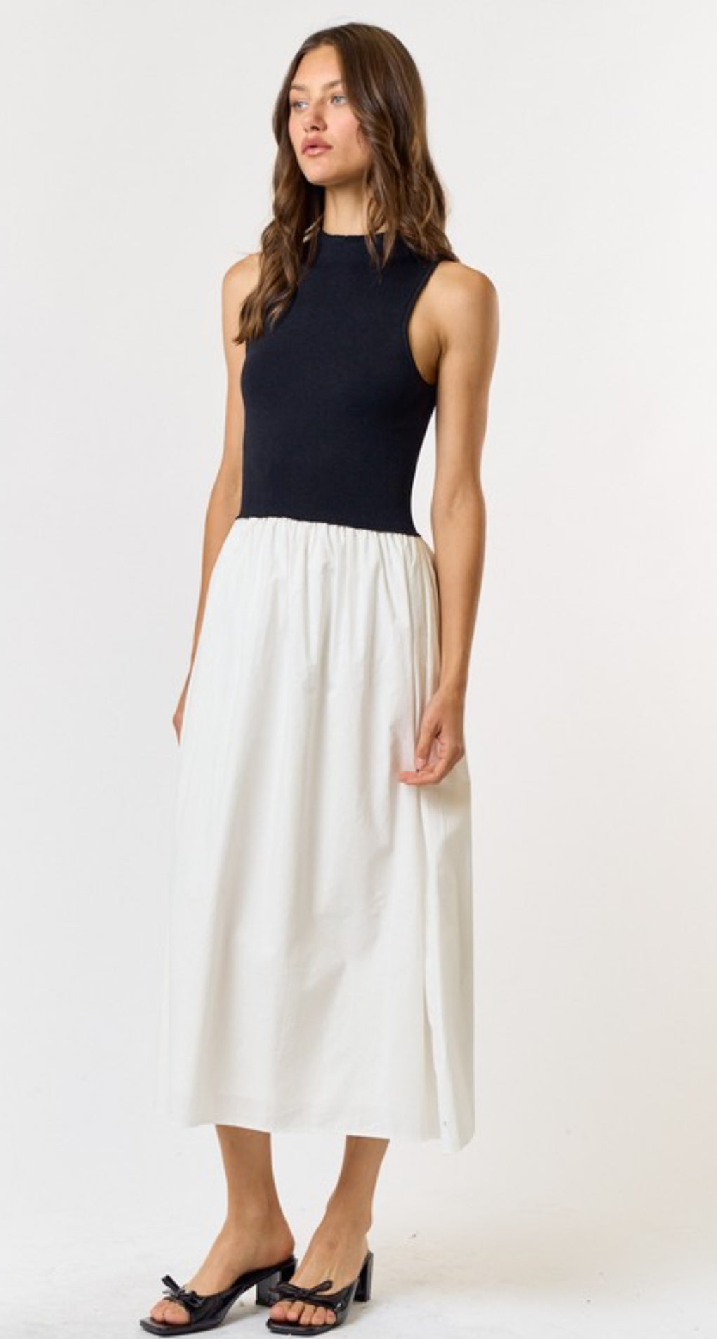 This gorgeous contrast midi dress features a soft stretch knit sleeveless top, with a line cotton poplin skirt,
