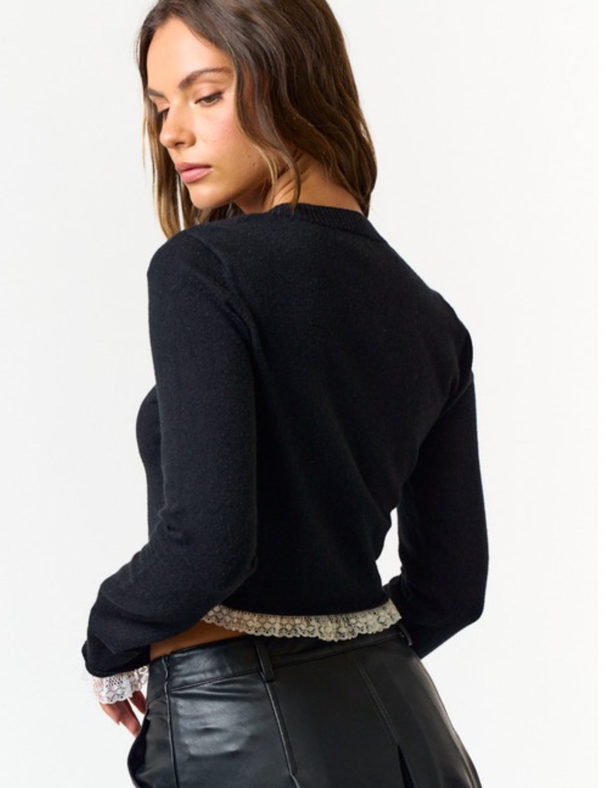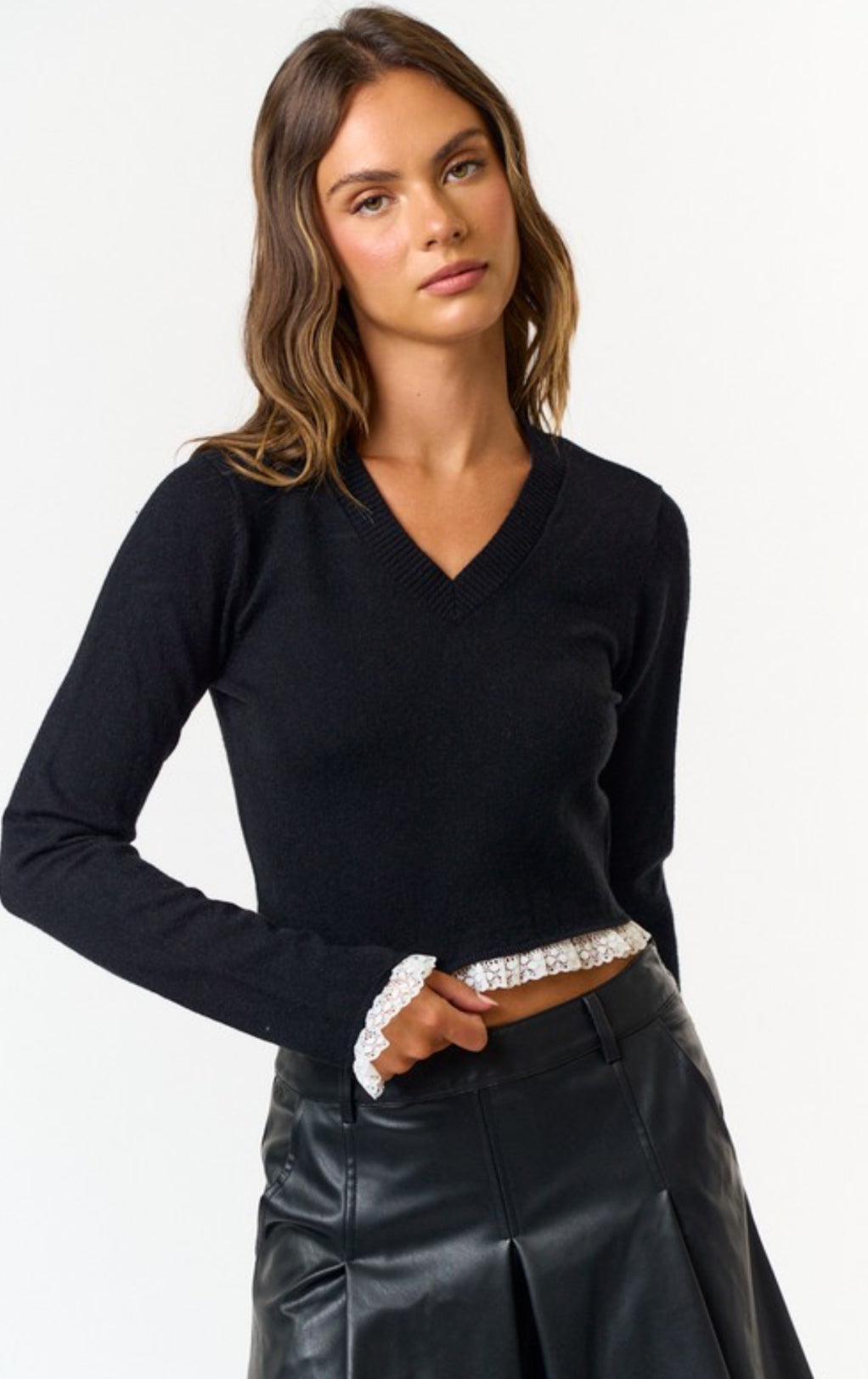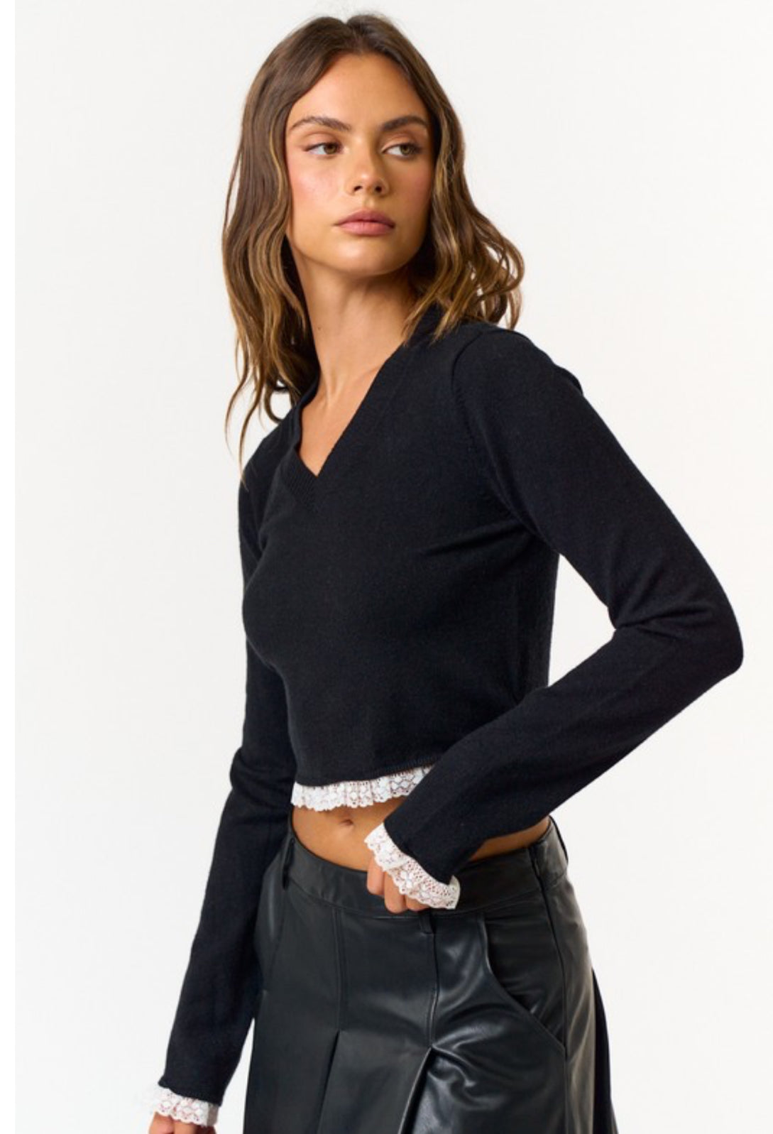 Lightweight and soft V neck cropped sweater, with delicate lace trim.