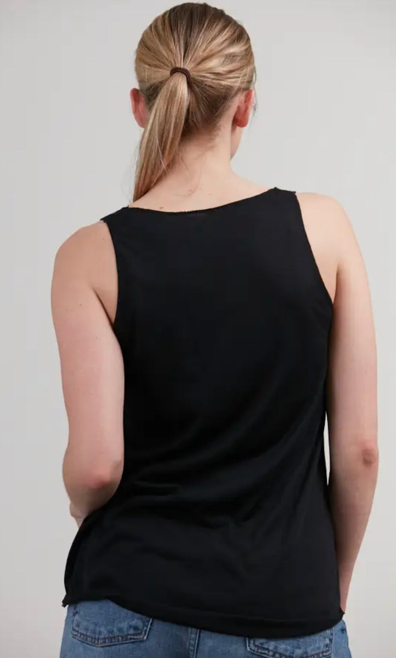 True black color, Lightweight fabric has a cotton-like feel to it and is made of 100% recycled polyester fibers, Scoop neck classic contemporary relaxed fit tank top with dolphin hem, loose fit, Casual wear, everyday top, machine wash, Imported, perfect companion for all sporty activities like yoga and summer outings