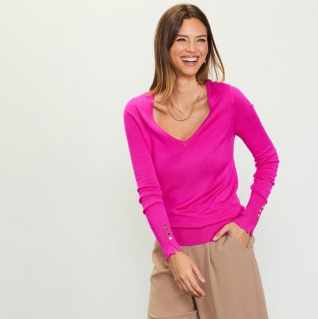 Soft and lightweight knit pullover featuring a c neckline and button trimmed cuffs for an elevated touch. A Paperdoll fall essential!