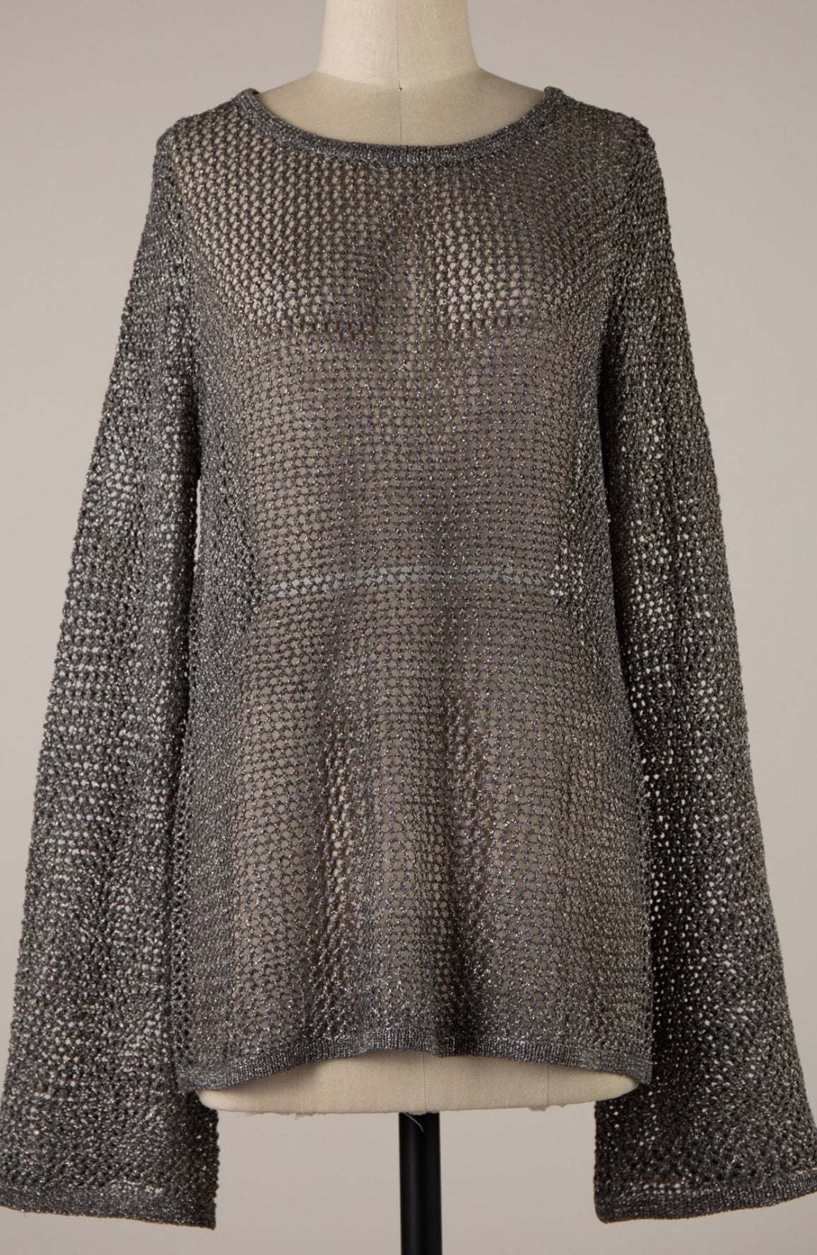 Beautiful open knit metallic sweater, featured doled threads in a deep charcoal color, wide crew neck and bell sleeves. Sheer and subtly oversized. Material: poly blend.