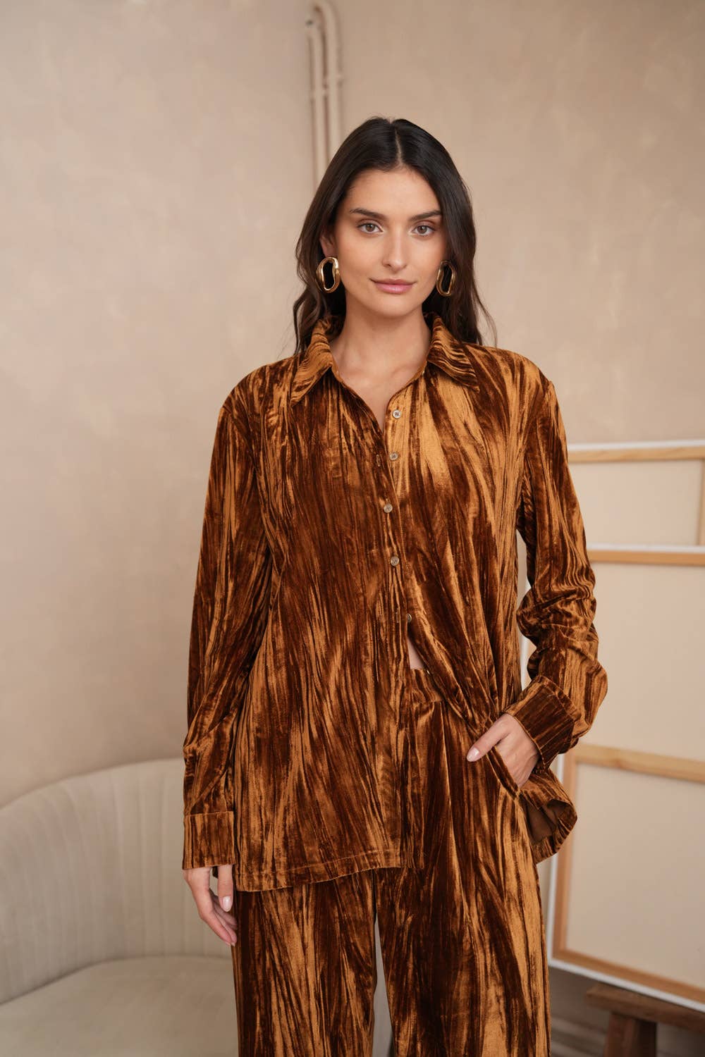 Crumpled velvet oversized shirt: - long sleeves - oversized fit - front buttons