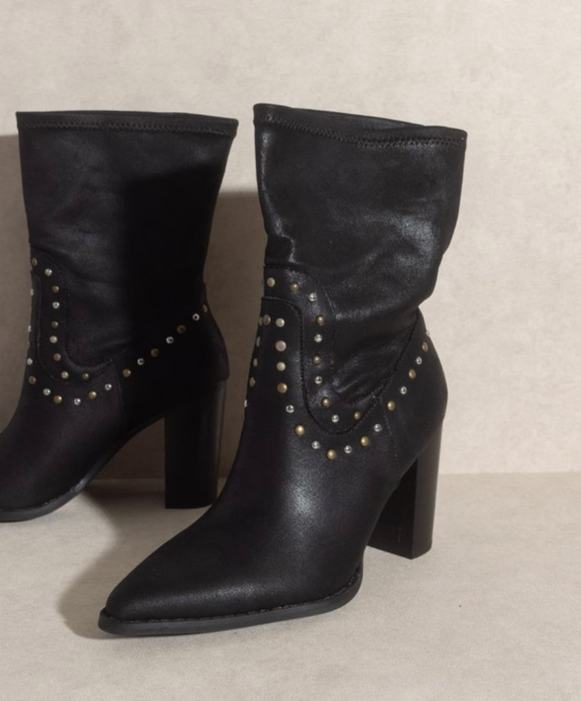 This Parisian style western boot features two tone stud embellishments, padded insole with genuine leather heel wrap/