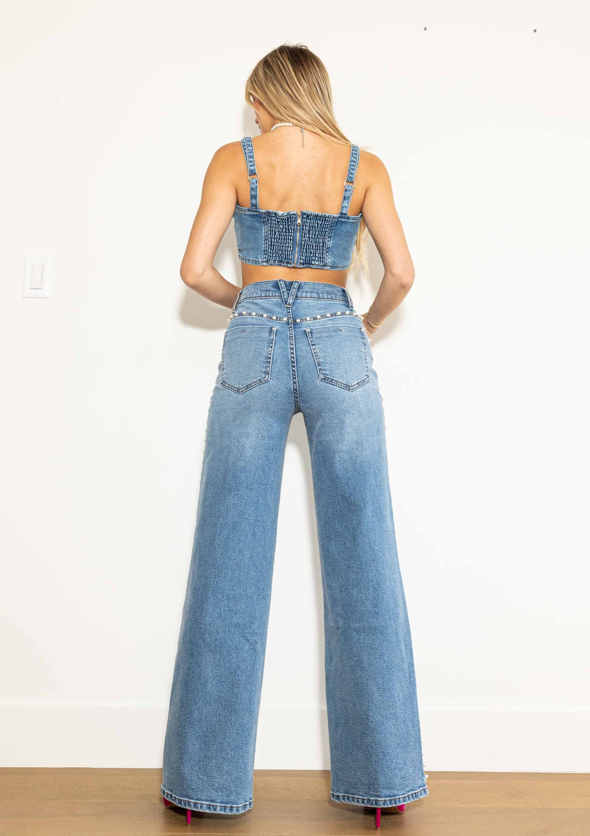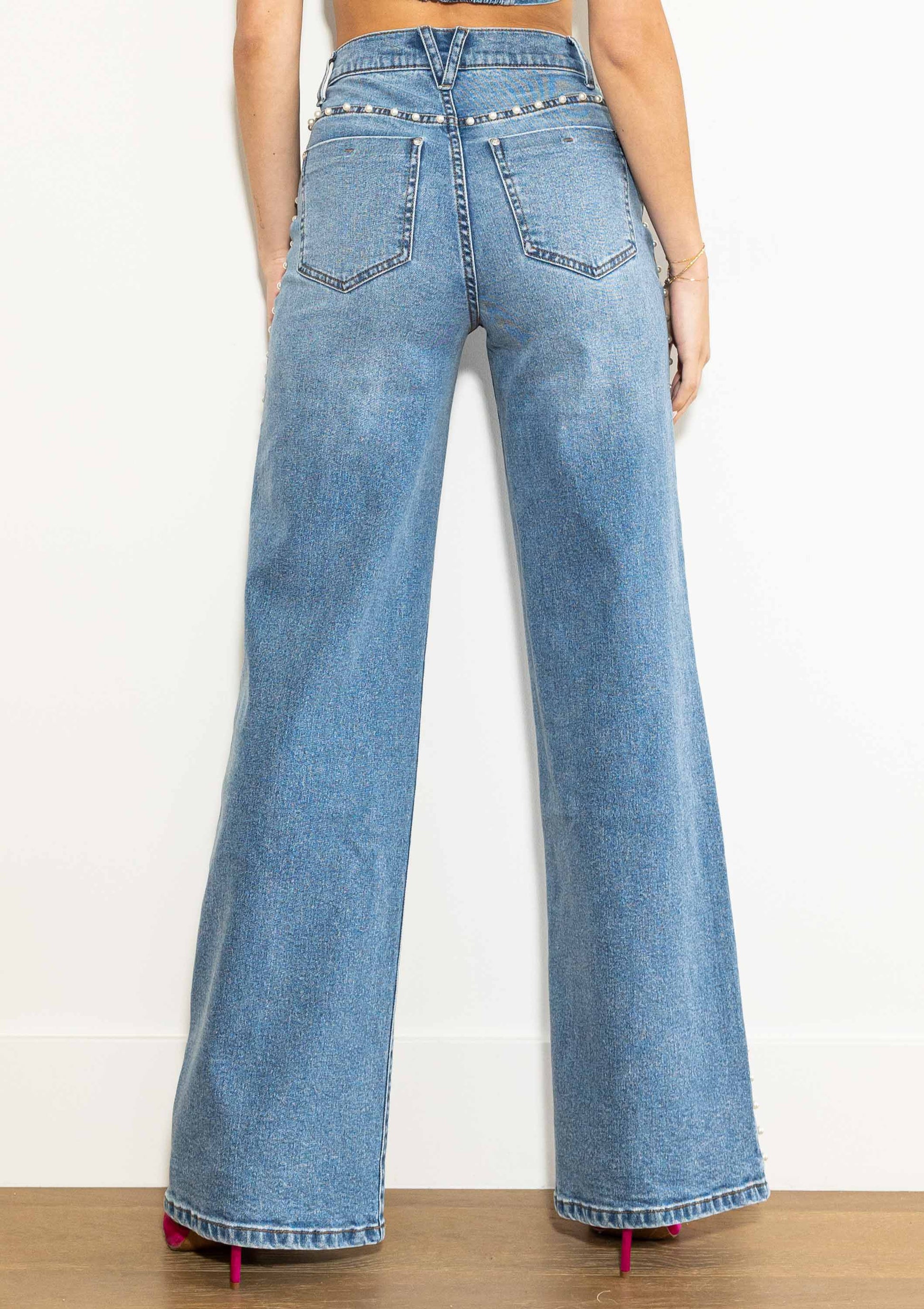 A pair of high-rise wideleg jeans featuring wide pearl stud detail, a 5-Pocket construction and zip-fly closure.