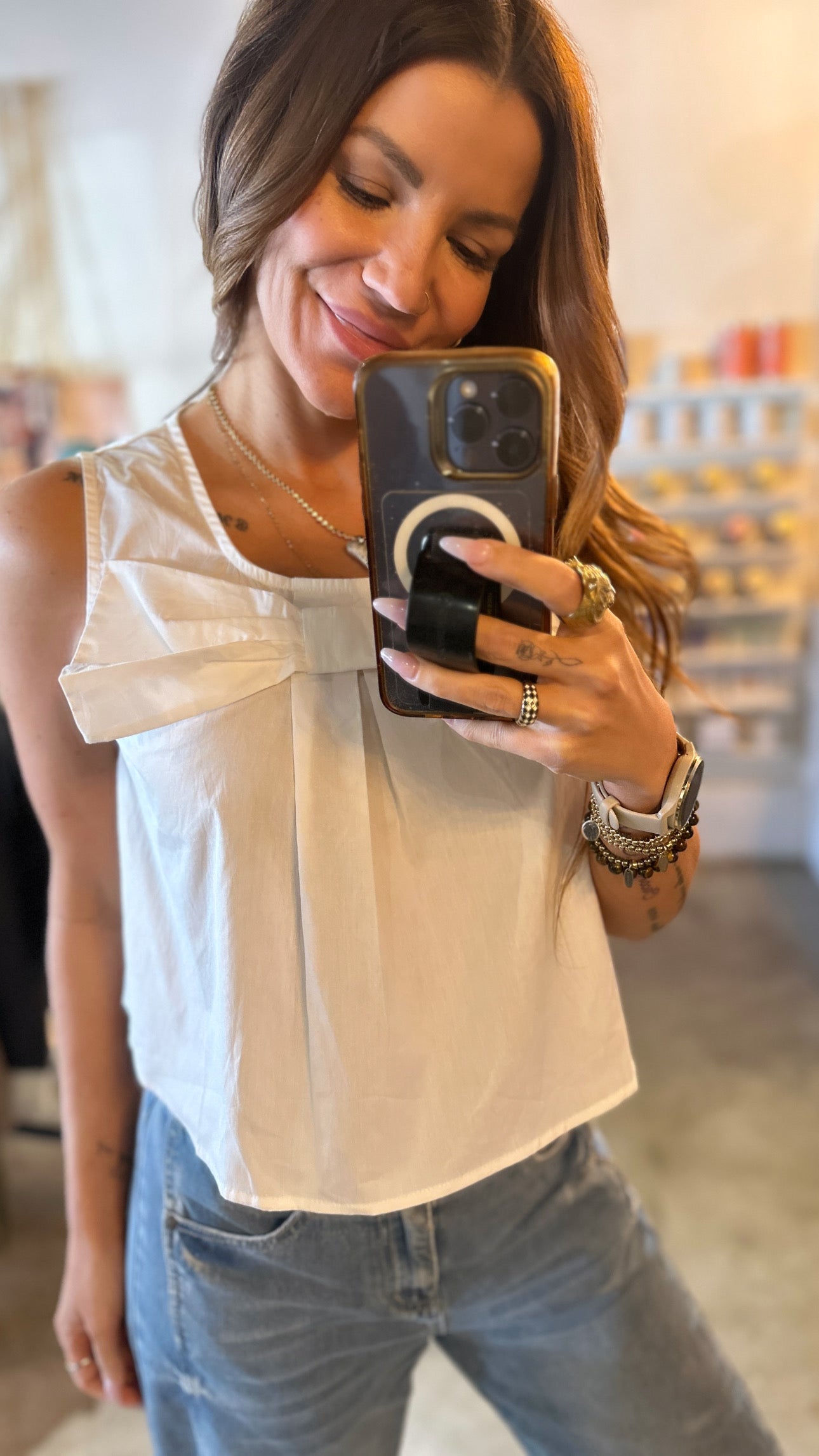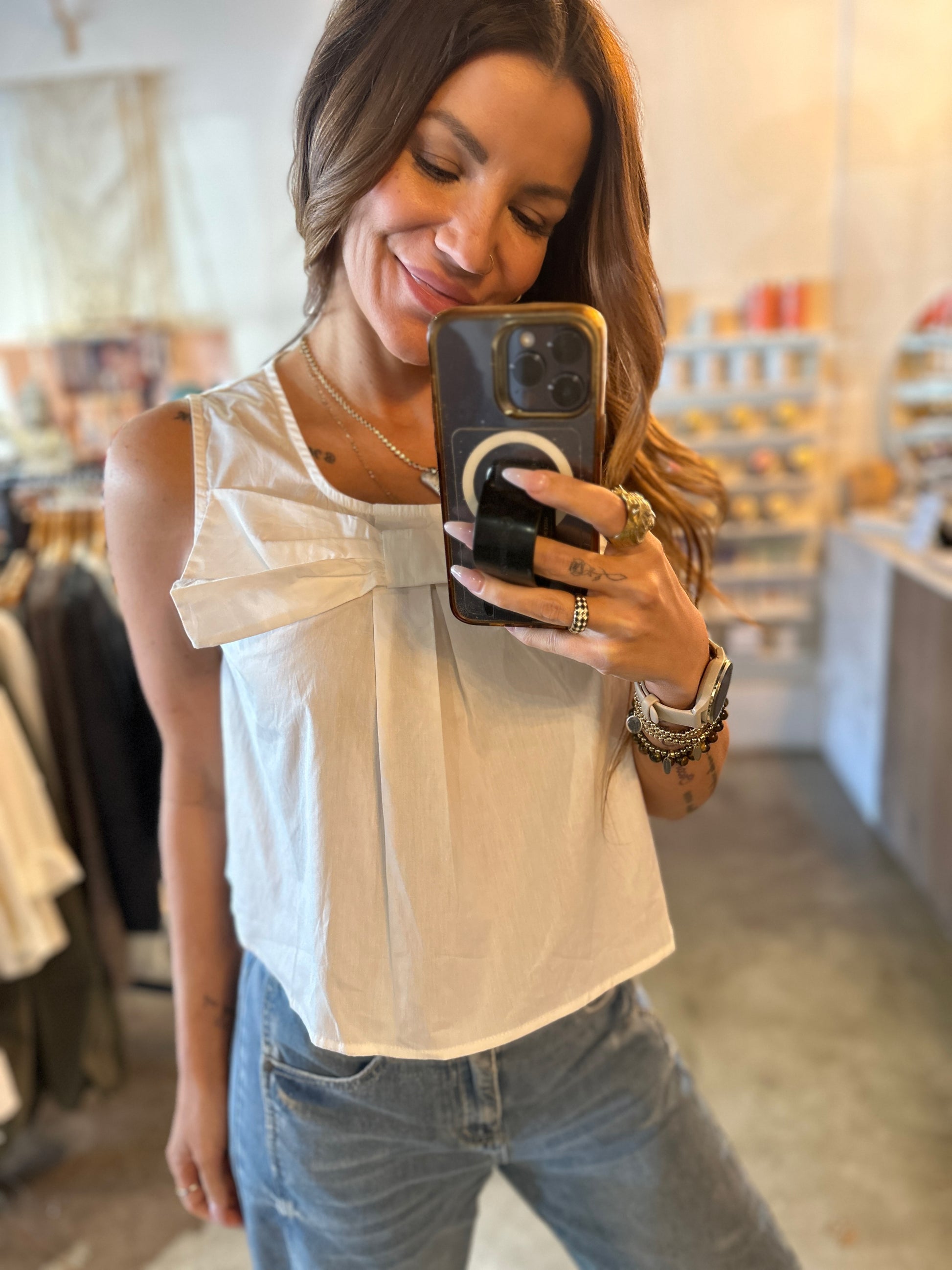A-line sleeveless bow front top made from a light and crisp cotton poplin. Pairs perfectly with your fave denim!