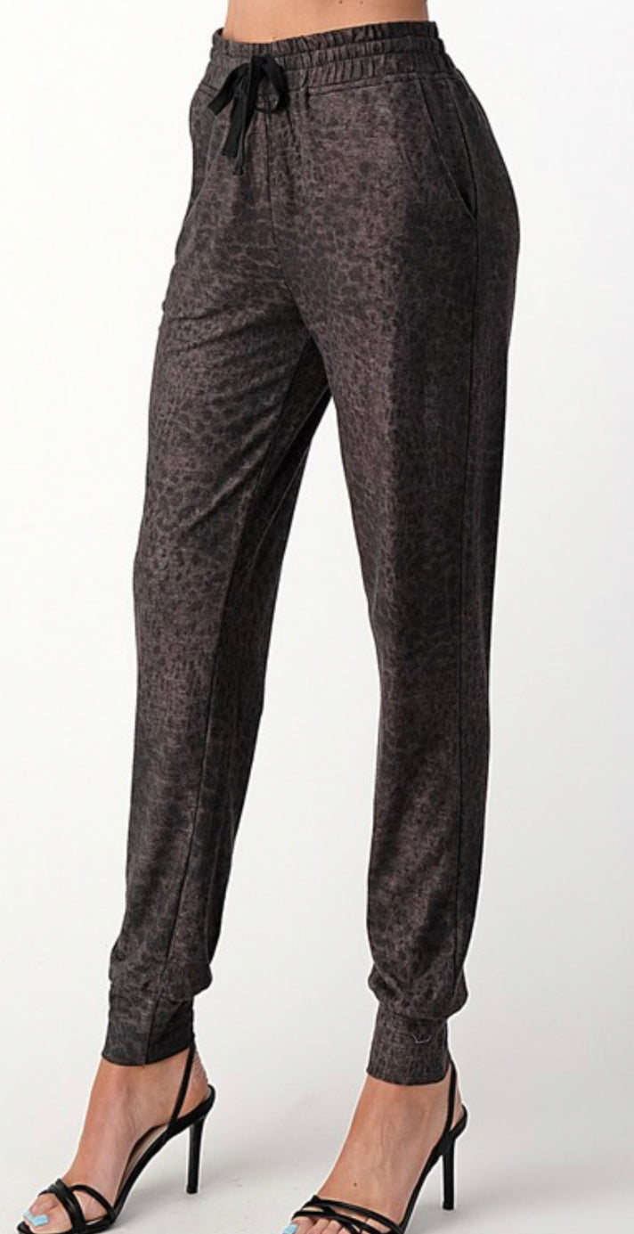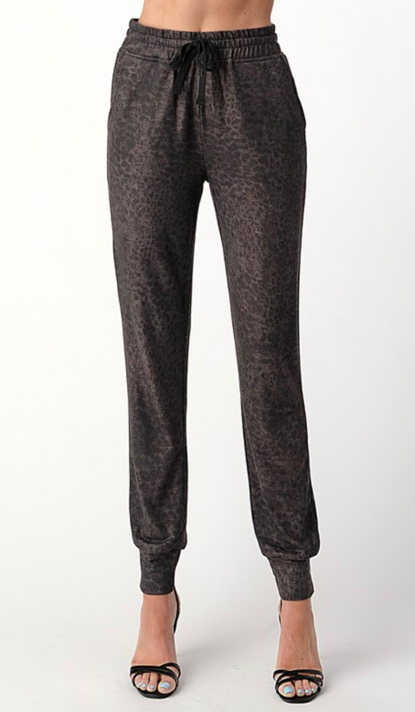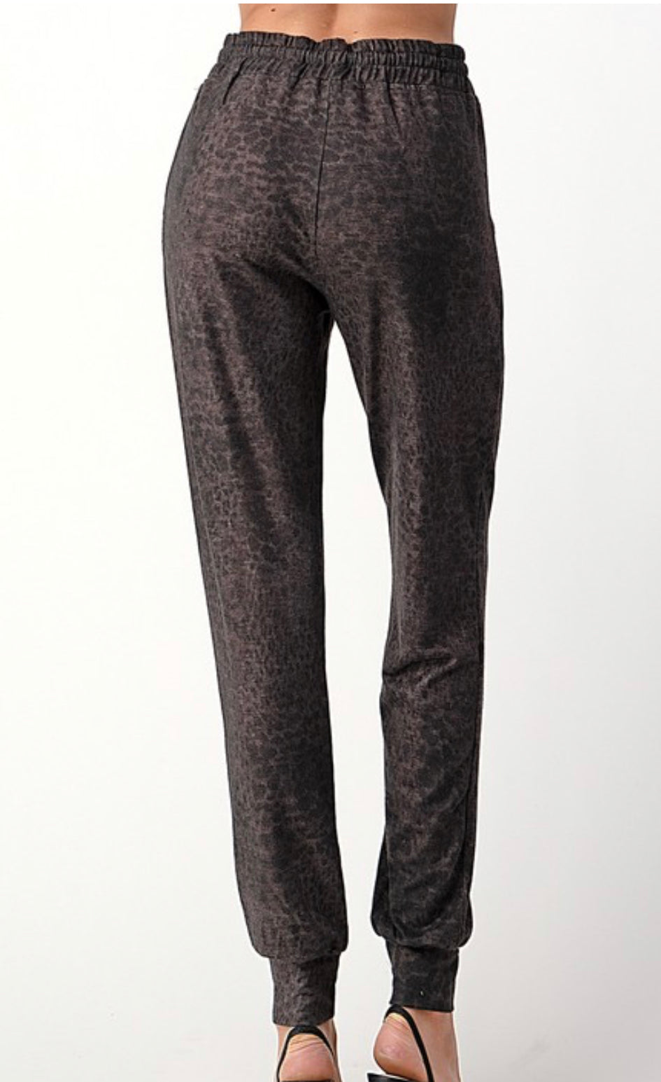 Lightweight leopard knit jogger with drawstring, elastic waist and cuffed gems. Easily dressed up and fit true to size.