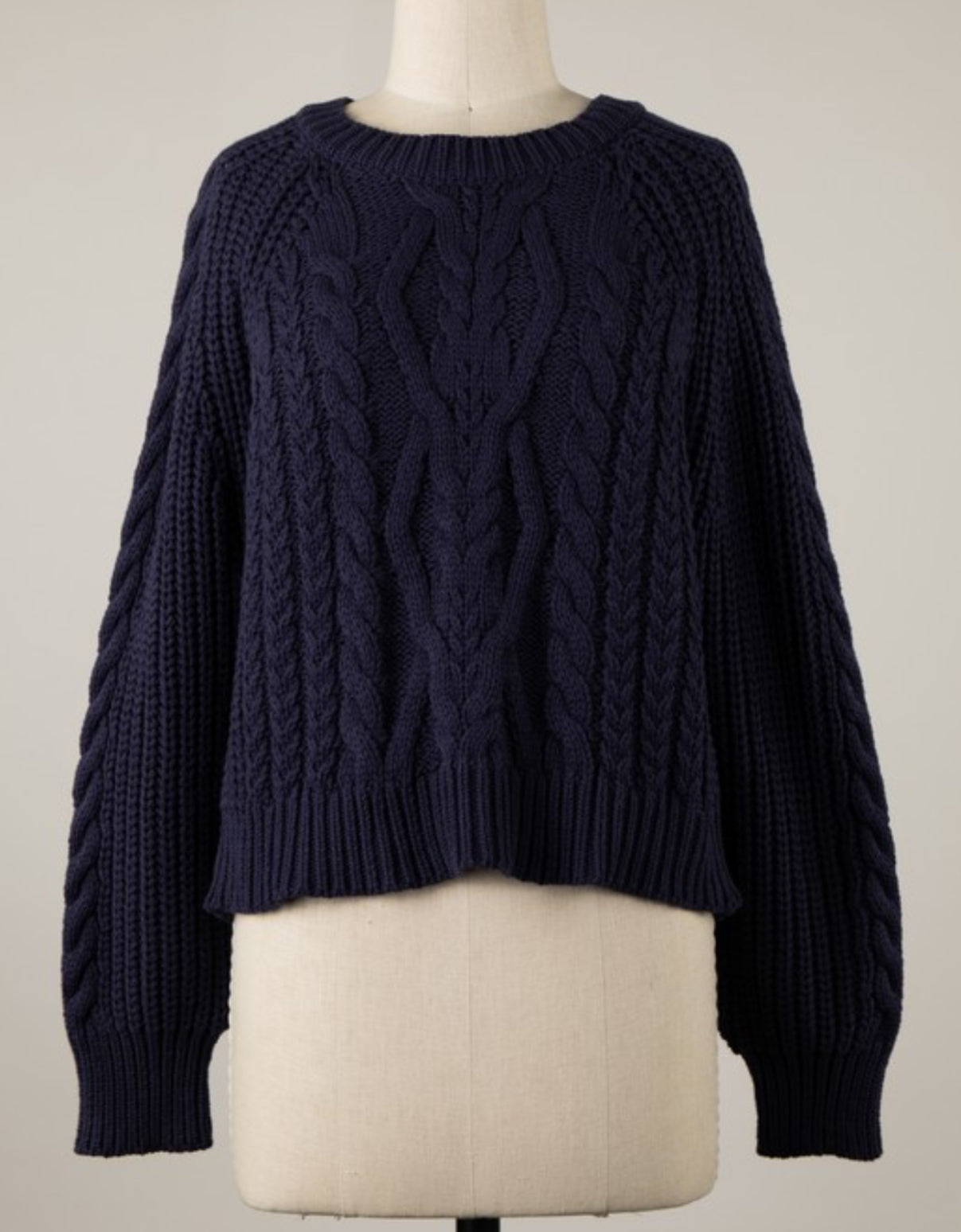 Our core sweater brand introduces this cable knit crop. The perfect essential sweater cropped at hip, not intended to show tummy.